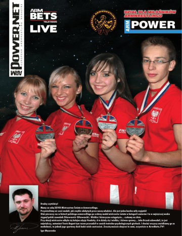 Drodzy czytelnicy! Mamy za sobą XXVIII Mistrzostwa Świata w Armwrestlingu. Przywieźliśmy aż sześć medali, jak zwykle zdobytych przez naszą młodzież. Ale jest jeden bardzo miły wyjątek! Otóż pierwszy raz w historii polskiego armwrestlingu po srebrny medal mistrzostw świata w kategorii seniorów i to w najcięższej wadze sięgnął polski zawodnik Sławomir Głowacki. Wielkie i historyczne osiągnięcie... czekamy na złoto. Przy okazji mistrzostw odbyła się kolejna edycja Vendetty. A tu działy się i wielkie, i dziwne sprawy... John Brzenk udowodnił, że jest największy, natomiast Travis Bagent tym razem przesadził w swoich teatralno-psychologicznych gierkach. I chociaż wszyscy uwielbiamy go za medialność, to jednak jego sportowy duch budzi wiele zastrzeżeń. Zresztą możecie obejrzeć to sami, oczywiście w ArmBets.TV! Igor Mazurenko Długo się zastanawiałem jak rozpocząć relację z tegorocznych, XXVIII Mistrzostw Świata w Armwrestlingu. Jako głowa ekipy ArmBets.TV mogłem wejść i zajrzeć wszędzie. Także wiele wywiadów i prywatnych rozmów z zawodnikami, sędziami, czy władzami WAF dały mi pełny obraz tego wydarzenia. W jednej sprawie wszyscy byli zgodni. Były to bardzo słabo zorganizowane zawody. Brytyjska federacja z Neilem Pickupem nie podołała temu zadaniu. Największe zastrzeżenia budził system rozpisywania walk. „Wróciliśmy do prehistorii” – skomentował sędzia główny zawodów Michel Kieth. Zawodnicy byli rozpisani na zwykłych arkuszach papieru w linie, łączeni za pomocą rysowanych długopisem klamer. Wszyscy kręcili głowami z niedowierzaniem. Nic dziwnego, że przy tak chaotycznym prowadzeniu skrzywdzono kilku zawodników, a nie chcąc wywoływać niepotrzebnych sprzeczek w jednej z kategorii przyznano dwa brązowe medale(!). Nasi zawodnicy także ucierpieli. Chrystian Rieger w dziwny sposób nie trafił do finałowej walki staczając dwa razy bój o czwarte miejsce. Taka „papierkowa” robota przeciągnęła pierwszy dzień zawodów do późnej nocy. Ostatni zawodnicy walczyli sporo po północy. Ze zdziwieniem spoglądałem na lilipucie rozmiary sceny, na którą drugiego dnia wtłoczono trzy stoły! Szwankowało także zaplecze dla sportowców. Trafford Center pomimo swego blasku i przepychu nie jest miejscem dla sportowych zmagań a co dopiero do organizacji największych w historii tej dyscypliny zawodów. Na ważeniu zjawiło się ponad 750 zawodników z 40 krajów. Z Polski przyjechało 21 siłaczy i siłaczek, oraz sędzia międzynarodowy Daniel Gajda. Niestety Daniel nie startował, ale za to świetnie spisywał się na swym posterunku otrzymując stopień Seniorski. 128 129 Pierwszego dnia walk przy stole rywalizowali zawodnicy niepełnosprawni, Masteri i Grandmastersi. Polskę reprezentował tylko jeden niepełnosprawny siłacz – Bartosz Jakubowski. Niestety nie może zaliczyć swego startu do udanych. Myślę że temu zawodnikowi brakuje jeszcze doświadczenia przy stole. Widziałem jak jedną walkę przegrał na dwa faule popełnione podczas ustawienia sędziowskiego. Lepiej nieco radził sobie tego dnia Janusz Piechowski. Toczył zacięte boje w kategoriach: Grandmasters 90 kg. – miejsce 8, Masters 90 kg (lewa – 7, prawa – 14). Kolejnym reprezentantem był Andrzej Hymer w kat. Grandmasters +90 kg zajął 11 miejsce, z kolei w kat. Masters 100 kg. uplasował się odpowiednio: lewa - 12, prawa - 10. Ostatnim Polakiem startującym pierwszego dnia mistrzostw był Andrzej Skóra. Rywalizował z Mastersami w wadze 90 kg – lewa miejsce 17, prawa 9. Drugiego dnia z lepszej strony pokazali się juniorzy i juniorki. Dziesięcioro zawodników wywalczyło 5 medali Mistrzostw Świata! Dawid Groch walczący w kat. 60 kg na lewą rękę zajął 4 miejsce, a na prawą zdobywa srebro! Tym samym potwierdza swoja klasę. Dawid w tegorocznych Mistrzostwach Europy zdobył srebro na lewą. Wielu wtedy twierdziło, że miał szczęście. Teraz młodszy z braci Groch utarł nosa wszystkim niedowiarkom. W kat. 70 kg walczył Chrystian Rieger i uplasował się na 4 miejscu w rywalizacji na rękę lewą i 10 na prawą. Jak wcześniej wspomniałem miał szansę na finał, lecz przegrał walkę na papierze. „Cały czas w eliminacjach walczyłem bez porażki na koncie – wyjaśnia Chrystian – jednak po przegranej i wyczerpującej walce z Gruzinem Georgem Albutashvili –tutaj przyznaję, nie mogłem znaleźć na niego sposobu – powinienem znaleźć się w półfinale... i myślałem, że tak jest. A tu nagle, nie wiadomo dlaczego, wezwali mnie do walki z Czechem Adamem Vrtalem. Niestety moja spompowana ręka odmówiła posłuszeństwa i przegrałem. W ten sposób przepadło miejsce medalowe. No cóż, moim zdaniem, po walce z Gruzinem powinienem mieć walkę półfinałową, bo przecież wyszedłem z grupy, a walka z gruzińskim zawodnikiem była o wejście do finału. Ale wyszło jak wyszło. Szkoda tylko, że bałagan doprowadził do utraty miejsca medalowego. Ale w przyszłym roku wszystkim im pokaże!” Przykro. Interwencja nie zrobiła żadnego wrażenia na flegmatycznych Kanadyjczykach. Polskie siłaczki nie chciały być gorsze od swych kolegów z kadry i także spisały się na medal. W wadze do 50 kg nasze dwie reprezentantki uplasowały się odpowiednio na rękę lewą: Milena na miejscu 5, a Izabela Chudycka zdobywa brąz! Na prawą rękę walczą jeszcze lepiej. Na piersi Mileny Snoch zawisł brązowy medal. Iza uległa tylko zawodniczce z Turcji Gulsen Savas, i zdobywa srebro. „Nie spodziewałam się takiego wyniku – komentuje na gorąco Milena - brązowy medal zmobilizował mnie do dalszej, ciężkiej pracy. Mam nadzieje, że w przyszłym roku będzie lepiej i zrobię wszystko by tak było”. Gdy już udało mi się przepchnąć do Izy, w krótkiej rozmowie zdradziła: „Na rękę prawą czułam, że jestem o wiele lepsza. Byłam bardziej pewna siebie. Jedyne porażki jakie zaliczyłam podczas