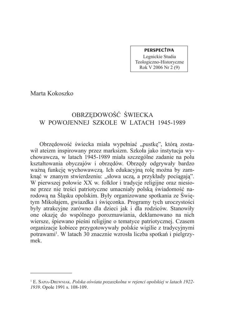 Obrzędowość świecka w powojennej szkole 35 † PERSPECTIVA Legnickie Studia Teologiczno-Historyczne Rok V 2006 Nr 2 (9) Marta Kokoszko OBRZĘDOWOŚĆ ŚWIECKA W POWOJENNEJ SZKOLE W LATACH 1945-1989 Obrzędowość świecka miała wypełniać „pustkę”, którą zostawił ateizm inspirowany przez marksizm. Szkoła jako instytucja wychowawcza, w latach 1945-1989 miała szczególne zadanie na polu kształtowania obyczajów i obrzędów. Obrzędy odgrywały bardzo ważną funkcję wychowawczą. Ich edukacyjną rolę można by zamknąć w znanym stwierdzeniu: „słowa uczą, a przykłady pociągają”. W pierwszej połowie XX w. folklor i tradycje religijne oraz niesione przez nie treści patriotyczne umacniały polską świadomość narodową na Śląsku opolskim. Były organizowane spotkania ze Świętym Mikołajem, gwiazdka i święconka. Programy tych uroczystości były atrakcyjne zarówno dla dzieci jak i dla rodziców. Stanowiły one okazję do wspólnego porozmawiania, deklamowano na nich wiersze, śpiewano pieśni religijne o tematyce patriotycznej. Czasem organizacje kobiece przygotowywały polskie wigilie z tradycyjnymi potrawami1. W latach 30 znacznie wzrosła liczba spotkań i pielgrzymek. E. SAPIA-DREWNIAK. Polska oświata pozaszkolna w rejenci opolskiej w latach 19221939. Opole 1991 s. 108-109. 1 36 MARTA KOKOSZKO 1. ROLA UROCZYSTOŚCI SZKOLNYCH W KSZTAŁTOWANIU ŚWIECKIEGO MODELU WYCHOWANIA Po drugiej wojnie światowej ceremoniał świecki miał utrwalać panujący ustrój, stosunki społeczne i kulturowe. Dzieci, rodzice i nauczyciele mieli się jednoczyć wokół symboli narodowych, umacniać swój patriotyzm oraz postawę obywatelską. Zarówno na III Plenum KC PZPR w 1955 r. jak i na VIII Zjeździe Partii w 1980 r. szczególnie mocno podkreślano rolę obrzędów socjalistycznych2. Jak widać, partia doceniała rolę obrzędów w wychowaniu. Nowe elementy o charakterze świeckim były wprowadzane od 1949 r. Wydany przez ministra oświaty okólnik z 9 grudnia 1949 r. zalecał by uroczystości noworoczne wyeksponowały świecki charakter wychowania. Od tej pory tradycyjna „choinka” miała być kojarzona z dziadkiem Mrozem, królewną Śnieżką itp., a św. Mikołaj, aniołki i inne symbole religijne miały być raczej zapomniane. Zamiast tradycyjnych ozdób choinkowych na gałązkach miały się znaleźć miniatury wielkich budowli socjalistycznych3. Ministerstwo Oświaty w komunikacie z 1951 r. zalecało, by zabawę przy choince urozmaicić dekoracjami symbolizującymi osiągnięcia planu 6-letniego, pracę na rzecz pokoju oraz przy tej okazji pogłębiać uczucia patriotyczne4. Ważnym obszarem działania szkoły było wdrażanie świeckiego ceremoniału uroczystości szkolnych. Dla upowszechnienia i doskonalenia udziału szkoły w różnych obrzędach młodzieżowych zostały podjęte liczne działania5. Zapotrzebowanie na obrzędowość religijną, według Zenona Kaweckiego, było uzależnione od liczby wierzących w Polsce6. Obrzędowość świecka w szkole miała wyeliminować i zastąpić wyniesioną z domu tradycję chrześcijańską. Miała ona wspierać W. KRÓL. Rola TKKŚ w rozwijaniu i upowszechnianiu obrzędów socjalistycznych w Polsce. „Argumenty” 1980 nr 21 s. 5. 3 F. MIELCZANEK. Ideologiczno-polityczna indoktrynacja nauczycieli w Polsce w latach 1945-56. Opole 1997 s. 110. 4 Komunikat Ministra Oświaty z listopada 1951 r. nr II W-9335/51 w sprawie imprez noworocznych. AP w Katowicach, PWN KOS-101. W: MIELCZANEK. Ideologicznopolityczna indoktrynacja nauczycieli. s. 110. 5 KRÓL. Rola TKKŚ. s. 5. 6 Z. KAWECKI. Religia w społeczeństwie socjalistycznym. „Argumenty” 1986 nr 20 s. 11. 2 Obrzędowość świecka w powojennej szkole 37 polską szkołę w kształtowaniu świadomości uczniów w duchu nadrzędnych wartości socjalizmu. Chodziło o to, jak pisał Zenon Góźdź, aby utrwalić w uczniu normy i zasady moralne, które regulowałyby socjalistyczny charakter stosunków międzyludzkich. W uczniu miało wzrastać przekonanie, że osobista pomyślność jednostki jest nierozerwalnie związana z pomyślnością narodu i społeczeństwa7. Szkoła miała nie tylko oddziaływać na sferę intelektualną ucznia, ale także na przeżycia. Wiele elementów uroczystości szkolnych niosło ze sobą duży ładunek emocjonalny. Należały do nich: przyrzeczenia, ślubowania, oddawanie hołdu symbolom narodowym. Wszystko to budziło piękne i szlachetne uczucia, uczyło szacunku dla bohaterskich tradycji narodu polskiego, pobudzało do działania w imię wspólnej sprawy. Szczególne znaczenie w wychowaniu świeckim miało poszanowanie dla symboli narodowych: godła, sztandaru i hymnu narodowego. Szkoła dążyła do wiązania uczuć z symbolami, tworząc przy nich podniosły nastrój8. Dla przykładu, w jednym z liceów było organizowane uroczyste ślubowanie klas pierwszych9. Uroczystość ta miała miejsce w drugim miesiącu nauki, gdy już wszyscy uczniowie dokładnie zapoznali się ze szkołą, z jej patronem i ze swoimi obowiązkami. Młodzież tego liceum prowadziła ożywioną korespondencję z żołnierzami rosyjskimi oraz z młodzieżą z zaprzyjaźnionych miast Węgier i Czechosłowacji. Uczniowie przygotowywali programy artystyczne z okazji Dnia Matki i Dnia Kobiet. Przez cały okres nauki każda klasa wybierała sobie jedno państwo i na jego temat gromadziła materiały, a następnie opracowywała prezentację dla całej szkoły. 2. ŚWIĘTA FAWORYZOWANE PRZEZ WŁADZE LUDOWE Z pomocą procesowi laicyzacji i tworzeniu nowej obrzędowości przyszło także wiele nowych świąt wprowadzonych przez władze Polski Ludowej. Były to święta o charakterze ogólnopaństwowym: 1 maja, 22 lipca, rocznica Rewolucji Październikowej; święta o charakterze społeczno-rodzinnym, np.: Międzynarodowy Dzień Dziecka, Z. GÓŹDŹ. Racjonalizm a szkoła. „Oświata i Wychowanie” 1987 nr 9 s. 28. Tamże. 9 K. KOPIŃSKA. Szkoła świeckich tradycji