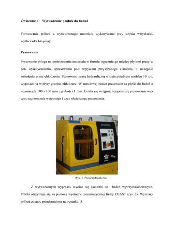 Ćwiczenie 4 – Wytworzenie próbek do badań Formowanie próbek z wytworzonego materiału wykonywano przy użyciu wtryskarki, wytłaczarki lub prasy. Prasowanie Prasowanie polega na umieszczeniu materiału w formie, ogrzaniu go między płytami prasy w celu uplastycznienia, sprasowaniu pod wpływem przyłożonego ciśnienia, a następnie zestaleniu przez chłodzenie. Stosowano prasę hydrauliczną o maksymalnym nacisku 10 ton, wyposażoną w płyty grzejno-chłodzące. W metalowej ramce prasowane są płytki do badań o wymiarach 100 x 100 mm i grubości 1 mm. Ustala się wstępnie temperaturę prasowania oraz czas nagrzewania wstępnego i czas właściwego prasowania. Rys. 1. Prasa hydrauliczna Z wytworzonych wyprasek wycina się kształtki do badań wytrzymałościowych. Próbki otrzymuje się za pomocą wycinarki pneumatycznej firmy CEAST (rys. 2). Wymiary próbek zostały przedstawione na rysunku 3. Rys. 2. Wycinarka pneumatyczna firmy CEAST Rys. 3. Wymiary próbek do badań wytrzymałościowych zgodne z normą ASTM D 0638 Wtryskiwanie Wtryskiwanie polega na uplastycznieniu materiału, a następnie wtryśnięciu go do gniazda formy wtryskowej, które nadaje tworzywu odpowiedni kształt, utrwalany przez chłodzenie. Wtryskiwanie termoplastów można przeprowadzić w maszynach ślimakowych lub tłokowych. Próbki do badań wytrzymałościowych sporządza się za pomocą mikrowtryskarki laboratoryjnej firmy PROMA (rys. 4). Jest to urządzenie pneumatyczne z możliwością regulacji temperatury cylindra, formy oraz ciśnienia wtrysku. Rys. 4. Mikrowtryskarka laboratoryjna Etapy wtryskiwania: · wtrysk (zamknięcie formy, przesuwanie ślimaka lub tłoka do przodu), · uplastycznianie (dozowanie i dociśnięcie ślimakiem lub tłokiem tworzywa umieszczonego w formie), · wyrzucanie (otwarcie formy, usunięcie wypraski z formy) Metoda jest stosowana w produkcji różnorodnych elementów i wyrobów z takich tworzyw termoplastycznych, jak poliamid, polistyren, polietylen, polichlorek winylu. Dla tworzyw termoplastycznych wtryskiwanie jest najważniejszą metodą otrzymywania elementów formowanych, tj. gotowych kształtek wtryskowych, o masie od mniej niż 1 mg do ponad 10 kg, w cyklach roboczych od kilku sekund do wielu minut, z minimalnym nakładem pracy na obróbkę końcową. W przypadku wtryskarki ślimakowej (ze ślimakowym układem uplastyczniającym) proces przebiega następująco. Materiał w postaci granulatu lub rzadziej proszku zostaje doprowadzony do gorącego, obracającego się ślimaka przez lej zasilający. Formowana masa jest przesuwana do końca ślimaka i w trakcie tego stapiana przez dopływ ciepła od cylindra i przez tarcie. Przed końcem ślimaka tworzy się poduszka stopionej masy, która przesuwa ślimak do tyłu. Jeżeli ilość tej masy wystarcza do wytworzenia kształtki, to ślimak przestaje się obracać i jest przesuwany, najczęściej hydraulicznie, do przodu, a stop jest wciskany do formy, którą z reguły utrzymuje się w odpowiedniej temperaturze. Tworzące się przy tym ciśnienie osiąga wartość powyżej 10 MPa i jest utrzymywane na tym poziomie do momentu zestalenia się masy tworzywa w formie lub do momentu zestalenia się tworzywa w punkcie wlewowym. Tak otrzymana kształtka wtryskowa zostaje usunięta z otwartej formy lub wyrzucona przez pręty lub płyty wyrzutnikowe Najważniejsze pojęcia: WTRYSKARKA - współczesne wtryskarki są skomplikowanymi, wielofunkcyjnymi maszynami do przetwórstwa tworzyw sztucznych. Ogólna budowa wszystkich ich typów jest podobna, ponieważ składają się one z pełniących tę samą rolę zespołów funkcjonalnych. W zależności od rodzaju przetwarzanego tworzywa, sposobu pracy, rodzaju formy itp., są dostosowywane do wymogów poszczególnych wariantów technologii w sposób konstrukcyjny bądź przez zastosowanie specjalnego wyposażenia technologicznego. CIŚNIENIE WTRYSKIWANIA - zależne jest od lepkości tworzywa i długości drogi płynięcia. Największe straty ciśnienia na drodze płynięcia występują w otworze dyszy wtryskarki i przewężce układu wlewowego. Wysokość p ustala się zależnie od p, czyli od charakterystycznego dla danych warunków płynięcia minimalnego ciśnienia pozwalającego na całkowite wypełnienie gniazda formy. TEMPERATURA TWORZYWA - w otworze dyszy i w przewężce gwałtownie wzrasta temperatura tworzywa oraz prędkość płynięcia; następuje wtedy korzystne obniżenie lepkości ułatwiające wypełnienie gniazda. W skrajnym przypadku, w tych miejscach może wystąpić nawet przegrzanie i degradacja termiczna tworzywa. SZYBKOŚĆ WTRYSKIWANIA - ustawiana jest tak, aby zachować stałą szybkość płynięcia czoła strumienia tworzywa w gnieździe. Programowany profil zmian szybkości jest proporcjonalny do kolejnych przekrojów wypraski na drodze płynięcia. Przy dużej szybkości wtryskiwania może nastąpić gwałtowny wzrost ciepła tarcia w przewężce kanału wlewowego. CZAS WTRYSKIWANIA - związany jest z szybkością wtryskiwania. Zależy przede wszystkim od wydajności układu uplastyczniającego wtryskarki, konstrukcji i rozmiarów wypraski oraz rodzaju tworzywa. W zależności od tych czynników czas wtrysku może wynosić od kilku sekund do kilku minut. Ze względu na wydajność wtryskarki (czynnik ekonomiczny) dąży się do tego, aby czas cyklu był jak najkrótszy. CIŚNIENIE DOCISKU - ma na celu ciągłe uzupełnianie strat kurczącego się tworzywa. Przebiega według ustalonego profilu. W przypadku tworzyw amorficznych ustawiane jest jako wartość malejąca w celu zmniejszenia udziału zamrożonych naprężeń własnych; w przypadku tworzyw częściowo krystalicznych, przy których ze względu na parokrotnie większy skurcz objętościowy nie występuje możliwość powstania naprężeń tego typu, ustawiane jest jako wartość stała. CZAS DOCISKU - powinien trwać do momentu zastygnięcia kanałów doprowadzających ( przewężki ). Zbyt krótki, 