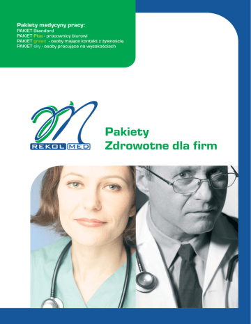 Pakiety medycyny pracy: PAKIET Standard PAKIET Plus - pracownicy biurowi PAKIET green - osoby maj¹ce kontakt z ¿ywnoci¹ PAKIET sky - osoby pracuj¹ce na wysokociach Pakiety Zdrowotne dla firm Pakiety Zdrowotne dla firm Medycyna pracy Us³ugi zwi¹zane z obowi¹zkowymi badaniami medycyny pracy wykonujemy w oparciu o Ustawê o s³u¿bie medycyny pracy z dnia 27.06.97(Dz.U.nr 96 poz.593 z póniejszymi zmianami) oraz Kodeks Pracy. !· P³atnoæ za w/w badania mo¿e odbywaæ siê jednorazowo na podstawie wystawionej faktury b¹d w formie miesiêcznego abonamentu. Ceny pakietów ustalane s¹ w zale¿noci od iloci pracowników kierowanych na badania. ! PAKIET Standard ! ! ! konsultacja lekarza medycyny pracy badania laboratoryjne: Ob., morfologia, badanie ogólne moczu, 10% zni¿ki na pozosta³e us³ugi wiadczone przez REKOL-MED. Cena pakietu: 85z³ PAKIET Plus - pracownicy biurowi ! ! ! ! konsultacja lekarza medycyny pracy badania laboratoryjne: Ob., morfologia, badanie ogólne moczu, konsultacje okulistyczne 10% zni¿ki na pozosta³e us³ugi wiadczone przez REKOL-MED. Cena pakietu: 115z³ Pakiety Zdrowotne dla firm Medycyna pracy PAKIET green - osoby maj¹ce kontakt z ¿ywnoci¹ ! ! ! ! konsultacja lekarza medycyny pracy badania laboratoryjne: Ob., morfologia, badanie ogólne moczu, badanie ka³u na nosicielstwo 10% zni¿ki na pozosta³e us³ugi wiadczone przez REKOL-MED. Cena pakietu: 115z³ PAKIET sky - osoby pracuj¹ce na wysokociach ! ! ! ! ! ! konsultacja lekarza medycyny pracy badania laboratoryjne: Ob., morfologia, badanie ogólne moczu, konsultacja okulistyczna konsultacje neurologiczna konsultacje laryngologiczna 10% zni¿ki na pozosta³e us³ugi wiadczone przez REKOL-MED. Cena pakietu: 155z³ Abonamentowa opieka lekarska: PAKIET Bia³y PAKIET Niebieski PAKIET Z³oty Abonamentowa opieka medyczna Abonamentowa opieka medyczna pakiety medyczne Tu powinna pojawiæ siê opisówka tych abonementów medycznych. kontakt jak kto jest zainteresowany, lub mo¿liwoci rabatów. Dodatkowo zdanie informuj¹ce ¿e je¿eli kto jest zainteresowany to ka¿dy pakiet moze mu zostac przedstawiony dokladnie przez osobe z recolmedu zajmujaca sie pakietami. Ceny pakietów ustalane s¹ w zale¿noci od iloci wykupowanych abonamentów PAKIET Bia³y ! ! ! ! wielokrotny dostêp do lekarza internisty podstawowy zakres badañ ambulatoryjnych (na zlecenie lekarza) szczepienia przeciwko grypie 10% zni¿ki na pozosta³e us³ugi REKOL-MED. Cena pakietu: 89z³ PAKIET Niebieski ! ! ! ! ! wielokrotny dostêp do lekarza internisty wielokrotny dostêp do lekarzy specjalistów: ginekolog, okulista, laryngolog, dermatolog, neurolog, specjalista rehabilitacji narz¹du ruchu rozszerzony zakres badañ ambulatoryjnych (na zlecenie lekarza) szczepienia przeciwko grypie 10% zni¿ki na badania diagnostyczne oraz rehabilitacjê narz¹du ruchu Cena pakietu: 189z³ Abonamentowa opieka medyczna pakiety medyczne PAKIET Z³oty ! ! ! ! ! ! ! ! wielokrotny dostêp do lekarza internisty wielokrotny dostêp do lekarzy specjalistów pe³en zakres badañ laboratoryjnych (na zlecenie lekarza) pe³en zakres badañ diagnostycznych (na zlecenie lekarza) rehabilitacja narz¹du ruchu (zajêcia z terapeut¹) fizykoterapia pe³en zakres szczepieñ kompleksowy przegl¹d stanu zdrowia Cena pakietu: 629z³