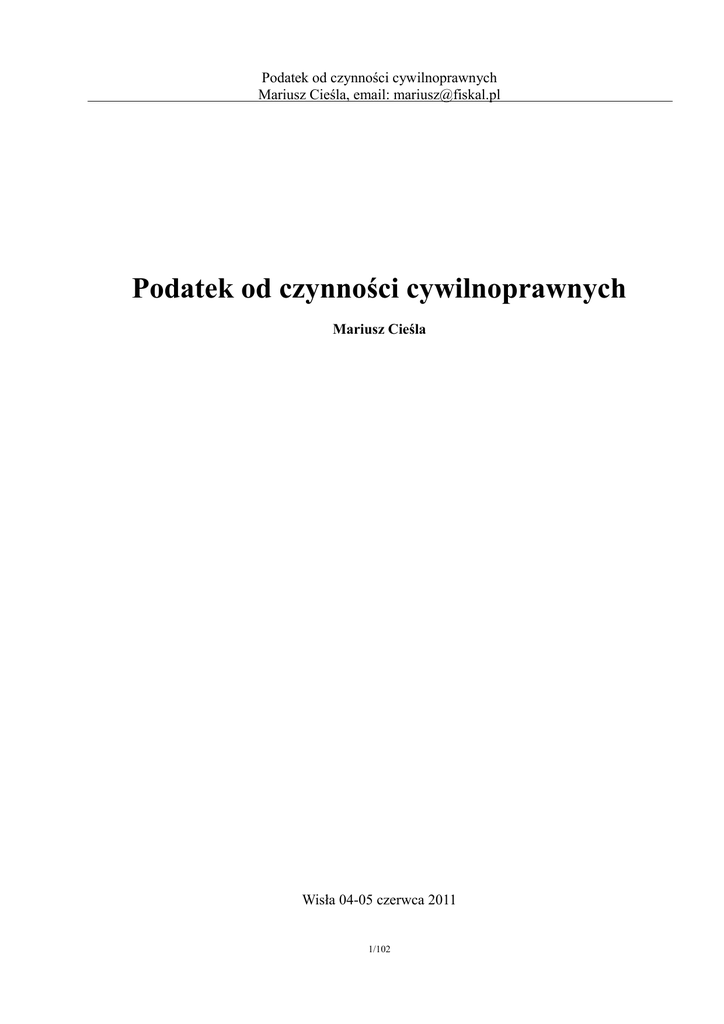 Podatek od czynności cywilnoprawnych Mariusz Cieśla, email: [email protected] Podatek od czynności cywilnoprawnych Mariusz Cieśla Wisła 04-05 czerwca 2011 1/102 Podatek od czynności cywilnoprawnych Mariusz Cieśla, email: [email protected] 1. Czynności opodatkowane - zakres umów opodatkowanych PCC W myśl ustawy z dnia 9 września 2000 r. o podatku od czynności cywilnoprawnych (jt. Dz. U. 101/2010 poz. 649 ze zm.) podatkowi podlegają czynności cywilnoprawne wymienione w art. 1 ust. 1 ww ustawy zmiany tych umów wymienionych w tym przepisie oraz orzeczenia sądów i ugody, jeżeli wywołują one takie same skutki prawne, jak podlegające opodatkowaniu czynności cywilnoprawne. Czynności te podlegają opodatkowaniu w przypadku gdy rzeczy nimi objęte znajdują się na terytorium Rzeczypospolitej Polskiej lub prawa majątkowe wykonywane są na terytorium Rzeczypospolitej Polskiej. A contrario, nie podlegają podatkowi wszystkie rzeczy i prawa majątkowe znajdujące się lub wykonywane zagranicą. Jest to logiczne, gdyż w takim przypadku podlegają one opodatkowaniu krajów w których się znajdują lub są wykonywane. Jednak zasada ta nie jest uniwersalna, gdyż w pewnych warunkach powyższe rzeczy i prawa będą opodatkowane w Polsce. Decyduje status ich nabywcy oraz miejsce wykonania czynności.. Są one opodatkowane w Polsce tylko wtedy, gdy nabywca ma miejsce zamieszkania lub siedzibę na terytorium Rzeczypospolitej Polskiej i czynność cywilnoprawna została dokonana na terytorium Rzeczypospolitej Polskiej. Sprzedaż Opodatkowaniu PCC podlega umowa sprzedaży rzeczy lub praw majątkowych. Oznacza to, że nie tylko umowa sprzedaży w rozumieniu Kodeksu cywilnego, ale również umowa zbycia (cesji) praw majątkowych stanowi umowę sprzedaży w rozumieniu przepisów PCC, i w związku z tym również podlega opodatkowaniu. Podstawę opodatkowania przy umowie sprzedaży stanowi wartość rynkowa rzeczy lub prawa majątkowego. W przypadku sprzedaży wartość nakładów nie umniejsza podstawy opodatkowania. Cena powinna bowiem odzwierciedlać wartość przedmiotu umowy wraz z nakładami. W przypadku wspówłasności podstawa opodatkowania to cena za udział (wartość rynkowa udziału) we współwłasności, a nie odpowiednia część ceny za całość (wartości rynkowej całosci). To istotna informacja, bowiem całość można sprzedać drożej, niż - proporcjonalnie - udział. Obowiązek podatkowy powstaje z chwilą dokonania czynności cywilnoprawnej (zawarcia umowy). Jeżeli zawarcie umowy przenoszącej własność następuje w wykonaniu zobowiązania wynikającego z uprzednio zawartej umowy zobowiązującej do przeniesienia własności (np. z umowy przedwstępnej), obowiązek podatkowy powstaje z chwilą zawarcia umowy przenoszącej własność (ostatecznej umowy sprzedaży). Obowiązek podatkowy ciąży na kupującym. Stawki PCC od umowy sprzedaży wynoszą: 2/102 Podatek od czynności cywilnoprawnych Mariusz Cieśla, email: [email protected] 2 % - od nieruchomości, rzeczy ruchomych, prawa użytkowania wieczystego, własnościowego spółdzielczego prawa do lokalu mieszkalnego, spółdzielczego prawa do lokalu użytkowego oraz wynikających z przepisów prawa spółdzielczego: prawa do domu jednorodzinnego oraz prawa do lokalu w małym domu mieszkalnym; 1 % - od innych praw majątkowych. Zamiana Opodatkowaniu PCC podlega umowa zamiany rzeczy lub praw majątkowych. Podstawę opodatkowania przy umowie zamiany stanowi: przy zamianie lokalu mieszkalnego stanowiącego odrębną nieruchomość lub własnościowego spółdzielczego prawa do lokalu mieszkalnego na taki lokal lub prawo do lokalu - różnica wartości rynkowych zamienianych lokali lub praw do lokali; w pozostałych przypadkach - wartość rynkowa rzeczy lub prawa majątkowego, od którego przypada wyższy podatek. Obowiązek podatkowy powstaje z chwilą dokonania czynności cywilnoprawnej (zawarcia umowy). Jeżeli zawarcie umowy przenoszącej własność następuje w wykonaniu zobowiązania wynikającego z uprzednio zawartej umowy zobowiązującej do przeniesienia własności (np. z umowy przedwstępnej), obowiązek podatkowy powstaje z chwilą zawarcia umowy przenoszącej własność (ostatecznej umowy sprzedaży). Obowiązek podatkowy ciąży na stronach czynności cywilnoprawnych. Bez względu na to, jak strony umówiły się, urząd może żądać zapłaty od obu stron. Jeżeli obowiązek podatkowy ciąży na kilku podmiotach albo na stronach umowy zamiany, zobowiązanymi solidarnie do zapłaty podatku są odpowiednio te podmioty, strony umowy zamiany. Stawki PCC od umowy zamiany wynoszą: 2 % - przy przeniesieniu własności nieruchomości, rzeczy ruchomych, prawa użytkowania wieczystego, własnościowego spółdzielczego prawa do lokalu mieszkalnego, spółdzielczego prawa do lokalu użytkowego oraz wynikających z przepisów prawa spółdzielczego: prawa do domu jednorodzinnego oraz prawa do lokalu w małym domu mieszkalnym, 1% - przy przeniesieniu własności innych praw majątkowych. Podatek według określonej stawki należy naliczyć odpowiednio od różnic wartości rynkowej albo od wartości rynkowej przedmiotu o wyższej wartości, a w przypadku zamiany przedmiotów, do których stosuje się różne stawki, należy zastosować do całości stawkę wyższą. 3/102 Podatek od czynności cywilnoprawnych Mariusz Cieśla, email: [email protected] Pożyczka W rozumieniu Kodeksu cywilnego przez umowę pożyczki dający pożyczkę zobowiązuje się przenieść na własność biorącego określoną ilość pieniędzy albo rzeczy oznaczonych tylko co do gatunku, a biorący zobowiązuje się zwrócić tę samą ilość pieniędzy albo tę samą ilość rzeczy tego samego gatunku i tej samej jakości. Pożyczka zobowiązująca pożyczkobiorcę do zwrotu nie takich samych przedmiotów, ale tych samych przedmiotów, stanowiąca tzw. depozyt nieprawidłowy, również podlega PCC. Opodatkowanie pożyczki udzielon