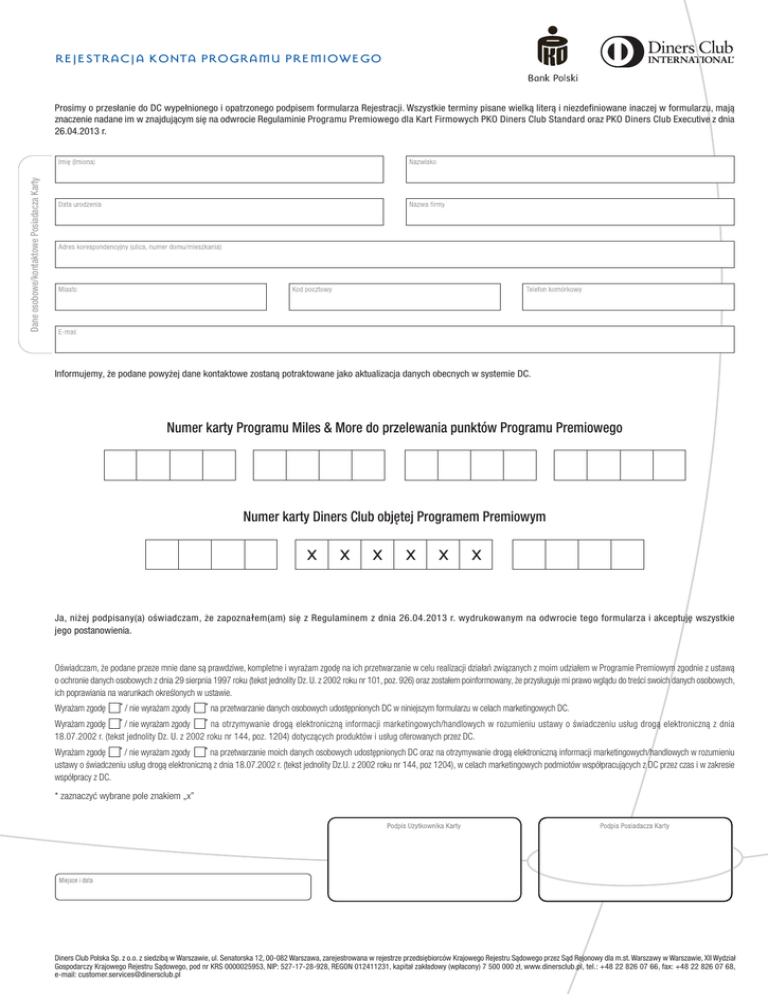 rejestracja konta programu premiowego Dane osobowe/kontaktowe Posiadacza Karty Prosimy o przesłanie do DC wypełnionego i opatrzonego podpisem formularza Rejestracji. Wszystkie terminy pisane wielką literą i niezdefiniowane inaczej w formularzu, mają znaczenie nadane im w znajdującym się na odwrocie Regulaminie Programu Premiowego dla Kart Firmowych PKO Diners Club Standard oraz PKO Diners Club Executive z dnia 26.04.2013 r. Informujemy, że podane powyżej dane kontaktowe zostaną potraktowane jako aktualizacja danych obecnych w systemie DC. Numer karty Programu Miles & More do przelewania punktów Programu Premiowego Numer karty Diners Club objętej Programem Premiowym x x x x x x Ja, niżej podpisany(a) oświadczam, że zapoznałem(am) się z Regulaminem z dnia 26.04.2013 r. wydrukowanym na odwrocie tego formularza i akceptuję wszystkie jego postanowienia. Oświadczam, że podane przeze mnie dane są prawdziwe, kompletne i wyrażam zgodę na ich przetwarzanie w celu realizacji działań związanych z moim udziałem w Programie Premiowym zgodnie z ustawą o ochronie danych osobowych z dnia 29 sierpnia 1997 roku (tekst jednolity Dz. U. z 2002 roku nr 101, poz. 926) oraz zostałem poinformowany, że przysługuje mi prawo wglądu do treści swoich danych osobowych, ich poprawiania na warunkach określonych w ustawie. Wyrażam zgodę * / nie wyrażam zgody * na przetwarzanie danych osobowych udostępnionych DC w niniejszym formularzu w celach marketingowych DC. Wyrażam zgodę * / nie wyrażam zgody * na otrzymywanie drogą elektroniczną informacji marketingowych/handlowych w rozumieniu ustawy o świadczeniu usług drogą elektroniczną z dnia 18.07.2002 r. (tekst jednolity Dz. U. z 2002 roku nr 144, poz. 1204) dotyczących produktów i usług oferowanych przez DC. Wyrażam zgodę * / nie wyrażam zgody * na przetwarzanie moich danych osobowych udostępnionych DC oraz na otrzymywanie drogą elektroniczną informacji marketingowych/handlowych w rozumieniu ustawy o świadczeniu usług drogą elektroniczną z dnia 18.07.2002 r. (tekst jednolity Dz.U. z 2002 roku nr 144, poz 1204), w celach marketingowych podmiotów współpracujących z DC przez czas i w zakresie współpracy z DC. * zaznaczyć wybrane pole znakiem „x” Diners Club Polska Sp. z o.o. z siedzibą w Warszawie, ul. Senatorska 12, 00-082 Warszawa, zarejestrowana w rejestrze przedsiębiorców Krajowego Rejestru Sądowego przez Sąd Rejonowy dla m.st. Warszawy w Warszawie, XII Wydział Gospodarczy Krajowego Rejestru Sądowego, pod nr KRS 0000025953, NIP: 527-17-28-928, REGON 012411231, kapitał zakładowy (wpłacony) 7 500 000 zł, www.dinersclub.pl, tel.: +48 22 826 07 66, fax: +48 22 826 07 68, e-mail: [email protected] REGULAMIN PROGRAMU PREMIOWEGO DLA KART FIRMOWYCH PKO DINERS CLUB STANDARD ORAZ PKO DINERS CLUB EXECUTIVE Niniejszy Regulamin dotyczy zasad przystąpienia do Programu Premiowego kart firmowych PKO Diners Club Standard oraz PKO Diners Club Executive. 1. Definicje W Regulaminie oraz formularzu terminy pisane wielką literą mają następujące znaczenie: Bank – PKO Bank Polski S.A. z siedzibą w Warszawie, ul. Puławska 15. DC – Diners Club Polska Sp. z o.o. z siedzibą w Warszawie, ul. Senatorska 12. Karta – karta płatnicza Diners Club wydana przez Bank. Konto Karty – zindywidualizowany rachunek ewidencyjny prowadzony przez DC, na którym rejestrowane są Operacje Użytkownika dokonane Kartą, wpłaty oraz inne obciążenia zgodnie z Tabelą Opłat i Prowizji. Konto Milowe Miles & More (dalej: Konto Milowe) – konto założone dla uczestników Programu Miles & More w celu rejestrowania i przeliczania mil zgromadzonych przez danego uczestnika. Konto Punktowe DC – rachunek ewidencyjny prowadzony przez DC, na którym rejestrowana jest liczba Punktów DC. Mile Miles & More (dalej: Mile) – podstawowe jednostki księgowe w Programie Miles & More, które zapisywane są na Koncie Milowym Posiadacza. 5. Przenoszenie Punktów DC 5.1. Punkty DC mogą być wykorzystywane w ramach Programu Premiowego zgodnie z jego zmienną zawartością przedmiotową, w tym m.in. w sposób opisany w pkt 5.2 i 5.3 Regulaminu. Aktualna zawartość przedmiotowa Programu Premiowego prezentowana jest na stronie internetowej www.dinersclub.pl. 5.2. Użytkownik może w każdej chwili zgłosić DC chęć przeniesienia Punktów DC na wskazane w Formularzu Rejestracji Konto Milowe w Programie M&M. 5.3. Punkty DC można przenosić w pakietach po 200 Punktów DC przy czym jeden Punkt DC jest równy 1 Mili. Wykorzystanie Punktów DC przeniesionych na Konto Milowe podlega warunkom ustalonym w Warunkach Uczestnictwa w Programie M&M. 6. Ważność Punktów DC 6.1. Wszystkie Punkty DC są ważne przez 24 miesiące od daty sporządzenia Wyciągu zgodnie z pkt 4 Regulaminu. 6.2. Punkty DC tracą ważność po upływie 90 dni od dnia rozwiązania Umowy. 6.3. W przypadku śmierci Użytkownika nie powstają żadne wzajemne roszczenia w odniesieniu do Punktów DC. 6.4. Jeżeli DC prowadzi postępowanie windykacyjne w stosunku do Posiadacza/Użytkownika, Posiadacz/Użytkownik traci zebrane Punkty DC. 6.5. DC zastrzega sobie prawo do anulowania Punktów DC naliczanych za Operacje sprzeczne z obowiązującymi przepisami prawa lub wykorzystywanych sprzecznie z Regulaminem. Operacja – wypłata gotówki albo dokonanie zapłaty przy użyciu Karty. Posiadacz – firma, której została wydana Karta. Program Miles & More (dalej: Program M&M) – program dla osób często podróżujących, w ramach którego uczestnicy premiowani są za korzystanie z usług linii lotniczych biorących udział w programie Miles & More. Operatorem i organizatorem programu są linie lotnicze Lufthansa. Współoperatorem programu na rynku polskim są Polskie Linie Lotnicze LOT S.A. z siedzibą w Warszawie, ul. 17 Stycznia 39. Program Premiowy – program dla Użytkowników, w ramach którego uczestnicy premiowani są za dokonywane operacje. Organizatorem Programu jest DC. 