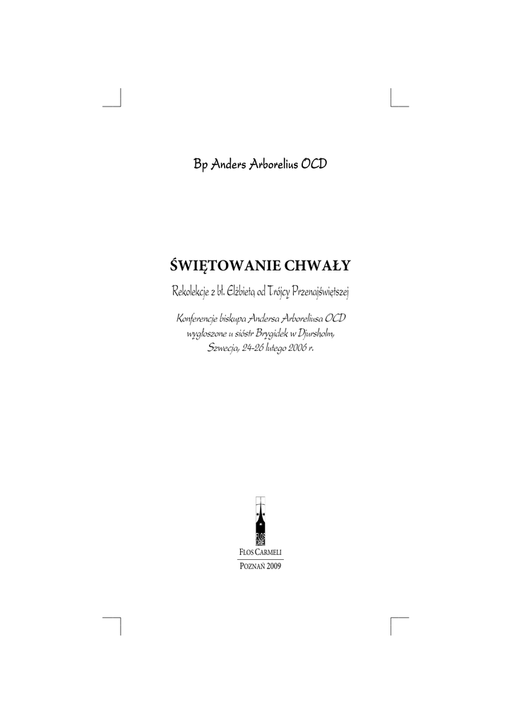 Bp Anders Arborelius OCD ŚWIĘTOWANIE CHWAŁY Rekolekcje z bł. Elżbietą od Trójcy Przenajświętszej Konferencje biskupa Andersa Arboreliusa OCD wygłoszone u sióstr Brygidek w Djursholm, Szwecja, 24-26 lutego 2006 r. FLOS CARMELI POZNAŃ 2009 Redakcja: Wojciech Ciak OCD, Bożena Bilska OCD Tłumaczenie: Kamila Fałtynowicz Projekt okładki: Marzenna Torlińska Imprimi potest: O. Roman Jan Hernoga OCD, Prowincjał Warszawa, dnia 9.05.2009 r.; L. dz. 61/P/2009 Imprimatur: Bp Marek Jędraszewski, Wikariusz Generalny Poznań, dnia 17.04.2009 r.; N. 1279/2009 Nihil obstat: Ks. Prał. prof. dr hab. Romuald Niparko, Cenzor Poznań, dnia 15.04.2009 r. © Copyright by FLOS CARMELI, 2009 – wydanie I ISBN 978-83-61727-36-1 Abyśmy istnieli ku chwale Jego majestatu. (Ef 1,12) Kiedy w 1998 roku Anders Arborelius OCD został biskupem Kościoła Katolickiego, przyjął zawołanie: In Laudem Gloriæ (Ef 1,12) – Uwielbienie Chwały. Przez 27 lat życia w Karmelu zgłębiał życie i posłannictwo wielkich świętych Kościoła, i pisał o nich książki, zwłaszcza o świętych Karmelu. Lecz właśnie zawołanie Elżbiety od Trójcy Przenajświętszej (18801906), tej mało znanej francuskiej karmelitanki, czyni swoim, kiedy zostaje powołany do posługi jako pasterz Kościoła w Szwecji. Być może nie jest to tylko przypadek. W 1979 roku wydawnictwo karmelitańskie w Szwecji wydało listy i pisma Elżbiety od Trójcy Przenajświętszej pod tytułem Pisma duchowe. Tłumaczenia dzieł Błogosławionej dokonał właśnie biskup Anders. Może już w tym czasie docenił on znaczenie przesłania błogosławionej Elżbiety od Trójcy Przenajświętszej dla wszystkich, nie tylko dla tych, którzy są powołani do życia za murami klasztoru. Duża część jej listów jest skierowana właśnie do rodziny i przyjaciół poza klasztorem. Jeśli jest coś, czego współczesny świat potrzebuje, to właśnie ludzi żyjących głęboką więzią z Bo- 7 Słowo wstępne giem, która rozwija się w życiu modlitwy i ciszy, i dzielących się tym doświadczeniem z innymi, w zrozumiałym dla nich języku. Świat potrzebuje świadków, którzy, poprzez pozorne paradoksy wiary, wyraźnie ukazują, że głębokie życie w Chrystusie jest powołaniem wszystkich chrześcijan, niezależnie od ich sytuacji życiowej. To czyniła Elżbieta od Trojcy Przenajświętszej i to biskup Anders czyni modlitwą swojego życia, kiedy wybiera dla siebie zawołanie: In Laudem Gloriæ. Jest to zawołanie, które w pełni charakteryzuje biskupa Andersa. Stoi w obliczu żyjącego Boga (por. 1 Krl 17,1) i pragnie być Uwielbieniem Jego Chwały. To zawołanie jest znakiem, za którym ukrywa się głęboka świadomość, że przez chrzest święty jest wszczepiony w Chrystusa, a przez Chrystusa włączony w życie Trójcy Świętej, która odtąd go zamieszkuje. Ta świadomość przenika całe oddanie biskupa Arboreliusa w służbie Kościołowi. Jego nauczanie możemy określić jako katechezy mistagogiczne, przez które wprowadza nas do wnętrza misterium powołania chrześcijańskiego. Ten sam Chrystus żyje w nas (J 14,23; 1 J 4,13) i żyje w łonie Ojca (J 1,18), i ten sam Chrystus, Syn Boży, przez wcielenie swoje zjednoczył się jakoś z każdym człowiekiem (KDK 22; Mt 25,40). Pragnienie, aby być Uwielbieniem Chwały, jest konsekwencją spotkania Zmartwychwstałego Pana (Mt 28,20). Jest doświadczeniem paschalnym, które kształtuje świadka Jezusa w zsekularyzowanym świecie. Biskup Anders wpisuje to osobiste doświadczenie spotkania Pana w swoje nauczanie, które jest przeniknięte 8 Świętowanie chwały duchem męstwa i pokory – będących szczególnymi darami Zmartwychwstałego dla tych, których wybrał, aby o Nim świadczyli. Wprowadzając nas do wnętrza misterium powołania chrześcijańskiego, biskup Anders, daje nam niejako klucz, którym możemy się posługiwać, aby wypływać na głębię (Łk 5,4) naszego życia i z prostotą ewangelicznego dziecka (Mt 11,25-30) wnikać w miłującą Obecność Boga, która jest Rzeczywistością za zasłoną znaku. Tym kluczem są słowa: To jest Pan (J 21,7). Być „Uwielbieniem Chwały” znaczy czcić Boga, który objawił siebie jako Jestem, Który Jestem (Wj 3,14). On JEST tu i teraz, wszędzie tam, gdzie się znajdujemy, w naszym zapracowanym życiu, pełnym stresów, porażek, chorób. Mamy dużą łatwość tłumaczenia się i zasłaniania się problemami, aby nie żyć w bliskości i miłości Boga, który nas zamieszkuje. Pozwalamy się tak zagłuszać i zaciemniać, że już nie jesteśmy w stanie widzieć miłującego Boga w życiu własnym i innych ludzi. Aby to zmienić, biskup Anders powołuje się na Elżbietę od Trójcy Przenajświętszej. W przedstawionych czterech konferencjach z całą prostotą i z największą oczywistością próbuje do nas dotrzeć, niejako stawiając wszystko na głowie. Właśnie w naszej słabości, w naszej irytacji i frustracji Bóg jest obecny, jako ten, który nas oczyszcza i uświęca. Poprzez przykłady i wyrażenia, które wywołują nasz uśmiech, jesteśmy wprowadzani do wnętrza powołania chrześcijańskiego: być jaśniejącymi świadkami – pośrodku zwątpienia i zła świata – którzy ukazują, że 9 Słowo wstępne są świadomi zamieszkiwania Boga pośrodku naszej nieczystości (Kpł 16,16; Mt 9,9-13; Mk 2,13-17; Łk 5,27-32), i nie wstydzą się tego. Naszym powołaniem jest pamiętać, że Bóg jest tutaj, że On dał nam swego Syna, aby wziął nasz brud i przemienił go w czystość, abyśmy byli Jego szczęśliwymi dziećmi i uwielbiali Go. Jesteśmy powołani, aby ukazać radość płynącą z picia ze Źródła, powołani do bycia świadkami Jezusa w zsekularyzowanym świecie. Żyjąc tak, wciąż rozwijamy się w życiu czystym (Mt 5,8), pokornym (Mt 11,29) i radosnym (J 15,11). Te właśnie cnoty rozwijają się w kroczeniu śladami Chrystusa – są syntezą życiowego przesłania biskupa Andersa. K