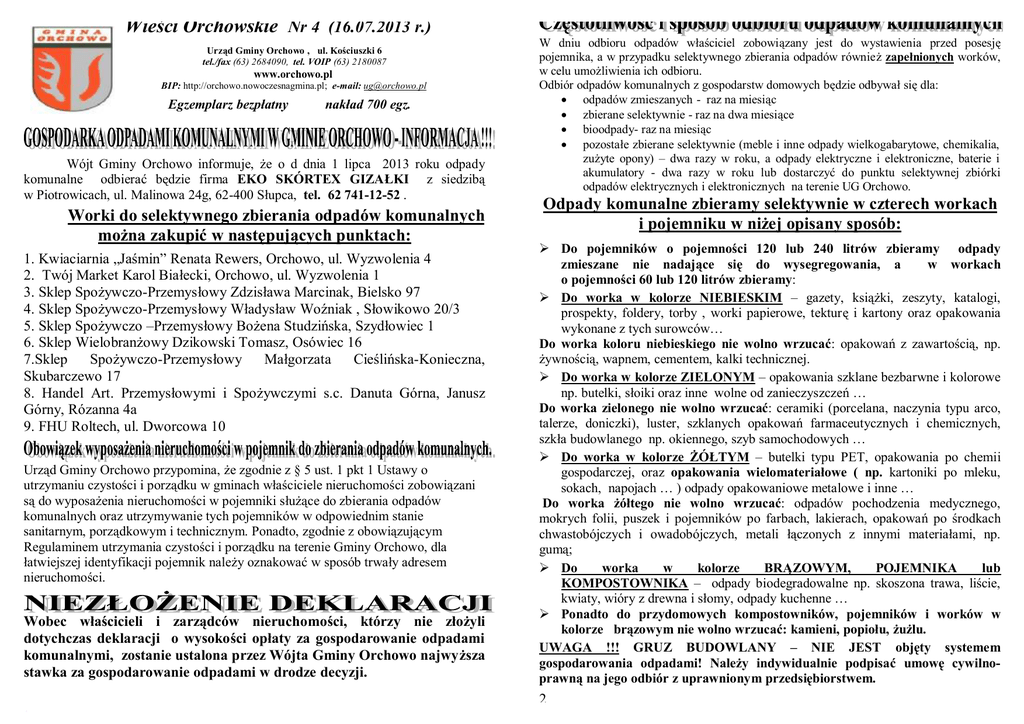 Wieści Orchowskie Nr 4 (16.07.2013 r.) Urząd Gminy Orchowo , ul. Kościuszki 6 tel./fax (63) 2684090, tel. VOIP (63) 2180087 www.orchowo.pl BIP: http://orchowo.nowoczesnagmina.pl; e-mail: [email protected] Egzemplarz bezpłatny nakład 700 egz. Wójt Gminy Orchowo informuje, że o d dnia 1 lipca 2013 roku odpady komunalne odbierać będzie firma EKO SKÓRTEX GIZAŁKI z siedzibą w Piotrowicach, ul. Malinowa 24g, 62-400 Słupca, tel. 62 741-12-52 . Worki do selektywnego zbierania odpadów komunalnych można zakupić w następujących punktach: 1. Kwiaciarnia „Jaśmin” Renata Rewers, Orchowo, ul. Wyzwolenia 4 2. Twój Market Karol Białecki, Orchowo, ul. Wyzwolenia 1 3. Sklep Spożywczo-Przemysłowy Zdzisława Marcinak, Bielsko 97 4. Sklep Spożywczo-Przemysłowy Władysław Woźniak , Słowikowo 20/3 5. Sklep Spożywczo –Przemysłowy Bożena Studzińska, Szydłowiec 1 6. Sklep Wielobranżowy Dzikowski Tomasz, Osówiec 16 7.Sklep Spożywczo-Przemysłowy Małgorzata Cieślińska-Konieczna, Skubarczewo 17 8. Handel Art. Przemysłowymi i Spożywczymi s.c. Danuta Górna, Janusz Górny, Rózanna 4a 9. FHU Roltech, ul. Dworcowa 10 Urząd Gminy Orchowo przypomina, że zgodnie z § 5 ust. 1 pkt 1 Ustawy o utrzymaniu czystości i porządku w gminach właściciele nieruchomości zobowiązani są do wyposażenia nieruchomości w pojemniki służące do zbierania odpadów komunalnych oraz utrzymywanie tych pojemników w odpowiednim stanie sanitarnym, porządkowym i technicznym. Ponadto, zgodnie z obowiązującym Regulaminem utrzymania czystości i porządku na terenie Gminy Orchowo, dla łatwiejszej identyfikacji pojemnik należy oznakować w sposób trwały adresem nieruchomości. Wobec właścicieli i zarządców nieruchomości, którzy nie złożyli dotychczas deklaracji o wysokości opłaty za gospodarowanie odpadami komunalnymi, zostanie ustalona przez Wójta Gminy Orchowo najwyższa stawka za gospodarowanie odpadami w drodze decyzji. W dniu odbioru odpadów właściciel zobowiązany jest do wystawienia przed posesję pojemnika, a w przypadku selektywnego zbierania odpadów również zapełnionych worków, w celu umożliwienia ich odbioru. Odbiór odpadów komunalnych z gospodarstw domowych będzie odbywał się dla: • odpadów zmieszanych - raz na miesiąc • zbierane selektywnie - raz na dwa miesiące • bioodpady- raz na miesiąc • pozostałe zbierane selektywnie (meble i inne odpady wielkogabarytowe, chemikalia, zużyte opony) – dwa razy w roku, a odpady elektryczne i elektroniczne, baterie i akumulatory - dwa razy w roku lub dostarczyć do punktu selektywnej zbiórki odpadów elektrycznych i elektronicznych na terenie UG Orchowo. Odpady komunalne zbieramy selektywnie w czterech workach i pojemniku w niżej opisany sposób: Ø Do pojemników o pojemności 120 lub 240 litrów zbieramy odpady zmieszane nie nadające się do wysegregowania, a w workach o pojemności 60 lub 120 litrów zbieramy: Ø Do worka w kolorze NIEBIESKIM – gazety, książki, zeszyty, katalogi, prospekty, foldery, torby , worki papierowe, tekturę i kartony oraz opakowania wykonane z tych surowców… Do worka koloru niebieskiego nie wolno wrzucać: opakowań z zawartością, np. żywnością, wapnem, cementem, kalki technicznej. Ø Do worka w kolorze ZIELONYM – opakowania szklane bezbarwne i kolorowe np. butelki, słoiki oraz inne wolne od zanieczyszczeń … Do worka zielonego nie wolno wrzucać: ceramiki (porcelana, naczynia typu arco, talerze, doniczki), luster, szklanych opakowań farmaceutycznych i chemicznych, szkła budowlanego np. okiennego, szyb samochodowych … Ø Do worka w kolorze ŻÓŁTYM – butelki typu PET, opakowania po chemii gospodarczej, oraz opakowania wielomateriałowe ( np. kartoniki po mleku, sokach, napojach … ) odpady opakowaniowe metalowe i inne … Do worka żółtego nie wolno wrzucać: odpadów pochodzenia medycznego, mokrych folii, puszek i pojemników po farbach, lakierach, opakowań po środkach chwastobójczych i owadobójczych, metali łączonych z innymi materiałami, np. gumą; Ø Do worka w kolorze BRĄZOWYM, POJEMNIKA lub KOMPOSTOWNIKA – odpady biodegradowalne np. skoszona trawa, liście, kwiaty, wióry z drewna i słomy, odpady kuchenne … Ø Ponadto do przydomowych kompostowników, pojemników i worków w kolorze brązowym nie wolno wrzucać: kamieni, popiołu, żużlu. UWAGA !!! GRUZ BUDOWLANY – NIE JEST objęty systemem gospodarowania odpadami! Należy indywidualnie podpisać umowę cywilnoprawną na jego odbiór z uprawnionym przedsiębiorstwem. 2 Opłaty za gospodarowanie odpadami komunalnymi zostały określone uchwałą Rady Gminy i są jednakowe dla wszystkich mieszkańców. 1. Stawka w wysokości 12 zł (od osoby na miesiąc) w przypadku gdy odpady komunalne nie są gromadzone i odbierane w sposób selektywny (odpady zmieszane) 2. Stawka w wysokości 7 zł (od osoby na miesiąc) w przypadku gdy odpady komunalne są gromadzone i odbierane w sposób selektywny. 3. Stawka w wysokości 5 zł ( od osoby na miesiąc) w przypadku gdy odpady komunalne są gromadzone w sposób selektywny i odpady ulegające biodegradacji, kuchenne i ogrodowe są składowane na kompostowniku (posiadanie kompostownia należy obowiązkowo zgłosić w Urzędzie Gminy). Opłata za gospodarowanie odpadami komunalnymi wnoszona będzie przez właścicieli i zarządców nieruchomości bez wezwania, na podstawie złożonej deklaracji raz na miesiąc. Ø PIERWSZĄ OPŁATĘ za gospodarowanie odpadami komunalnymi, obejmującą okres od dnia 1 lipca 2013 r. do 31 lipca 2013 r. należy zapłacić w terminie do 31 lipca 2013 r., Ø KOLEJNE OPŁATY za odpady komunalne należy wpłacać do 15 dnia danego miesiąca (np. za miesiąc sierpień do 15 sierpnia itd.) UWAGA !!! Wpłaty za gospodarowanie odpadami będą dokonywane na indywidualne konta, które zostaną przesłane do każdego właściciela lub zarządcy danej posesji. W związku z wdrażaniem nowego systemu gospodarowania odpadami 