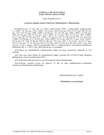 UCHWAŁA NR XXXVI/430/12 RADY MIASTA BIAŁYSTOK z dnia 10 grudnia 2012 r. w sprawie nadania statutu Galerii im. Sleńdzińskich w Białymstoku. Na podstawie art. 18 ust.2 pkt 15 ustawy z dnia 8 marca 1990 r. o samorządzie gminnym (Dz. U. z 2001 r. Nr 142, poz. 1591, z 2002 r. Nr 23, poz. 220, Nr 62, poz. 558, Nr 113, poz. 984, Nr 153, poz. 1271 i Nr 214, poz. 1806, z 2003 r. Nr 80, poz. 717 i Nr 162, poz. 1568, z 2004 r. Nr 102, poz. 1055, Nr 116, poz. 1203, Nr 167, poz. 1759, z 2005 r. Nr 172, poz. 1441, Nr 175, poz. 1457, z 2006 r. Nr 17, poz.128 i Nr 181, poz.1337, z 2007 r. Nr 48, poz. 327, Nr 138, poz.974 i Nr 173, poz.1218, z 2008 r. Nr 180, poz.1111 i Nr 223, poz. 1458, z 2009 r. Nr 52, poz. 420, Nr 157, poz. 1241, z 2010 r. Nr 28, poz.142 i 146, Nr 40, poz.230, Nr 106, poz. 675 oraz z 2011 r. Nr 21 poz. 113, Nr 117 poz. 679, Nr 134, poz. 777, Nr 149, poz. 887, Nr 217 poz. 1281 i Nr 149, poz. 887 oraz z 2012 r. poz. 567) oraz art. 13 ust. 1 ustawy z dnia 25 października 1991 r. o organizowaniu i prowadzeniu działalności kulturalnej (Dz. U. z 2012 r. poz. 406) uchwala się, co następuje: § 1. Galerii im. Sleńdzińskich w Białymstoku nadaje się statut, stanowiący załącznik nr 1 do uchwały. § 2. Traci moc statut Galerii im. Sleńdzińskich nadany uchwałą NR LX/784/10 Rady Miejskiej Białegostoku z dnia 25 października 2010 r. § 3. Wykonanie uchwały powierza się Prezydentowi Miasta Białegostoku. § 4. Uchwała wchodzi w życie po upływie 14 dni od dnia opublikowania w Dzienniku Urzędowym Województwa Podlaskiego. PRZEWODNICZĄCY RADY Włodzimierz Leszek Kusak —————————————————————————————————————————————————— Id: EBB0C445-D03C-4911-89DC-0FC59D7A9FA9. Podpisany Strona 1 Załącznik do Uchwały Nr XXXVI/430/12 Rady Miasta Białystok z dnia 10 grudnia 2012 r. STATUT GALERII IM. SLEŃDZIŃSKICH W BIAŁYMSTOKU Rozdział 1 POSTANOWIENIA OGÓLNE § 1. 1. Galeria im. Sleńdzińskich, zwana dalej „Galerią”, jest miejską instytucją kultury, wpisaną do Rejestru Instytucji Kultury Miasta Białegostoku pod numerem RIK 03/92. 2. Galeria działa na podstawie ustawy z dnia 25 października 1991 r. o organizowaniu i prowadzeniu działalności kulturalnej (Dz. U. z 2012 r. poz. 406), zwanej dalej „ustawą”, ustawy z dnia 23 lipca 2003 r. o ochronie zabytków i opiece nad zabytkami (Dz. U. Nr 162, poz. 1568 z późn. zm.) oraz postanowień niniejszego statutu. 3. Galeria jest instytucją posiadającą osobowość prawną. 4. Organizatorem Galerii jest Miasto Białystok. § 2. 1. Siedzibą Galerii jest miasto Białystok. 2. Galeria obejmuje terenem działania miasto Białystok, z zastrzeżeniem ust.3. 3. W ramach wykonywanych zadań Galeria może prowadzić działalność na obszarze całego kraju. Rozdział 2 ZAKRES DZIAŁALNOŚCI GALERII § 3. Celem działania Galerii jest: 1) upowszechnianie i udostępnianie zbiorów i spuścizny rodu Sleńdzińskich, dokumentujących kulturę Kresów Wschodnich; 2) prezentowanie dorobku i historii lokalnego środowiska artystycznego. § 4. 1. Do podstawowych zadań Galerii należy: 1) prezentowanie dorobku artystycznego rodu Sleńdzińskich oraz lokalnych twórców; 2) prowadzenie działalności edukacyjnej i upowszechnieniowej; 3) gromadzenie i opracowywanie dóbr kultury z zakresu swojej działalności. 2. Do zadań szczegółowych Galerii należy: 1) organizacja wystaw stałych, czasowych i objazdowych; 2) inwentaryzacja, katalogowanie oraz zabezpieczenie i konserwacja gromadzonych zbiorów i materiałów dokumentacyjnych; 3) gromadzenie i opracowywanie dokumentacji związanej z charakterem działalności; 4) prowadzenie działalności edukacyjnej przy współpracy z jednostkami oświatowymi i organami administracji, w celu rozpoznawania, rozbudzania i zaspokajania potrzeb oraz zainteresowań kulturalnych; 5) współpraca z instytucjami o podobnych celach przy realizacji projektów i przedsięwzięć kulturalnych; 6) prowadzenie działalności wydawniczej. —————————————————————————————————————————————————— Id: EBB0C445-D03C-4911-89DC-0FC59D7A9FA9. Podpisany Strona 2 Rozdział 3 ORGANY ZARZĄDZAJĄCE I DORADCZE § 5. 1. Galeria jest zarządzana przez Dyrektora, którego powołuje i odwołuje Prezydent Miasta Białegostoku na czas określony, w trybie określonym ustawą. 2. Dyrektor zarządza całokształtem działalności Galerii, reprezentuje ją na zewnątrz oraz czuwa nad mieniem i jest za nie odpowiedzialny. 3. Nadzór nad Galerią sprawuje Prezydent Miasta Białegostoku. 4. Czynności wobec Dyrektora Galerii w sprawach z zakresu prawa pracy dokonuje Prezydent Miasta Białegostoku. § 6. 1. W Galerii – jako organ opiniodawczy i doradczy – działa, powoływana przez Prezydenta Miasta Białegostoku, na wniosek Dyrektora, Rada Programowa. 2. W skład Rady nie może wchodzić więcej niż 9 członków, powoływanych spośród rzeczoznawców, reprezentantów stowarzyszeń naukowych i twórczych, lokalnych twórców, kuratora zbiorów oraz organizatora. 3. Tryb działania Rady oraz jej zadania określa ustalony przez nią i zatwierdzony przez Dyrektora, po zasięgnięciu opinii Prezydenta Miasta Białegostoku, regulamin. § 7. Organizację wewnętrzną Galerii oraz zakres działań poszczególnych komórek organizacyjnych i samodzielnych stanowisk pracy określa Regulamin Organizacyjny, nadany przez Dyrektora, po zasięgnięciu opinii Prezydenta Miasta Białegostoku oraz działających w Galerii organizacji związkowych i stowarzyszeń twórców. Rozdział 4 ŹRÓDŁA FINANSOWANIA § 8. 1. Galeria prowadzi samodzielną gospodarkę finansową na zasadach określonych w ustawie. 2. Podstawą gospodarki finansowej Galerii jest roczny plan finansowy, ustalony przez Dyrektora z zachowaniem wysokości dotacji z budżetu Miasta Białegost