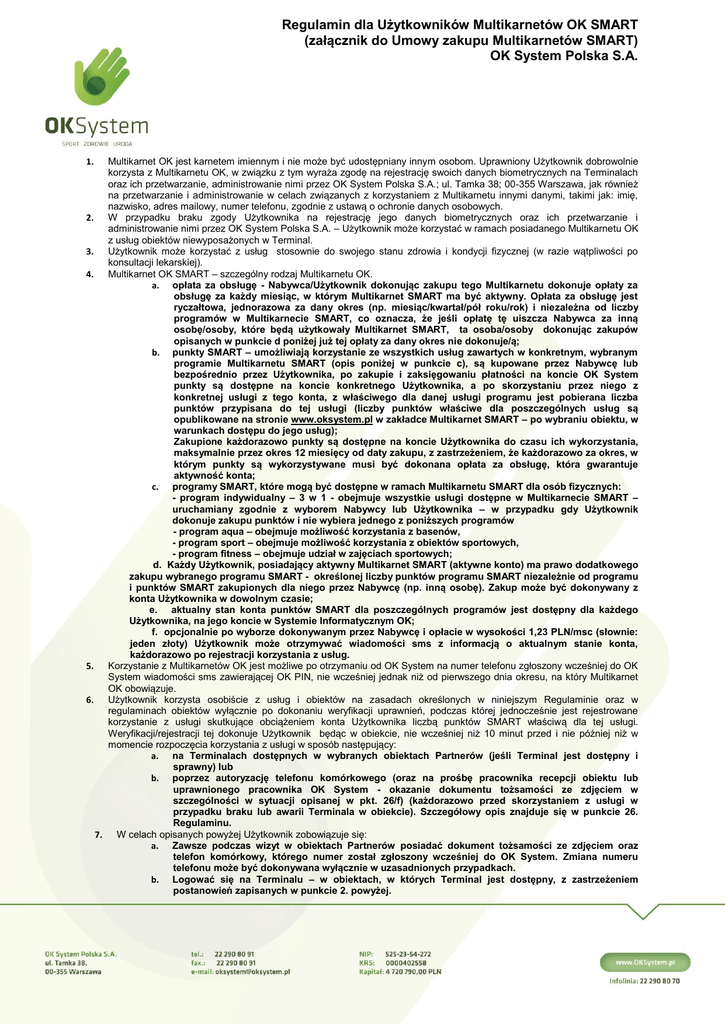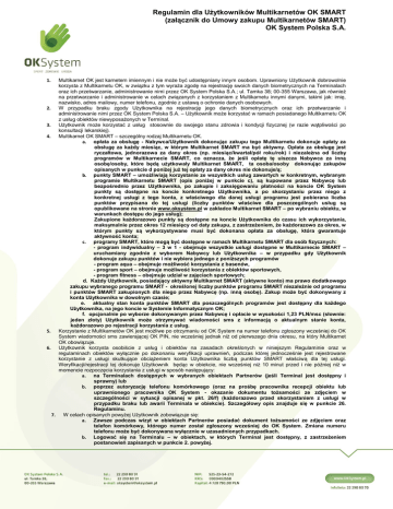 Regulamin dla Użytkowników Multikarnetów OK SMART (załącznik do Umowy zakupu Multikarnetów SMART) OK System Polska S.A. Multikarnet OK jest karnetem imiennym i nie może być udostępniany innym osobom. Uprawniony Użytkownik dobrowolnie korzysta z Multikarnetu OK, w związku z tym wyraża zgodę na rejestrację swoich danych biometrycznych na Terminalach oraz ich przetwarzanie, administrowanie nimi przez OK System Polska S.A.; ul. Tamka 38; 00-355 Warszawa, jak również na przetwarzanie i administrowanie w celach związanych z korzystaniem z Multikarnetu innymi danymi, takimi jak: imię, nazwisko, adres mailowy, numer telefonu, zgodnie z ustawą o ochronie danych osobowych. 2. W przypadku braku zgody Użytkownika na rejestrację jego danych biometrycznych oraz ich przetwarzanie i administrowanie nimi przez OK System Polska S.A. – Użytkownik może korzystać w ramach posiadanego Multikarnetu OK z usług obiektów niewyposażonych w Terminal. 3. Użytkownik może korzystać z usług stosownie do swojego stanu zdrowia i kondycji fizycznej (w razie wątpliwości po konsultacji lekarskiej). 4. Multikarnet OK SMART – szczególny rodzaj Multikarnetu OK. a. opłata za obsługę - Nabywca/Użytkownik dokonując zakupu tego Multikarnetu dokonuje opłaty za obsługę za każdy miesiąc, w którym Multikarnet SMART ma być aktywny. Opłata za obsługę jest ryczałtowa, jednorazowa za dany okres (np. miesiąc/kwartał/pół roku/rok) i niezależna od liczby programów w Multikarnecie SMART, co oznacza, że jeśli opłatę tę uiszcza Nabywca za inną osobę/osoby, które będą użytkowały Multikarnet SMART, ta osoba/osoby dokonując zakupów opisanych w punkcie d poniżej już tej opłaty za dany okres nie dokonuje/ą; b. punkty SMART – umożliwiają korzystanie ze wszystkich usług zawartych w konkretnym, wybranym programie Multikarnetu SMART (opis poniżej w punkcie c), są kupowane przez Nabywcę lub bezpośrednio przez Użytkownika, po zakupie i zaksięgowaniu płatności na koncie OK System punkty są dostępne na koncie konkretnego Użytkownika, a po skorzystaniu przez niego z konkretnej usługi z tego konta, z właściwego dla danej usługi programu jest pobierana liczba punktów przypisana do tej usługi (liczby punktów właściwe dla poszczególnych usług są opublikowane na stronie www.oksystem.pl w zakładce Multikarnet SMART – po wybraniu obiektu, w warunkach dostępu do jego usług); Zakupione każdorazowo punkty są dostępne na koncie Użytkownika do czasu ich wykorzystania, maksymalnie przez okres 12 miesięcy od daty zakupu, z zastrzeżeniem, że każdorazowo za okres, w którym punkty są wykorzystywane musi być dokonana opłata za obsługę, która gwarantuje aktywność konta; c. programy SMART, które mogą być dostępne w ramach Multikarnetu SMART dla osób fizycznych: - program indywidualny – 3 w 1 - obejmuje wszystkie usługi dostępne w Multikarnecie SMART – uruchamiany zgodnie z wyborem Nabywcy lub Użytkownika – w przypadku gdy Użytkownik dokonuje zakupu punktów i nie wybiera jednego z poniższych programów - program aqua – obejmuje możliwość korzystania z basenów, - program sport – obejmuje możliwość korzystania z obiektów sportowych, - program fitness – obejmuje udział w zajęciach sportowych; d. Każdy Użytkownik, posiadający aktywny Multikarnet SMART (aktywne konto) ma prawo dodatkowego zakupu wybranego programu SMART - określonej liczby punktów programu SMART niezależnie od programu i punktów SMART zakupionych dla niego przez Nabywcę (np. inną osobę). Zakup może być dokonywany z konta Użytkownika w dowolnym czasie; e. aktualny stan konta punktów SMART dla poszczególnych programów jest dostępny dla każdego Użytkownika, na jego koncie w Systemie Informatycznym OK; f. opcjonalnie po wyborze dokonywanym przez Nabywcę i opłacie w wysokości 1,23 PLN/msc (słownie: jeden złoty) Użytkownik może otrzymywać wiadomości sms z informacją o aktualnym stanie konta, każdorazowo po rejestracji korzystania z usług. 5. Korzystanie z Multikarnetów OK jest możliwe po otrzymaniu od OK System na numer telefonu zgłoszony wcześniej do OK System wiadomości sms zawierającej OK PIN, nie wcześniej jednak niż od pierwszego dnia okresu, na który Multikarnet OK obowiązuje. 6. Użytkownik korzysta osobiście z usług i obiektów na zasadach określonych w niniejszym Regulaminie oraz w regulaminach obiektów wyłącznie po dokonaniu weryfikacji uprawnień, podczas której jednocześnie jest rejestrowane korzystanie z usługi skutkujące obciążeniem konta Użytkownika liczbą punktów SMART właściwą dla tej usługi. Weryfikacji/rejestracji tej dokonuje Użytkownik będąc w obiekcie, nie wcześniej niż 10 minut przed i nie później niż w momencie rozpoczęcia korzystania z usługi w sposób następujący: a. na Terminalach dostępnych w wybranych obiektach Partnerów (jeśli Terminal jest dostępny i sprawny) lub b. poprzez autoryzację telefonu komórkowego (oraz na prośbę pracownika recepcji obiektu lub uprawnionego pracownika OK System - okazanie dokumentu tożsamości ze zdjęciem w szczególności w sytuacji opisanej w pkt. 26/f) (każdorazowo przed skorzystaniem z usługi w przypadku braku lub awarii Terminala w obiekcie). Szczegółowy opis znajduje się w punkcie 26. Regulaminu. 7. W celach opisanych powyżej Użytkownik zobowiązuje się: a. Zawsze podczas wizyt w obiektach Partnerów posiadać dokument tożsamości ze zdjęciem oraz telefon komórkowy, którego numer został zgłoszony wcześniej do OK System. Zmiana numeru telefonu może być dokonywana wyłącznie w uzasadnionych przypadkach. b. Logować się na Terminalu – w obiektach, w których Terminal jest dostępny, z zastrzeżeniem postanowień zapisanych w punkcie 2. powyżej. 1. Regulamin dla Użytkowników Multikarnetów OK SMART (załącznik do Umowy zakupu Multikarnetów SMART) OK System Polska S.A. 8. 9. 10. 11. 12. 13. 14. 15. 16.