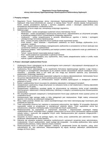 Regulamin Forum Dyskusyjnego strony internetowej Ogólnopolskiego Stowarzyszenia Referendarzy Sądowych I. Przepisy wstępne 1. 2. 3. Regulamin Forum Dyskusyjnego strony internetowej Ogólnopolskiego Stowarzyszenia Referendarzy Sądowych (http://www.referendarz.pl), zwanym w dalszej treści "forum", określa zasady funkcjonowania forum, zasady prowadzenia dyskusji i wymiany poglądów, prawa i obowiązki uŜytkowników oraz kompetencje administratora i moderatora forum. Uczestnictwo w forum wiąŜe się z akceptacją niniejszego regulaminu. Definicje pojęć: Administrator - osoba zarządzająca systemem strony internetowej i forum Moderator - osoba zarządzająca merytoryczną stroną forum, odpowiedzialna za utrzymanie porządku w określonej kategorii forum i przestrzeganie niniejszego regulaminu UŜytkownik - osoba zarejestrowana w serwisie referendarz.pl, zgodnie z treścią i wymogami udostępnionego formularza rejestracyjnego Nick – nazwa pod jaką uŜytkownik forum publikuje swoje wypowiedzi (posty) Profil (konto) - dane osobowe i indywidualne ustawienia na forum kaŜdego uŜytkownika (m.in. sygnatury i avatary) Ranga - stopień odzwierciedlający zaangaŜowanie uŜytkownika w prowadzone na forum dyskusje oraz uprawnienia niektórych uŜytkowników Sygnatura (podpis) - tekst wyświetlany pod kaŜdym postem; kaŜdy uŜytkownik moŜe go zdefiniować w swoim profilu Temat - nazwa (temat) rozpoczętej dyskusji (wątku) Post - kaŜda pojedyncza wypowiedź w wybranym temacie Avatar - obrazek wyświetlany przy uŜytkowniku, który kaŜda zarejestrowana osoba w profilu moŜe wybrać z galerii emblematów II. Prawa i obowiązki uŜytkowników Forum 1. 2. 3. 4. 5. 6. 7. 8. 9. 10. 11. 12. 13. 14. 15. UŜytkownicy forum zobowiązani są do przestrzegania norm prawnych i obyczajowych obowiązujących na terenie Rzeczypospolitej Polskiej. UŜytkownicy forum zobowiązani są do wypełnienia formularza rejestracyjnego zgodnie z jego treścią i wymogami, w szczególności zobowiązani są do podania swoich rzeczywistych danych osobowych (imię i nazwisko) – pozostałe dane w tym takie jak nick mogą być dowolnie wybrane, przy zachowaniu postanowień niniejszego regulaminu. UŜytkownicy forum publikują swoje wypowiedzi wyłącznie na własną odpowiedzialność. Administrator forum nie ponosi odpowiedzialności za treści zamieszczane przez uŜytkowników. UŜytkownicy mają prawo do zamieszczania nowych tematów dyskusyjnych w dostępnych działach podanych w forum. KaŜdy z uŜytkowników forum ma prawo do udzielania odpowiedzi w istniejących tematach. Zarejestrowani uŜytkownicy mogą otrzymywać na wskazane konta e-mail wiadomości z treścią odpowiedzi udzielanych na ich posty. Zarejestrowani uŜytkownicy wyraŜają zgodę na otrzymywanie na wskazane konta e-mail materiałów informacyjnych, wiadomości z treścią reklamową i ofertową, w związku z prowadzoną przez Stowarzyszenie działalnością. We wszystkich sprawach związanych z funkcjonowaniem forum jego uŜytkownik moŜe uzyskać pomoc od moderatora forum. Zamieszczanie tego samego wątku w kilku kategoriach jest niedozwolone. Wątki naleŜy umieszczać zgodnie z ich treścią, we właściwych kategoriach. Nowy wątek powinien składać się z tytułu (wyodrębnionego) oraz treści stanowiącej jego rozwinięcie, jako podstawę do dyskusji. Treść wypowiedzi powinna być napisana w poprawnej polszczyźnie, bez błędów. W przypadku dłuŜszych wypowiedzi naleŜy je przygotować w zewnętrznym edytorze tekstu. Treść wypowiedzi winna być merytoryczna, związana z tematyką wątku i zrozumiała dla innych uŜytkowników. Niedopuszczalne są wypowiedzi o znamionach niesnasek i nieporozumień osobistych między uŜytkownikami forum. Wszystkie treści i poglądy umieszczane na forum winny zachowywać ogólnie przyjęte zasady kultury i szacunku dla poglądów innych osób. Niedopuszczalne jest uŜywanie wulgaryzmów i zwrotów obraźliwych. UŜywanie na forum więcej niŜ jednego loginu, tzw. nicka, przez uŜytkownika jest zabronione i będzie skutkować zablokowaniem konta (banem). Zabrania się uŜywania avatarów (obrazków symbolicznych) wybranych wcześniej przez administratora, moderatorów i innych uŜytkowników. JeŜeli wystąpi taki przypadek - na prośbę uŜytkownika, który wybrał emblemat jako pierwszy, naleŜy dokonać zmiany avatarów. Wykorzystywanie forum w celach ogłoszeń i reklamy w jakiejkolwiek formie dla towarów, usług, stron internetowych itd., jest zabronione. Nieprzestrzeganie tej reguły skutkuje całkowitym zablokowaniem dostępu do forum (ban). 16. Forum i Księga Gości nie słuŜy komentowaniu tekstów. Dodanie na forum wątku będącego komentarzem do tekstu skutkuje jego usunięciem. Tekst moŜe być komentowany przy okazji innego tematu, związanego z tekstem. W takim przypadku naleŜy podać link do danego wątku z informacją o komentarzu tekstu na forum. III. Moderator Forum 1. 2. 3. 4. 5. 6. 7. Moderator nadzoruje dyskusje prowadzone na forum oraz ich zgodność z przyjętymi zasadami. Moderator organizuje prace i dyskusje na forum, rozwiązuje problemy uŜytkowników udzielając im niezbędnych informacji dotyczących funkcjonowania forum. W razie konieczności moderator przenosi tematy do właściwych działów lub je zamyka w razie braku zainteresowania. W przypadku stwierdzenia naruszenia zasad wypełnienia formularza rejestracyjnego moderator pozostawia konto zablokowane, a po upływie 7 dni trwale usuwa dane uŜytkownika z serwisu. Na wniosek uŜytkownika moderator pomaga w zmianie danych ujętych w formularzu rejestracyjnym. Moderator moŜe upomnieć uŜytkownika forum w razie naruszenia przez niego norm wskazanych w niniejszym regulaminie, moŜe równieŜ zablokować (ban) czasowo lub na stałe jego konto. Moderator usuwa temat lub post, jeŜeli np.: zawiera on treści wulgarne, stanowi reklamę, naruszenie praw autorskich lub w inny sposób narusza przepisy prawa, dubluje 