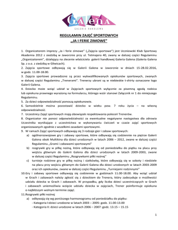 REGULAMIN ZAJĘĆ SPORTOWYCH ,,JA I FERIE ZIMOWE” 1. Organizatorem imprezy „Ja i ferie zimowe” („Zajęcia sportowe”) jest Uczniowski Klub Sportowy Akademia 2012 z siedzibą w Jaworznie przy ul. Tetmajera 40, zwany w dalszej części Regulaminu „Organizatorem”, działający na zlecenie właściciela galerii handlowej Galeria Galena (Galeria Galena Sp. z o.o. z siedzibą w Gliwicach). 2. Zajęcia sportowe odbywają się w Galerii Galena w Jaworznie w dniach 15-28.02.2016, w godz. 11.00-18.00. 3. Zajęcia sportowe prowadzone są przez wykwalifikowanych opiekunów sportowych, zwanych w dalszej części Regulaminu „Trenerami”. Trenerzy ubrani są w niebieskie t-shirty oznaczone logo Galerii Galena. 4. Dziecko może wziąć udział w Zajęciach sportowych wyłącznie za pisemną zgodą rodzica lub opiekuna prawnego wyrażoną na formularzu, którego wzór stanowi Załącznik nr 1 do niniejszego Regulaminu. 5. Za dzieci odpowiedzialność ponoszą opiekunowie. 6. Samodzielnie można pozostawić dziecko w wieku pow. 7 roku życia – na własną odpowiedzialność. 7. Uczestnicy Zajęć sportowych mają obowiązek respektowania poleceń Trenerów. 8. Organizator nie ponosi odpowiedzialności za ewentualne negatywne następstwa dla zdrowia Uczestnika wynikające z uczestnictwa w wykonywaniu ćwiczeń w czasie zajęć sportowych organizowanych zgodnie z wszelkimi zasadami sportowymi. 9. W ramach Zajęć sportowych odbywają się 3 rodzaje gier i zabaw sportowych: a) ogólnorozwojowe gry i zabawy sportowe, które odbywają się codziennie na piętrze Galerii Galena obok Multikina dla dzieci urodzonych w latach 2006 – 2012, zwane w dalszej części Regulaminu „Grami i zabawami sportowymi” b) rozgrywki gry w piłkę nożną, które odbywają się od poniedziałku do piątku na placu przy wejściu głównym do Galerii Galena dla dzieci urodzonych w latach 2009-2003, zwane w dalszej części Regulaminu „Rozgrywkami piłki nożnej” c) turnieje rodzinne gry w piłkę nożną i siatkówkę, które odbywają się w soboty i niedziele na placu przy wejściu głównym do Galerii Galena dla dzieci urodzonych w latach 2003-2009 oraz ich opiekunów, zwane w dalszej części Regulaminu „Turniejami rodzinnymi” 10.Gry i zabawy sportowe odbywają się codziennie w godzinach 11.00-18.00. Aby wziąć udział w Grach i zabawach należy zgłosić się z dzieckiem do Trenera, który zadecyduje o możliwości udziału dziecka w Grach i zabawach. W przypadku, gdy liczba dzieci uczestniczących w Grach i zabawach uniemożliwia wzięcie udziału dziecka w zajęciach, Trener poinformuje opiekuna o najbliższym wolnym terminie zajęć. 11.Rozgrywki piłki nożnej a) odbywają się wg poniższego harmonogramu od poniedziałku do piątku: - Kategoria I:dzieci urodzone w latach 2003 – 2005: godz. 11.00-13.00 - Kategoria II: dzieci urodzone w latach 2006 – 2007: godz. 13.15 – 15.15 1 - Kategoria III: dzieci urodzone w latach 2008 – 2009: godz. 15.30 – 17.30 b) zapisy do Rozgrywek odbywają się pół godziny przed rozpoczęciem zajęć dla danej kategorii wiekowej w miejscu, gdzie odbywają się Rozgrywki. c) Drużyny składają się: - z 2 zawodników (dzieci urodzone w latach 2003-2007) - z 3 zawodników(dzieci urodzone w latach 2008-2009); 12.Turnieje rodzinne a) Odbywają się w 2 kategoriach sportowych: - gra w siatkówkę dla dziewczynek urodzonych w latach 2003-2009 i ich opiekunek (Turniej Mama z córką) odbywa się w niedziele (21 i 28 lutego 2016) - gra w piłkę nożną dla chłopców urodzonych w latach 2003-2009 i ich opiekunów (Turniej Ojciec z Synem) odbywa się w soboty (20 i 27 lutego) b) Turnieje rodzinne odbywają się wg poniższego harmonogramu : - Kategoria I: dzieci urodzone w latach 2003 – 2005: godz. 11.00-13.00 - Kategoria II: dzieci urodzone w latach 2006 – 2007: godz. 13.15 – 15.15 - Kategoria III: dzieci urodzone w latach 2008 – 2009: godz. 15.30 – 17.30 c) zapisy odbywają się pół godziny przed rozpoczęciem Turnieju rodzinnego dla danej kategorii wiekowej w miejscu, gdzie odbywa się Turniej. Warunkiem wzięcia udziału w Turnieju rodzinnych jest wypełnienie formularza przez opiekuna prawnego, którego wzór stanowi Załącznik nr 2 do niniejszego Regulaminu 13.Zasady sportowe obowiązujące dla Rozgrywek piłki nożnej i Turnieju rodzinnego piłki nożnej: a) Zawodnicy zgłoszeni do danego zespołu nie mają prawa przejść do innego zespołu w trakcie trwania Rozgrywek i Turnieju rodzinnego. b) Wszystkie drużyny zobowiązane są posiadać stroje i obuwie sportowe (zakaz gry w lankach, korkach), dopuszcza się grę w obuwiu typu ,,turf” (z przeznaczenie do gry na sztucznych nawierzchniach). c) Mecze rozgrywane są na mobilnym boisku z bandami wokół o wymiarach 9x6 m, bramki o wymiarach 1,8x1,2 m, nawierzchnia: sztuczna trawa. d) Przepisy gry zgodne z przepisami gry uproszczonej w piłkę nożną według wytycznych PZPN. e) czas gry – 4 minuty f) gra bez bramkarza; g) Rozgrywki zostaną rozegrane piłką o rozmiarze nr 4. h) Zawodnikom za niesportowe zachowanie grożą następujące kary, które są wymierzane przez sędziego prowadzącego spotkanie: kara wykluczenia ze spotkania na 1 minuta. i) W Rozgrywkach może wziąć udział maksymalnie 8 zespołów w każdej kategorii wiekowej. j) Punktacja: - za zwycięstwo drużyna otrzymuje 3 punkty, remis 1 punkt, za przegraną 0 punktów - za niestawienie się do Rozgrywek: 0 punktów; przeciwnej drużynie automatycznie zostają przyznane 3 punkty k) W przypadku, gdy 2 drużyny uzyskają taką liczbę punktów o zwycięstwie decyduje wynik bezpośredniego spotkania między nimi l) W przypadku uzyskania tej samej liczby punktów przez więcej, niż 2 drużyny, o kolejności decyduje „mała tabela” uwzględniająca tylko mecze pomiędzy zainteresowanymi zespołami. O miejscach decydują kolejno: - większa ilość zdobytych punktów - stosunek bramek, strzelone do straconych - większa li