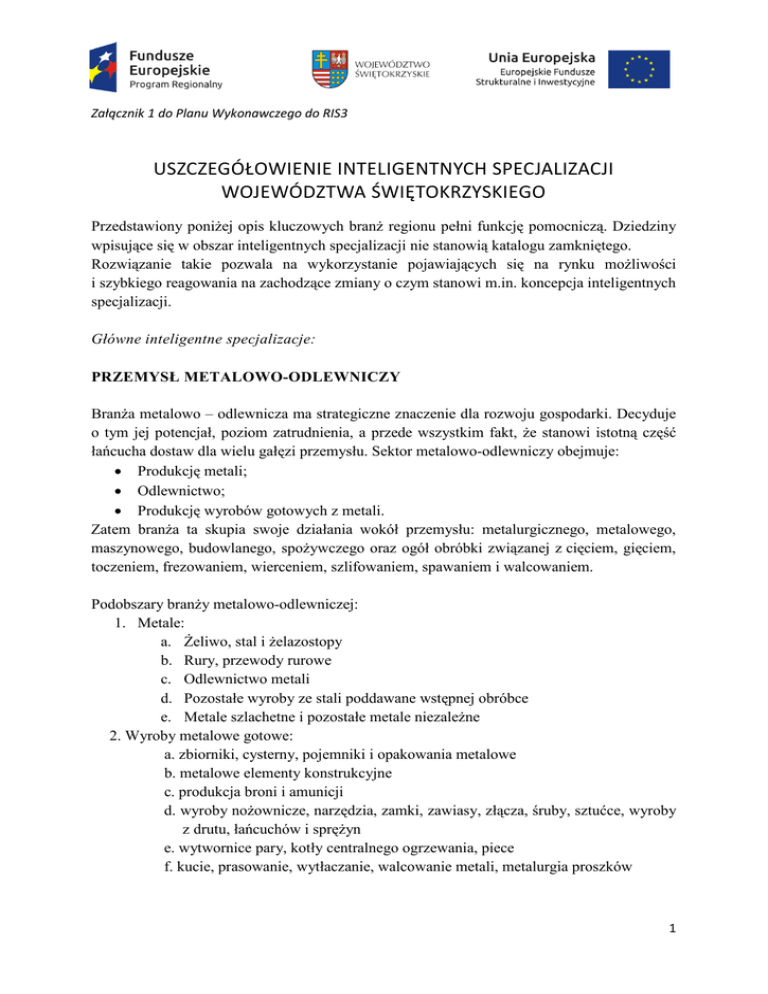 Załącznik 1 do Planu Wykonawczego do RIS3 USZCZEGÓŁOWIENIE INTELIGENTNYCH SPECJALIZACJI WOJEWÓDZTWA ŚWIĘTOKRZYSKIEGO Przedstawiony poniżej opis kluczowych branż regionu pełni funkcję pomocniczą. Dziedziny wpisujące się w obszar inteligentnych specjalizacji nie stanowią katalogu zamkniętego. Rozwiązanie takie pozwala na wykorzystanie pojawiających się na rynku możliwości i szybkiego reagowania na zachodzące zmiany o czym stanowi m.in. koncepcja inteligentnych specjalizacji. Główne inteligentne specjalizacje: PRZEMYSŁ METALOWO-ODLEWNICZY Branża metalowo – odlewnicza ma strategiczne znaczenie dla rozwoju gospodarki. Decyduje o tym jej potencjał, poziom zatrudnienia, a przede wszystkim fakt, że stanowi istotną część łańcucha dostaw dla wielu gałęzi przemysłu. Sektor metalowo-odlewniczy obejmuje: • Produkcję metali; • Odlewnictwo; • Produkcję wyrobów gotowych z metali. Zatem branża ta skupia swoje działania wokół przemysłu: metalurgicznego, metalowego, maszynowego, budowlanego, spożywczego oraz ogół obróbki związanej z cięciem, gięciem, toczeniem, frezowaniem, wierceniem, szlifowaniem, spawaniem i walcowaniem. Podobszary branży metalowo-odlewniczej: 1. Metale: a. Żeliwo, stal i żelazostopy b. Rury, przewody rurowe c. Odlewnictwo metali d. Pozostałe wyroby ze stali poddawane wstępnej obróbce e. Metale szlachetne i pozostałe metale niezależne 2. Wyroby metalowe gotowe: a. zbiorniki, cysterny, pojemniki i opakowania metalowe b. metalowe elementy konstrukcyjne c. produkcja broni i amunicji d. wyroby nożownicze, narzędzia, zamki, zawiasy, złącza, śruby, sztućce, wyroby z drutu, łańcuchów i sprężyn e. wytwornice pary, kotły centralnego ogrzewania, piece f. kucie, prasowanie, wytłaczanie, walcowanie metali, metalurgia proszków 1 Załącznik 1 do Planu Wykonawczego do RIS3 g. obróbka metali, w tym nakładanie powłok, obróbka mechaniczna, niekonwencjonalne techniki wytwarzania, obróbki wykończeniowe. 3. Maszyny i urządzenia ogólnego i specjalnego przeznaczenia w tym: a. silniki i turbiny b. sprzęt i wyposażenie napędu hydraulicznego i pneumatycznego c. pompy i sprężarki d. kurki, zawory, łożyska, koła zębate, elementy napędów e. urządzenia chłodnicze, wentylacyjne f. urządzenia elektryczne g. maszyny dla rolnictwa i leśnictwa, dla górnictwa, budownictwa, przetwórstwa żywności itp. 4. Pojazdy samochodowe, przyczepy, naczepy oraz cysterny. Metale oraz metalowe produkty gotowe wykorzystywane są w następujących sektorach gospodarki: samochodowym, w konstrukcjach stalowych, wytwarzania rur, przy budowach dróg, mostów i budynków, do budowy silników, części i wyposażenia dla lotnictwa, przy budowie i naprawie. statków, w kolejnictwie, w przemyśle rowerowym, lotniczym, w przewodach kanalizacyjnych i spustowych, sprzęcie wojskowym i broni lekkiej, hutnictwie i wielkich piecach; wytwarza się z nich narzędzia ręczne, urządzenia sanitarne, grzejniki, kotły, zawory, łączniki rurowe, rury ciśnieniowe, łączniki, turbiny, generatory mocy, silniki spalinowe, maszyny, urządzenia rolnicze, urządzenia i sprzęt górniczy, kosiarki do trawników, traktory ogrodowe, maszyny budowlane, maszyny i sprzęt do eksploatacji pól naftowych, przenośniki i urządzenia podajnikowe, wózki przemysłowe, przyczepy, obrabiarki, specjalne matryce i narzędzia, maszyny i osprzęt walcarek, specjalne urządzenia przemysłowe, w włókiennictwie, obróbce drewna, papiernictwie, poligrafii, pompach i osprzęcie do pompowania, sprężarkach, systemach przenoszenia mocy (łącznie z mechanizmami przenoszenia napędu i zmiany biegów), w piecach przemysłowych, komputerach, sprzęcie biurowym, sprzęcie do ogrzewania i chłodzenia, silnikach elektrycznych i generatorach, sprzęcie gospodarstwa domowego, sprzęcie komunikacyjnym, aparaturze kontrolno – pomiarowej, sprzęcie medycznym i dentystycznym, grach i zabawkach, wyrobach dla sportu i lekkoatletyki, a także w przemyśle spożywczym. Szerokie kierunki zastosowań produktów z metali świadczą o ich ogromnym wspływie na gospodarkę. Zgodnie z wydanym w 2013 roku dokumentem Komisji Europejskiej pt. „Plan działania na rzecz konkurencyjnego i zrównoważonego przemysłu stalowego w Europie”, branża metalowa stanowi branżę o strategicznym znaczeniu dla rozwoju gospodarki Unii Europejskiej. Jest ona ważnym ogniwem pośrednim w wielu łańcuchach dostaw dla różnych przemysłów, często niedającym się w łatwy i efektywny ekonomicznie sposób zastąpić. 2 Załącznik 1 do Planu Wykonawczego do RIS3 NOWOCZESNE ROLNICTWO I PRZETWÓRSTWO SPOŻYWCZE W specjalizacji mieszczą się: badania; prace rozwojowe oraz innowacje technologiczne, surowcowe, opakowań; bezpieczna i zdrowa żywność oraz zarządzanie procesami produkcji, dystrybucji i marketingu z zakresu: upraw rolnych, chowu i hodowli zwierząt, produkcji artykułów spożywczych i napojów, leśnictwa, rybactwa, działalności usługowej dotyczącej wynajmu i dzierżawy maszyn i urządzeń. Do działań służących rozwojowi nowoczesnego rolnictwa należy zaliczyć przede wszystkim: 1. promowanie rolnictwa ekologicznego. Świętokrzyscy rolnicy mają znakomite warunki do tego typu upraw, ponieważ posiadają wiele drobnych gospodarstw rolnych bardzo dobrze przygotowanych do wytwarzania zdrowej żywności. Drobne uprawy lepiej wykorzystują tę samą powierzchnię uprawną, jak również wykazują się większym uwrażliwieniem na ekosystem; 2. tworzenie grup producenckich, które mają na celu wzmocnienie pozycji na rynku. Wspólne działania, powodują, że zyski z obrotu produktami rolnymi pozostają do dyspozycji rolników i przyczyniają się do rozwoju ich gospodarstw; 3. stawianie na wysoką ochronę środowiska przyrodniczego; 4. produkcja tak zwanych biopaliw (pozyskiwanych np. z odpadów przemysłowych i rolniczych), które są tańsze, trwalsze i bardziej ekologiczne. Nowoczesne ro