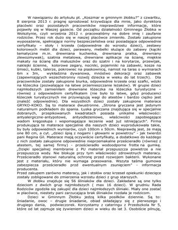 W nawiązaniu do artykułu pt. „Koszmar w gminnym żłobku?” z czwartku, 8 sierpnia 2013 r. pragnę sprostować krzywdzące dla mnie, jako dyrektora placówki oraz pozostałych pracowników nieprawdziwe informacje, które pojawiły się w Waszej gazecie. Od początku działalności Gminnego Żłobka w Wolsztynie, czyli września 2012 r. pracowaliśmy na dobre imię i zaufanie rodziców. Przez rok dużo się w naszej placówce zmieniło. Zostało zakupione wyposażenie, spełniające normy bezpieczeństwa oraz posiadające odpowiednie certyfikaty – stoły i krzesła (odpowiednie do wzrostu dzieci), zestawy kolorowych mebli dla dzieci, parawany, mebelki służące do zabawy (kąciki tematyczne m.in. drewniana kuchenka, drewniana pralka, drewniany zlewozmywak), szatnia metalowa, drewniane aplikacje na ścianę, miękkie makaty na ścianę dla maluszków oraz do szatni i na korytarze, przewijak, naklejki ścienne, kolorowe zegary, nocniki, pojemniki na zabawki, kosze na śmieci, kubki, talerze, pokrowiec na piaskownicę, namiot na taras o wymiarach 6m x 3m, wykładzina dywanowa, mnóstwo dekoracji oraz zabawek (zapewniających wszechstronny rozwój dziecka w wieku do lat trzech). Dla pracowników zostały zakupione biurka, odpowiednie krzesła oraz szafki, wózki na łóżeczka (pozwalające na łatwe przemieszczanie leżaków). W grupie dzieci najmłodszych zamieniłam drewniane łóżeczka na łóżeczka turystyczne – również z odpowiednim certyfikatem (nie było to łatwe, gdyż producenci łóżeczek turystycznych nie przywiązują wagi do atestów i bardzo ciężko jest znaleźć odpowiednie). Dla wszystkich dzieci zostały zakupione materace GRYKO-KOKO. Są to materace dwustronne. „Strona gryczana jest jedynym naturalnym podkładem do spania. Łuska gryczana znajdująca się w specjalnie dobranych, przepikowanych kwadratach posiada unikalne właściwości: antyalergiczne-antypotowe, antyodleżeniowe, właściwości zapobiegające wadom kręgosłupa i wspomagające leczenie wad już istniejących”. Firma produkująca te materace specjalnie dla naszych dzieci wyprodukowała takie, by były odpowiednich wymiarów, czyli 100cm x 50cm. Nieprawdą jest, że mają one 80 cm, a cyt. „dzieci śpią z nogami i głowami w powietrzu” - jak twierdzi pani Regina Gil. Materace mają oczywiście certyfikaty, a dodatkowo do każdego z nich zostało zakupione odpowiednie nieprzemakalne prześcieradło (również z atestem, tej samej firmy) - prześcieradło wodoodporne frotte na gumkę. „Dzięki specjalnej membranie z PU materiał przepuszcza powietrze a nie przepuszcza wody. Nie blokuje przy tym właściwości zdrowotnych materacy. Prześcieradło stanowi naturalną ochronę przed rozwojem bakterii. Wykonane jest z materiału, który nie wymaga prasowania. Wszyta taśma gumowa zabezpiecza prześcieradło przd ewentualnym zsunięciem” - informacja producenta. Przed zakupem zarówno materacy, jak i stołów oraz krzeseł opiekunki dziecięce zostały zobligowane do zmierzenia wzrostu dzieci z grup starszych. W żłobku znajduje się 56 śliniaków dla dzieci. Zakładane są one tylko dzieciom z dwóch grup najmłodszych ( max 16 dzieci). W grudniu Rada Rodziców zgodziła się zakupić dla dzieci najmłodszych śliniaki. Miały one zostać w placówce, niestety pani zarzucająca brak śliniaków rozdała je rodzicom. Dzieci w Gminnym Żłobku jedzą kilka posiłków dziennie. Są to: śniadanie, owoc – drugie śniadanie, obiad składający się z pierwszego i drugiego dania, podwieczorek. Korzystamy z cateringu z Przedszkola Nr 5, które od lat zajmuje się żywieniem dzieci w wieku do lat 3. Osobiście pilnuję, żeby były zachowane wszelkie normy żywieniowe zgodne z piramidą żywieniową. Posiłki są wydawane w odpowiednich porcjach ilościowych i jakościowych – zgodnie w wiekiem dzieci. W kuchni wydzielana jest proporcjonalna ilość jedzenia dla dzieci, których liczba zgłaszana jest po godz. 8:00 każdego dnia. Wtedy towar wydany przez osobę odpowiedzialną jest współmierny do ilości dzieci (doliczana jest również dokładka dla największych łakomczuchów). Powiatowa Stacja Sanitarno – Epidemiologiczna w Wolsztynie nie zgłaszała żadnych zastrzeżeń, co do wyposażenia jak i sprzętu, w który zaopatrzony jest żłobek i nie ma zastrzeżeń również w chwili obecnej. Wszelkie normy higieniczne są w żłobku spełniane. Posiadam również protokoły z przeglądów m.in. budynku, jak i placu zabaw – potwierdzające dobry stan techniczny obiektu. Z ankiet przeprowadzonych wśród rodziców jednoznacznie wynika, iż są oni zadowoleni z usług świadczonych przez żłobek. Uważają to miejsce za przyjazne, bezpieczne, dobrze wyposażone. Estetyka i wyposażenie jest dla większości z nich na bardzo dobrym poziomie – wynika z analizy ankiet ( Raport z analizy ankiet dla rodziców w Gminnym Żłobku w Wolsztynie). Rodzice wyrażają swoje uznanie dla zmian jakie zaszły w placówce. Często, podczas codziennych kontaktów pozytywnie oceniają i zauważają ogromną pracę jaką włożyliśmy w zdobycie dobrej opinii. Do czasu pojawienia się artykułu pt. „Koszmar w gminnym żłobku?” taką właśnie mieliśmy. Uważam za ogromnie krzywdzące słowa pani Reginy Gil w artykule dotyczącym placówki. Nieprawdziwe oskarżenia i zarzuty dotyczące Gminnego Żłobka narażają nasze dobre imię i szkodzą reputacji, na którą pracowaliśmy przez cały rok. Magdalena Piotrowska Dyrektor Gminnego Żłobka w Wolsztynie