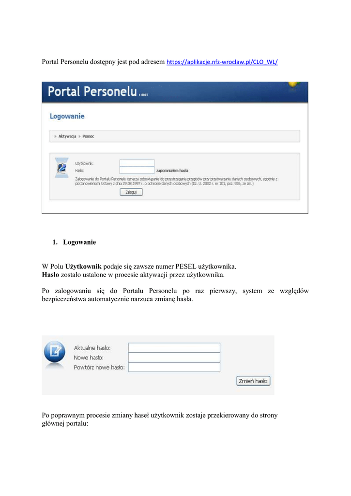 Portal Personelu dostępny jest pod adresem https://aplikacje.nfz-wroclaw.pl/CLO_WL/ 1. Logowanie W Polu Użytkownik podaje się zawsze numer PESEL użytkownika. Hasło zostało ustalone w procesie aktywacji przez użytkownika. Po zalogowaniu się do Portalu Personelu po raz pierwszy, system ze względów bezpieczeństwa automatycznie narzuca zmianę hasła. Po poprawnym procesie zmiany haseł użytkownik zostaje przekierowany do strony głównej portalu: 2. Zakładka Moje dane Zakładka ta służy do przeglądu danych użytkownika. Umożliwia również ustawienie mechanizmu przypominania hasła. Aby wejść w widok zakładki moje dane należy kliknąć na pogrubione pole Moje podstawowe dane. Przypominanie hasła Po otwarciu zakładki Moje Dane wybieramy zakładkę Dane do Odzyskiwania hasła. Domyślnie wyświetlany jest adres email użytkownika. W celu ustawienia danych do odzyskania hasła należy w polu Pytanie wpisać przygotowane przez siebie pytanie, w polu Odpowiedź – odpowiedź na postawione pytanie(przykład poniżej). Po uzupełnieniu obu rubryk należy kliknąć na przycisk Zatwierdź. W przypadku, gdy dojdzie do sytuacji, że użytkownik zapomni hasła, wystarczy skorzystać z opcji przypomnienia hasła. Aby skorzystać z przypomnienia hasła wystarczy kliknąć w opcje Zapomniałem hasła w formatce do logowania na głównej stronie portalu https://aplikacje.nfz-wroclaw.pl/CLO_WL/. Po wybraniu tej opcji pojawi się formatka ze zmianą hasła, jeśli wcześniej ustalono przypomnienie hasła to pojawi się pole ze sformułowanym pytaniem oraz rubryka na odpowiedź. W celu wygenerowania nowego hasła, należy wprowadzić dane użytkownika (PESEL), a następnie wystarczy wpisać odpowiedź w rubryce pod pytaniem oraz kliknąć: Wygeneruj nowe hasło. 3. Zakładka Recepty Zakładka służąca do generowania numerów recept. Aby zobaczyć pełną funkcjonalność należy nacisnąć przycisk Pokaż więcej. Po wejściu w zakładkę pojawia się dostępna funkcjonalność portalu w zakresie recept. a. Generacja numerów recept Po wybraniu opcji Generowanie numerów recept użytkownik zostaje przeniesiony do właściwej funkcjonalności związanej z receptami. W celu wygenerowania zakresów numerycznych recept należy kliknąć w pogrubione pole Wniosek. Po wybraniu pola Wniosek pojawia się formatka służąca do generowania recept. W rubryce Liczba bloczków należy wpisać żądaną ilość bloczków (jeden bloczek zawiera 100 recept). Ograniczenie wynosi 100 bloczków, w przypadku zapotrzebowania na większą ilość należy powtórzyć operacje. Po wyborze liczby bloczków należy nacisnąć przycisk zatwierdź. Po zatwierdzeniu żądanej ilości recept, pojawi się formatka z zakresem wygenerowanych numerów recept: Dane o otrzymanych zakresach można pobrać w formie pliku xml, korzystając z opcji [1]Pobierz. [1] [2] [3] Klikając na [2] Pobierz recepty otrzymujemy plik w formacie PDF, zawierający gotowe do wydruku recepty z naniesionymi numerami oraz danymi lekarza. Można również wydrukować zamówienie dla drukarni, wybierając opcję [3] Druk zamówienia. Z przygotowanym zamówieniem należy udać się do drukarni, wydrukować własne recepty z pliku pdf lub skorzystać z wielu dostępnych programów komputerowych do drukowania recept, wczytując pobrany plik w formacie xml. b. Przegląd historii złożonych wniosków c. Składanie wniosków o zastrzeganie recept – w przypadkach zagubienia bądź kradzieży recept Można zastrzec całe bloczki, bądź zakresy recept Wpisz numery recept d. Przegląd wniosków o anulowanie/zastrzeżenie recept 4. Nowości Zakładka będzie wykorzystywana do przekazywania komunikatów dla użytkowników Portalu Personelu. 5. Administracja i Opcje Zakładka służąca do zmiany hasła.