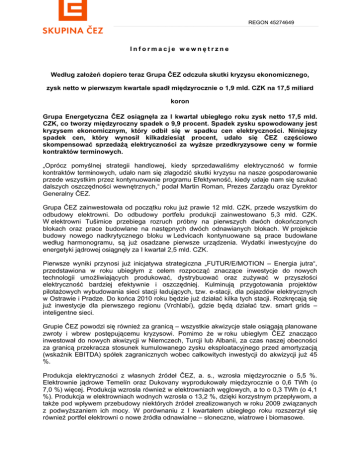 ČEZ, a. s. REGON 45274649 Informacje wewnętrzne Według założeń dopiero teraz Grupa ČEZ odczuła skutki kryzysu ekonomicznego, zysk netto w pierwszym kwartale spadł międzyrocznie o 1,9 mld. CZK na 17,5 miliard koron Grupa Energetyczna ČEZ osiągnęła za I kwartał ubiegłego roku zysk netto 17,5 mld. CZK, co tworzy międzyroczny spadek o 9,9 procent. Spadek zysku spowodowany jest kryzysem ekonomicznym, który odbił się w spadku cen elektryczności. Niniejszy spadek cen, który wynosił kilkadziesiąt procent, udało się ČEZ częściowo skompensować sprzedażą elektryczności za wyższe przedkryzysowe ceny w formie kontraktów terminowych. „Oprócz pomyślnej strategii handlowej, kiedy sprzedawaliśmy elektryczność w formie kontraktów terminowych, udało nam się złagodzić skutki kryzysu na nasze gospodarowanie przede wszystkim przez kontynuowanie programu Efektywność, kiedy udaje nam się szukać dalszych oszczędności wewnętrznych,“ podał Martin Roman, Prezes Zarządu oraz Dyrektor Generalny ČEZ. Grupa ČEZ zainwestowała od początku roku już prawie 12 mld. CZK, przede wszystkim do odbudowy elektrowni. Do odbudowy portfelu produkcji zainwestowano 5,3 mld. CZK. W elektrowni Tušimice przebiega rozruch próbny na pierwszych dwóch dokończonych blokach oraz prace budowlane na następnych dwóch odnawianych blokach. W projekcie budowy nowego nadkrytycznego bloku w Ledvicach kontynuowane są prace budowlane według harmonogramu, są już osadzane pierwsze urządzenia. Wydatki inwestycyjne do energetyki jądrowej osiągnęły za I kwartał 2,5 mld. CZK. Pierwsze wyniki przynosi już inicjatywa strategiczna „FUTUR/E/MOTION – Energia jutra“, przedstawiona w roku ubiegłym z celem rozpocząć znaczące inwestycje do nowych technologii umożliwiających produkować, dystrybuować oraz zużywać w przyszłości elektryczność bardziej efektywnie i oszczędniej. Kulminują przygotowania projektów pilotażowych wybudowania sieci stacji ładujących, tzw. e-stacji, dla pojazdów elektrycznych w Ostrawie i Pradze. Do końca 2010 roku będzie już działać kilka tych stacji. Rozkręcają się już inwestycje dla pierwszego regionu (Vrchlabí), gdzie będą działać tzw. smart grids – inteligentne sieci. Grupie ČEZ powodzi się również za granicą – wszystkie akwizycje stale osiągają planowane zwroty i wbrew postępującemu kryzysowi. Pomimo że w roku ubiegłym ČEZ znacząco inwestował do nowych akwizycji w Niemczech, Turcji lub Albanii, za czas naszej obecności za granicą przekracza stosunek kumulowanego zysku eksploatacyjnego przed amortyzacją (wskaźnik EBITDA) spółek zagranicznych wobec całkowitych inwestycji do akwizycji już 45 %. Produkcja elektryczności z własnych źródeł ČEZ, a. s., wzrosła międzyrocznie o 5,5 %. Elektrownie jądrowe Temelín oraz Dukovany wyprodukowały międzyrocznie o 0,6 TWh (o 7,0 %) więcej. Produkcja wzrosła również w elektrowniach węglowych, a to o 0,3 TWh (o 4,1 %). Produkcja w elektrowniach wodnych wzrosła o 13,2 %, dzięki korzystnym przepływom, a także pod wpływem przebudowy niektórych źródeł zrealizowanych w roku 2009 związanych z podwyższaniem ich mocy. W porównaniu z I kwartałem ubiegłego roku rozszerzył się również portfel elektrowni o nowe źródła odnawialne – słoneczne, wiatrowe i biomasowe. ČEZ, a. s. REGON 45274649 „Kryzys gospodarczy miał znaczący wpływ na zużycie elektryczności w Republice Czeskiej, ale w ostatnich 5 miesiącach widzimy już zmianę. Popyt na elektryczność w Republice Czeskiej według danych wstępnych za I kwartał 2010 wzrósł międzyrocznie o 1,4 %, po przeliczeniu na standard temperaturowy o 1,0 %. Zużycie odbiorców hurtowych wzrosło o 2,3 %, zużycie przedsiębiorczego handlu detalicznego było wyższe o 2,2 %, a zużycie gospodarstw domowych było o 0,3 % niższe. Całkowity łagodny wzrost popytu na elektryczność jest prawdopodobnie spowodowany powoli kończącym się kryzysem ekonomicznym,“ podał Michal Skalka, Dyrektor Działu Trading. Tabela: Wyniki gospodarcze Grupy ČEZ za I kwartał 2010 (mil. CZK) Dochody eksploatacyjne zmiana międzyroczna % 53 886 -0,1 % 27 331 -9,6 % Zysk przed opodatkowaniem 21 463 -10,5 % Zysk po opodatkowaniu 17 462 -9,9 % EBITDA (lub amortyzacją) Zysk eksploatacyjny przed