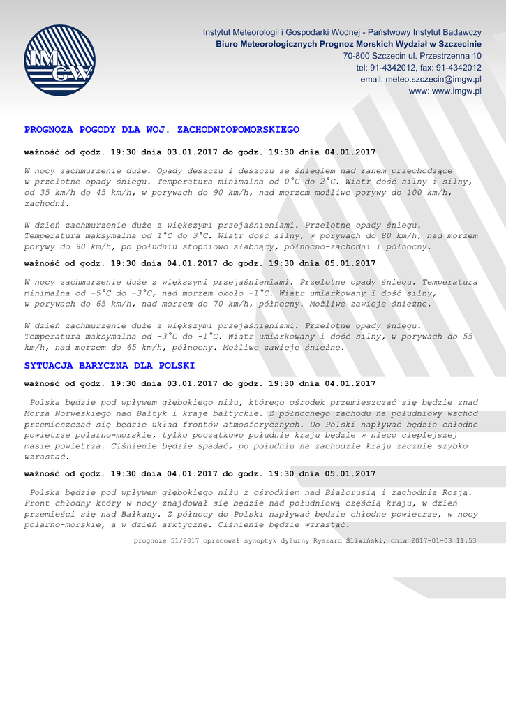 Instytut Meteorologii i Gospodarki Wodnej - Państwowy Instytut Badawczy Biuro Meteorologicznych Prognoz Morskich Wydział w Szczecinie 70-800 Szczecin ul. Przestrzenna 10 tel: 91-4342012, fax: 91-4342012 email: [email protected] www: www.imgw.pl PROGNOZA POGODY DLA WOJ. ZACHODNIOPOMORSKIEGO ważność od godz. 19:30 dnia 03.01.2017 do godz. 19:30 dnia 04.01.2017 W nocy zachmurzenie duże. Opady deszczu i deszczu ze śniegiem nad ranem przechodzące w przelotne opady śniegu. Temperatura minimalna od 0°C do 2°C. Wiatr dość silny i silny, od 35 km/h do 45 km/h, w porywach do 90 km/h, nad morzem możliwe porywy do 100 km/h, zachodni. W dzień zachmurzenie duże z większymi przejaśnieniami. Przelotne opady śniegu. Temperatura maksymalna od 1°C do 3°C. Wiatr dość silny, w porywach do 80 km/h, nad morzem porywy do 90 km/h, po południu stopniowo słabnący, północno-zachodni i północny. ważność od godz. 19:30 dnia 04.01.2017 do godz. 19:30 dnia 05.01.2017 W nocy zachmurzenie duże z większymi przejaśnieniami. Przelotne opady śniegu. Temperatura minimalna od -5°C do -3°C, nad morzem około -1°C. Wiatr umiarkowany i dość silny, w porywach do 65 km/h, nad morzem do 70 km/h, północny. Możliwe zawieje śnieżne. W dzień zachmurzenie duże z większymi przejaśnieniami. Przelotne opady śniegu. Temperatura maksymalna od -3°C do -1°C. Wiatr umiarkowany i dość silny, w porywach do 55 km/h, nad morzem do 65 km/h, północny. Możliwe zawieje śnieżne. SYTUACJA BARYCZNA DLA POLSKI ważność od godz. 19:30 dnia 03.01.2017 do godz. 19:30 dnia 04.01.2017 Polska będzie pod wpływem głębokiego niżu, którego ośrodek przemieszczać się będzie znad Morza Norweskiego nad Bałtyk i kraje bałtyckie. Z północnego zachodu na południowy wschód przemieszczać się będzie układ frontów atmosferycznych. Do Polski napływać będzie chłodne powietrze polarno-morskie, tylko początkowo południe kraju będzie w nieco cieplejszej masie powietrza. Ciśnienie będzie spadać, po południu na zachodzie kraju zacznie szybko wzrastać. ważność od godz. 19:30 dnia 04.01.2017 do godz. 19:30 dnia 05.01.2017 Polska będzie pod wpływem głębokiego niżu z ośrodkiem nad Białorusią i zachodnią Rosją. Front chłodny który w nocy znajdował się będzie nad południową częścią kraju, w dzień przemieści się nad Bałkany. Z północy do Polski napływać będzie chłodne powietrze, w nocy polarno-morskie, a w dzień arktyczne. Ciśnienie będzie wzrastać. prognozę 51/2017 opracował synoptyk dyżurny Ryszard Śliwiński, dnia 2017-01-03 11:53