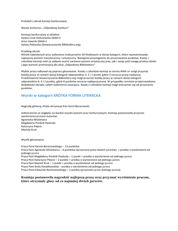Protokół z obrad komisji konkursowej Nazwa konkursu: „Odjazdowy konkurs” Komisja konkursowa w składzie: Sylwia Czub-Kiełczewska (MAK+) Artur Sawicki (MAK+) Sylwia Piekarska (Stowarzyszenie Bibliosfera.org). Przebieg obrad: Wśród nadesłanych prac wyłoniono maksymalnie 10 finałowych w danej kategorii, które reprezentowały najwyższy poziom merytoryczny i artystyczny. Następnie przystąpiono do przyznawania punktów. Każdy z członków komisji miał za zadanie ocenić zarówno poziom artystyczny prac, jak i wziąć pod uwagę przekaz dzieła i jego wartość promocyjną dla akcji „Odjazdowy Bibliotekarz”. Wybór pracy odbywał się poprzez głosowanie. Każdy z członków komisji ze strony MAK-a+ mógł przyznać każdej pracy w ramach danej kategorii odpowiednio 3, 2 i 1 punkt, gdzie 3 oznacza pracę najlepszą. Przedstawiciel Stowarzyszenia Bibliosfera.org mógł przyznać każdej pracy w ramach danej kategorii odpowiednio 6, 4 i 2 punkty, gdzie 6 punktów oznacza najlepszą pracę. W przypadku remisów przeprowadzano dodatkowe obrady, celem wyłonienia zwycięzcy. Każdy z członków komisji mógł wstrzymać się od przyznania punktów. Wyniki w kategorii KRÓTKA FORMA LITERACKA Nagrodę główną, iPoda otrzymuje Pan Karol Baranowski. Jednocześnie ze względu na bardzo wysoki poziom prac konkursowych, komisja postanowiła przyznać wyróżnienia pracom autorów: Agnieszka Mickiewicz Magdalena Pordzik-Paskuda Katarzyna Plejnis Mariola Kruk Wyniki głosowania Praca Pana Karola Baranowskiego – 12 punktów Praca Pani Agnieszki Mickiewicz – 6 punktów (przyznane przez dwóch jurorów) + prośba o wyróżnienie od jednego jurora Praca Pani Magdaleny Pordzik-Paskudy – 1 punkt + prośba o wyróżnienie od jednego jurora Praca Pani Katarzyna Plejnis – 2 punkty + prośba o wyróżnienie od jednego jurora Praca Pani Marioli Kruk – 1 punkt + prośba o wyróżnienie od jednego jurora Praca Pani Anity Kwiatkowskiej – prośba o wyróżnienie od jednego jurora Praca Pana Edwarda Remiszewskiego – 2 punkty (przyznane przez jednego jurora) Komisja postanowiła nagrodzić najlepszą pracę oraz przyznać wyróżnienie pracom, które otrzymały głosy od co najmniej dwóch jurorów. Uzasadnienie: Praca Pana Karola Baranowskiego Sylwia Czub-Kiełczewska: Mój absolutny faworyt. Maksymalna liczba punktów za nietuzinkowe podejście do tematu. Za ciekawą i zabawną formę. Za syna, który rośnie "na pożytek i chwałę zawodu bibliotekarza" i czytelnika, który przewiózł na swoim rowerze aż 126 książek. Artur Sawicki: - wciągająca relacja - dobry pomysł na relację - jakbym tam był i wszystko na własne oczy widział Sylwia Piekarska: Rzeczywiście świetny, wciągający i lekko napisany tekst. Wciąga czytelnika i wywołuje uśmiech. Najwyższa nota za świetny pomysł i realizację. Praca Pani Agnieszki Mickiewicz Artur Sawicki: - wstęp: rozważania na temat % i próba wyjaśnienia magicznego zwrotu „przynajmniej jednokrotny kontakt z jakąś książką” - długie i cierpliwe oczekiwanie na „Odjazdowego Bibliotekarza” - lekka przyjemna forma, a do tego widać, że dla chcącego nic trudnego. Nawet dodatkowe 54 km nie są przeszkodą Sylwia Piekarska: Bardzo dobrze i ciekawie napisany tekst. Czyta się przyjemnie i z zaciekawieniem. Duży plus za pomysł z "procentami". Sylwia Czub-Kiełczewska: Za pomysł opisania "dobrych" i "złych" procentów Praca Pani Magdaleny Pordzik-Paskudy Artur Sawicki: - dobry i ciekawy opis akcji - bookcrossing i integracja środowiska czytelników - nadzieja na dłuższą trasę w następnym roku Sylwia Czub-Kiełczewska: Relacja jest krótka, ale bardzo ciekawa i wciągająca Praca Pani Katarzyny Plejnis Sylwia Piekarska: Za ciekawą i odmienną formę relacji. Wiersz bardzo sympatyczny i przyjemny w czytaniu. Sylwia Czub-Kiełczewska Za twórcze podejście literackie Praca Pani Marioli Kruk Sylwia Czub-Kiełczewska: Za informacje z okopów i przejęcie paczki z aprowizacją od sponsorów. Zabawnie i z polotem. Dynamiczna i bardzo ciekawa relacja. Sylwia Piekarska: Bardzo ciekawa relacja