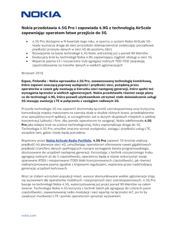 Nokia przedstawia 4.5G Pro i zapowiada 4.9G z technologią AirScale zapewniając operatom łatwe przejście do 5G 4.5G Pro dostępne w IV kwartale tego roku, w oparciu o system Nokia AirScale 5Gready wyznacza drogę do sieci przyszłości dziesięciokrotne zwiększając początkowe prędkości przesyłu danych w sieci 4G do poziomu Gb/s Rozwiązanie na bazie technologii 4.5G Nokii, wdrożonej już u ponad 90 klientów Ewolucyjny krok ku technologii Nokia 4.9G zapewniający ciągłość obsługi w sieci 5G Wsparcie pasma 43 i rozszerzony tryb agregacji nośnych TDD-FDD zaspokoją zapotrzebowanie na transfer danych w wielkich aglomeracjach Wrzesień 2016 Espoo, Finlandia – Nokia wprowadza 4.5G Pro, zaawansowaną technologię komórkową, która zapewni znaczącą poprawę wydajności i prędkości sieci, pożądaną przez operatorów w czasie gdy ewoluują w kierunku sieci następnej generacji, która spełni też wymagania łączności w wielkich aglomeracjach. Nokia przedstawiła również swoje plany co do technologii 4.9G, która pozwoli użytkownikom utrzymać stałe doświadczenie usługi 5G stosując ewolucję LTE w połączeniu z zasięgiem radiowym 5G. Przyszła technologia 5G ma zapewnić ekstremalą łączność szerokopasmową oraz krytyczną komunikacjię między maszynami na szeroką skalę w służbie różnych branż, przedsiębiorstw oraz specjalistycznych aplikacji, w szczególności zaś w dużych skupiskach miejskich o wielkiej koncentracji ludności i firm. Aby pomóc operatorom to osiągnąć, Nokia zdefiniowała 4.5G Pro jako kolejny krok na scieżce technologicznej, który zoptymalizuje drogę do 5G. Technologia 4.5G Pro umożliwi znaczny wzrost wydajności, zasięgu i prędkości usług LTE, wszędzie tam, gdzie i kiedy będą potrzebne. Wspierany przez Nokia AirScale Radio Portfolio, 4.5G Pro zapewni 10-krotnie większą prędkość niż pierwsze sieci 4G, umożliwiając operatorom oferowanie nawet gigabitowych prędkości transferu danych spełniających rosnące wymagania świata programowalnego, dostosowane do urządzeń następnej generacji. Korzystając z technik rozszerzonego trybu agregacji nośnych aż do 5 częstotliwości, operatorzy będą w stanie wykorzystać swoje sparowane (FDD) i niesparowane (TDD) bloki licencjonowanych częstotliwości, jak również nielicencjonowane pasma zgodnie z krajowymi regulacjami, wspierane przez nadchodzącą generację urządzeń końcowych. Wraz ze stałym wzrostem populacji miast, wysoce skomunikowane wielkie aglomeracje stają się wyzwaniem dla operatorów mobilnych i stacjonarnych sieci szerokopasmowych. 4.5G Pro bazuje na technologii Nokia 4.5G, wykorzystywanej już przez ponad 90 klientów na całym świecie. Technologia Nokia 4.5G korzysta z technik takich jak agregacja do czterech pasm częstotliwości, zaawansowanej radio modulacji i sieci opartej na łączności IoT, po to by zwiększyć możliwości LTE i pomóc operatorom sprostać wyzwaniom. nokia.com Podczas gdy 4,5G Pro koncentruje się na ekosystemie urządzeń użytkownika na rok 2017 oraz gotowości sieci do 5G, wdrażanie w przyszłości Nokia 4.9G przyniesie znaczącą poprawę wydajności i szybkości transmisji danych oraz redukcji opóźnień sieci, aby umożliwić użytkownikom doświadczanie korzyści płynących z użytkowania sieci 5G. Technologia 4.9G obejmować będzie możliwości dalszego zwiększania wydajności i prędkości do kilku gigabitów na sekundę, w tym umożliwienie agregacji dodatkowych nośnych, otwarcie na dodatkowe licencjonowane i nielicencjonowane częstotliwości, a także postęp systemów radiowych w celu umożliwienia wykorzystania wysokozaawansowanych anten kierunkowych oraz w celu umożliwienia zsumowania sygnałów wysyłanych przez zwielokrotnione scieżki transmisji i odbioru. Ponadto, technologia ta wykorzysta sieci w chmurze razem z inteligencją dodaną do krawędzi, zmniejszając opóźnienia poniżej 10 ms. Wsparcie dla pasma 43 i wcześniej ogłoszonego pasma 42 pozwoli operatorom na całym świecie skorzystać z nowodostępnego zakresu TDD-LTE. Dzięki modyfikacjom pasma Citizen Broadband Radio Service (CBRS), operatorzy w USA będą w stanie wykorzystać zakres 3.5GHz 4G aby niezwykle zwiększyć wydajność. Ken Rehbehn, główny analityk w 451 Research powiedział: "Wyjątkowe osiągnięcia w technologii LTE w ciągu ostatnich sześciu lat pozwalają użytkownikom cieszyć się szczytowymi wartościami 1 Gb/s. To główny punkt pośredni w podróży do 5G, który wyznacza początek nowej era mobilnej sieci szerokopasmowej między wczesnymi systemami 4G oraz przyszłą technologia 5G. Oznacza to więcej niż tylko zwiększenie prędkości, gdyż ostatnie udoskonalenia LTE przynoszą potężne nowe możliwości wspierające innowacyjność przedsiębiorstw. Krok Nokii w celu wprowadzania tych możliwości w sieciach operatorskich jest ważny, ponieważ zaawansowana funkcjonalność LTE pozostaje istotnym czynnikiem dla wysokiej wydajności łączności komórkowej, nawet jak 5G się zakorzeni". Samih Elhage, prezes Mobile Networks w firmie Nokia, powiedział: " Podczas gdy stale połączony świat ludzi i Internet Rzeczy napędza ogromne zapotrzebowanie na transfer danych, prędkości które umożliwi 5G będą kolosalnym krokiem w ewolucji sieci operatorów. Jednak dzięki naszym technologiom 4.5G, 4.5G Pro i 4.9G, zapewnimy sprawną ścieżkę ewolucji, która pozwoli im zwiększyć wydajność i poprawić doświadczenia użytkownika a zarazem tworzyć nowe możliwości osiągania przychodów." Czy wiesz, że…? Gartner w swoim raporcie Magic Quadrant for LTE infrastructure uznaje Nokię za lidera rynku infrastruktury mobilnej LTE Nokia i Grupa Deutsche Telekom zademonstrowała niedawno w Polsce prędkości rzędu 1.2 Gb/s wykorzystując technologie AirScale wraz z Carrier Aggregation oraz 4x4 MIMO Więcej informacji Web Page: LTE Web Page: TD-LTE Web Page: Nokia AirScale Radio Access nokia.com Co