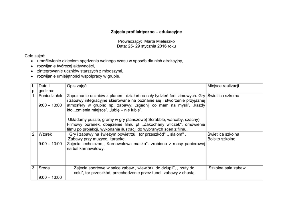 Zajęcia profilaktyczno – edukacyjne Prowadzący: Marta Mieleszko Data: 25- 29 stycznia 2016 roku Cele zajęć: umożliwienie dzieciom spędzenia wolnego czasu w sposób dla nich atrakcyjny, rozwijanie twórczej aktywności, zintegrowanie uczniów starszych z młodszymi, rozwijanie umiejętności współpracy w grupie. L. Data i p. godzina: 1. Poniedziałek 9:00 – 13:00 2. Wtorek 9:00 – 13:00 3. Środa 9:00 – 13:00 Opis zajęć Miejsce realizacji Zapoznanie uczniów z planem działań na cały tydzień ferii zimowych. Gry Świetlica szkolna i zabawy integracyjne skierowane na poznanie się i stworzenie przyjaznej atmosfery w grupie; np. zabawy: „zgadnij co mam na myśli”, „każdy kto...zmienia miejsce”, „lubię – nie lubię”. Układamy puzzle, gramy w gry planszowe( Scrabble, warcaby, szachy). Filmowy poranek, obejrzenie filmu pt ,,Zakochany wilczek'', omówienie filmu po projekcji, wykonanie ilustracji do wybranych scen z filmu. Gry i zabawy na świeżym powietrzu,, tor przeszkód'' ,, slalom'' . Świetlica szkolna Zabawy przy muzyce, karaoke. Boisko szkolne Zajęcia techniczne,, Karnawałowa maska''- zrobiona z masy papierowej na bal karnawałowy. Zajęcia sportowe w salce zabaw „ wiewiórki do dziupli”, „ rzuty do celu”, tor przeszkód, przechodzenie przez tunel, zabawy z chustą. Szkolna sala zabaw Ćwiczenia relaksacyjno-oddechowe z watą. Wprawianie jej w ruch. Pokonanie trasy z watą na dłoni. „ Gazetowe tańce”: tańce w parach z balonem na gazecie. 4. Czwartek 9:00 – 13:00 5. Piątek 9:00 – 13:00 Poranek z książką, czytanie bajek o zimie, układanie fraszek o feriach, Świetlica szkolna konkurs literacki pt. Zimowa przygoda, scenki dramowe, inscenizacja wybranych bajek. Zajęcia komputerowe, prace plastyczne w Poincie- lodowe budowle, śnieżny krajobraz. Zabawy ruchowe przy muzyce,, W Karnawałowym rytmie''. Świetlica szkolna Zabawy sportowe na świeżym śniegu, konkurs na rzeźbę śniegową. Zabawy związane z porządkowaniem sali, podsumowanie zajęć. Zajęcia komputerowo - świetlicowe. Prowadzący: Anna Samulewicz. Data: 18-22.01.2016 r. Cele zajęć: - wyrabianie umiejętności właściwej organizacji czasu wolnego, - kształtowanie umiejętności odpowiedzialności za bezpieczeństwo swoje i innych, - kształtowanie postawy asertywnej, - wdrażanie do zrozumienia własnych pozytywnych i negatywnych emocji, - rozwijanie umiejętności porozumiewania się w grupach rówieśniczych, - ukazywanie wartości płynących z rozwoju własnych zainteresowań, koleżeństwa i przyjaźni, - kształtowanie umiejętności organizacyjnych, - rozładowywanie napięć i stresów życia szkolnego, wprowadzanie pogodnego nastroju. Czas zajęć: 9:00- 13:00 Termin: 18.01.2016- 22.01.2016 r. Miejsce: świetlica szkolna, sala komputerowa Lp. Data Tematyka zajęć 1. 23.02.2015 r. poniedziałek 2 24.02.2015 r. wtorek 3 25.02.2015 r. środa 4 26.02.2015 r. czwartek 5 27.02.2015 r. piątek - Gry i zabawy integracyjne „Kalambury”, „Zgadnij, kto to” ( w przypadku śniegu- zabawy na śniegu) Wykonanie plakatu w programie graficznym „Bezpieczne zabawy na śniegu i lodzie” - Bezpiecznie w sieci- korzystanie ze stron i gier dla dzieci- rozmowa o szkodliwości niektórych gier i możliwości uzależnienia się od komputera - Wędrówki po Internecie – gry i zabawy multimedialne. Burza mózgów dotycząca bezpiecznego używania komputerów oraz internetu, rozsądne korzystanie z zasobów internetowych. - Portale społecznościowe - Zabawy i gry świetlicowe - Zabawy i gry na śniegu -„ Mój przyjaciel z bajki”- wykonanie ilustracji do ulubionej bajki - Gra w „ Scrablle’ - Komputer moim przyjacielem- zasady bezpiecznego i higienicznego korzystania z komputera, poznanie podstaw obsługi, wykonanie pracy na zadany temat w edytorze tekstu - Zabawy na śniegu - Wykonanie masek karnawałowych - Turniej gry w Scrablle. - Internet największa sieć komputerowa na świecie. Uczymy się korzystać z Internetu i wyszukiwać informacje. Nowoczesna komunikacja internetowa- omówienie zalet i zagrożeń - Rozmowa nt. „ Co to jest stres i jak sobie z nim radzić” - Zabawy teatralne „ Kra”, „ Zwierzęta”, spontany- ćwiczenie zadań manualnych - Rola komunikatorów w nowoczesnym społeczeństwie Opracowała: Anna Samulewicz Prowadzący: Agnieszka Raźna Data: 18-22.01.2016r. Cele zajęć: - umożliwienie dzieciom ciekawego spędzenia czasu w grupie rówieśników, - rozwijanie umiejętności porozumiewania się w grupach rówieśniczych, - rozwijanie umiejętności działania zespołowego, - kształtowanie umiejętności organizacyjnych, - rozbudzenie potrzeby czytania. L.p. 1. Data/godzina 18.01.2016r. 9:00-13:00 Tematyka zajęć Zapoznanie z programem ferii. Pogadanka na temat bezpieczeństwa na zajęciach. Regulamin ferii zimowych 2016. Spisanie kontraktu dotyczącego zasad zachowania się podczas wszystkich zajęć Miejsce realizacji świetlica szkolna świetlica szkolna Podróż do Krainy Bajek- głośne czytanie wybranych fragmentów z bajek. Rozmowa na temat przeczytanych fragmentów oraz scenki dramowe świetlica szkolna Gry i zabawy w grupach - gry planszowe, puzzle 2. 19.01.2016r. 9:00-13:00 Przypomnienie zasad gry w dwa ognie (bezpieczeństwo) sala gimnastyczna świetlica szkolna Konkurs plastyczny „Bezpieczne ferie” świetlica szkolna Tańce integracyjne świetlica szkolna Zabawy dydaktyczne – zgadywanki, rebusy, krzyżówki 3. 20.01.2016r. 9:00-13:00 .„Poranek filmowy” –projekcje filmów animowanych świetlica szkolna Zajęcia ruchowe sala gimnastyczna świetlica szkolna 4. 21.01.2016r. 9:00-13:00 Nauka pląsów: „Kaczuszka”, „Niedźwiadek”, „Zorro” Zajęcia plastyczne – kolorowanie obrazków o tematyce zimowej 22.01.2016r. 9:00-13:00 Zajęcia sportowe - lodowisko Zabawy „Co postać z bajki ma w kieszeni” i „Zgadnij kim jesteś?” świetlica szkolna SOSiR 5. świetlica szkolna boisko szkolne Gry 