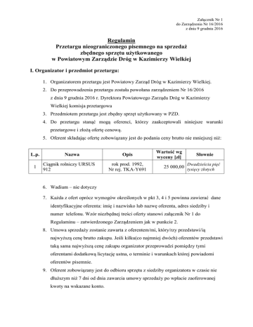 Załącznik Nr 1 do Zarządzenia Nr 16/2016 z dnia 9 grudnia 2016 Regulamin Przetargu nieograniczonego pisemnego na sprzedaż zbędnego sprzętu użytkowanego w Powiatowym Zarządzie Dróg w Kazimierzy Wielkiej I. Organizator i przedmiot przetargu: 1. Organizatorem przetargu jest Powiatowy Zarząd Dróg w Kazimierzy Wielkiej. 2. Do przeprowadzenia przetargu została powołana zarządzeniem Nr 16/2016 z dnia 9 grudnia 2016 r. Dyrektora Powiatowego Zarządu Dróg w Kazimierzy Wielkiej komisja przetargowa 3. Przedmiotem przetargu jest zbędny sprzęt użytkowany w PZD. 4. Do przetargu stanąć mogą oferenci, którzy zaakceptowali niniejsze warunki przetargowe i złożą ofertę cenową. 5. Oferent składając ofertę zobowiązany jest do podania ceny brutto nie mniejszej niż: L.p. 1 Nazwa Ciągnik rolniczy URSUS 912 Opis rok prod. 1992, Nr rej. TKA-Y691 Wartość wg wyceny [zł] 25 000,00 Słownie Dwadzieścia pięć tysięcy złotych 6. Wadium – nie dotyczy 7. Każda z ofert oprócz wymogów określonych w pkt 3, 4 i 5 powinna zawierać dane identyfikacyjne oferenta: imię i nazwisko lub nazwę oferenta, adres siedziby i numer telefonu. Wzór niezbędnej treści oferty stanowi załącznik Nr 1 do Regulaminu – zatwierdzonego Zarządzeniem jak w punkcie 2. 8. Umowa sprzedaży zostanie zawarta z oferentem/mi, który/rzy przedstawi/ią najwyższą cenę brutto zakupu. Jeśli kilku(co najmniej dwóch) oferentów przedstawi taką sama najwyższą cenę zakupu organizator przeprowadzi pomiędzy tymi oferentami dodatkową licytację ustna, o terminie i warunkach której powiadomi oferentów pisemnie. 9. Oferent zobowiązany jest do odbioru sprzętu z siedziby organizatora w czasie nie dłuższym niż 7 dni od dnia zawarcia umowy sprzedaży po wpłacie zaoferowanej kwoty na wskazane konto. II. Miejsce, termin i sposób składania ofert: 1. Oferty należy składać do sekretariatu Powiatowego Zarządu Dróg w Kazimierzy Wielkiej ul. Koszycka 29 28-500 Kazimierza Wielka pokój nr 102 do dnia 14 grudnia 2016 roku do godz. 11:00. W przypadku składania ofert drogą pocztową decyduje data wpływu do organizatora, przy czym rozpatrywane będą droga pocztowa tylko oferty, które poczta doręczy najpóźniej w ostatnim dniu składania ofert do godz. 11:00. 2. Każda z ofert powinna znajdować się w zaklejonej kopercie, uniemożliwiającej zapoznanie się ze złożoną ofertą bez jej otwarcia. W jednej kopercie może znajdować się oferta na zakup jednego lub kilku pozycji sprzętowych. 3. Oferent zamieszcza na kopercie adnotację: „Oferta zakupu ciągnika rolniczego Nie otwierać do dnia 14 grudnia 2016 roku do godziny 11:00” 4. Otwarcie ofert jest jawne i nastąpi w dniu 14 grudnia 2016 roku o godzinie 11:05 w siedzibie organizatora. 5. Oferta nie spełniająca wymagań wskazanych przez organizatora nie będzie przez niego rozpatrywana. 6. Wynikach przetargu albo o jego zamknięciu bez dokonania wyboru jakiekolwiek oferty organizator powiadomi wszystkich oferentów pisemnie. III. Postanowienia końcowe. 1. Osoba upoważnioną do kontaktu z oferentami jest: − Edward Krupa – Dyrektor Powiatowego Zarządu Dróg w Kazimierzy Wielkiej. − Stanisław Kilijan - Kierownik Sekcji Dróg i Mostów − Tomasz Dalewicz – Sekcja Dróg i Mostów Pod nr telefonu: (41) 35-21-172 w godz. 7:00-15:00. 2. Sprzęt przeznaczony do sprzedaży można oglądać po wcześniejszym uzgodnieniu od poniedziałku do piątku w godz. 7:00-15:00. Załącznik Nr 1 do Regulaminu przetargu Oferta Złożona przez: …………………………………………………………………………………….. Imię i nazwisko oferenta/nazwa oferenta ……………………………………………………………………………………………………… Adres zamieszkania/ adres siedziby oferenta ………………………………………………… Numer telefonu oferenta 1. Oferent oświadcza, że akceptuje warunki przetargowe sprecyzowane w Regulaminie Przetargu nieograniczonego pisemnego na sprzedaż zbędnego sprzętu użytkowanego w PZD. 2. Oferent oświadcza, iż oferuje: L.p. 1 Nazwa Cena ofertowa [zł] słownie Ciągnik rolniczy URSUS 912 rok prod. 1992 za sprzęt opisany w załączniku dołączonym do Regulaminu powołanego w punkcie 1. ……………………………………………….. Data i podpis oferenta