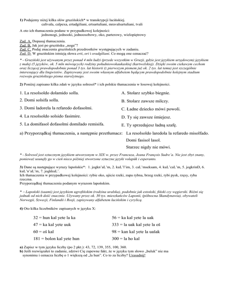 1) Podajemy niżej kilka słów gruzińskich* w transkrypcji łacińskiej. caltvala, calpexa, ertadgiliani, ertsartuliani, mravalsartuliani, tvali A oto ich tłumaczenia podane w przypadkowej kolejności: jednonogi, jednooki, jednoosobowy, oko, parterowy, wielopiętrowy Zad. A. Dopasuj tłumaczenia. Zad. B. Jak jest po gruzińsku „noga”? Zad. C. Podaj znaczenia gruzińskich przedrostków występujących w zadaniu. Zad. D. W gruzińskim istnieją słowa erti, ori i oradgiliani. Co mogą one oznaczać? * - Gruziński jest używanym przez ponad 4 mln ludzi (przede wszystkim w Gruzji, gdzie jest językiem urzędowym) językiem z małej (5 języków, ok. 5 mln mówiących) rodziny południowokaukaskiej (kartwelskiej). Dzięki swoim ciekawym cechom oraz liczącej prawdopodobnie ponad 3 tys. lat historii (z pierwszym pismem już ok. 2 tys. lat temu) jest szczególnie interesujący dla lingwistów. Zapisywany jest swoim własnym alfabetem będącym prawdopodobnie kolejnym stadium rozwoju gruzińskiego pisma starożytnego. 2) Poniżej zapisano kilka zdań w języku solresol* i ich polskie tłumaczenia w losowej kolejności. 1. La resolsoldo dolamido solla. A. Stolarz szybko biegnie. 2. Domi solsifa solla. B. Stolarz zawsze milczy. 3. Domi ladorela la refaredo dofasolmi. C. Ładne dziecko mówi powoli. 4. La resolsoldo solsido fasimire. D. Ty się zawsze śmiejesz. 5. La domifasol dofasolmi domilado remisifa. E. Ty sprzedajesz ładną szafę. a) Przyporządkuj tłumaczenia, a następnie przetłumacz: La resolsoldo laredola la refaredo misolfado. Domi fasisol lasol. Starzec nigdy nie mówi. * - Solresol jest sztucznym językiem utworzonym w XIX w. przez Francuza, Jeana François Sudre’a. Nie jest zbyt znany, ponieważ usunęły go w cień nieco później stworzone sztuczne języki volapük i esperanto. 3) Dane są następujące wyrazy lapońskie*: 1. jogkn’aL’m, 2. kuL’l’im, 3. caL’mseksam, 4. kuL’caL’m, 5. jogkrinD, 6. kuL’n’aL’m, 7. jogkkuL’. Ich tłumaczenia w przypadkowej kolejności: rybie oko, ujście rzeki, zupa rybna, brzeg rzeki, rybi pysk, rzęsy, ryba rzeczna. Przyporządkuj tłumaczenia podanym wyrazom lapońskim. * − Lapoński (saami) jest językiem ugrofińskim (rodzina uralska), podobnie jak estoński, fiński czy węgierski. Różni się jednak od nich dość znacznie. Używany przez ok. 30 tys. mieszkańców Laponii, (północna Skandynawia), obywateli Norwegii, Szwecji, Finlandii i Rosji, zapisywany alfabetem łacińskim i cyrylicą. 4) Oto kilka liczebników zapisanych w języku X: 32 = hun kal yete la ka 56 = ka kal yete la uak 47 = ka kal yete uuk 333 = la uak kal yete la oš 60 = oš kal 98 = kan kal yete la uašak 181 = bolon kal yete hun 300 = la ho kal a) Zapisz w tym języku liczby (po 2 pkt.): 43, 72, 139, 355, 100, 360. b) Jeśli rozwiązałeś to zadanie, zdziwi Cię zapewne fakt, że w języku tym słowo „buluk” nie ma synonimu i oznacza liczbę o 1 większą od „la hun”. Co to za liczby? Uzasadnij! Przetłumacz (chyba wszystkie słowa daje się albo zgadnąć, albo ustalić na podstawie tego, co już o esperancie wiemy!): Ĉu il parolis angle? Ne, il parolis pole. Ĉu ŝi komprenas itale? Jes, ŝi parolas itale tre bene. Ili ne komprenas vin. Ni parolos ruse. Dankon, mi ne komprenas esperante kaj mi preferas paroli mian lingvon. Ĉu ti vedas lian patron?, Ne, ... [uzupełnij!] Mi estas Polo. Bardzo dziękuję. Jesteś Polką? Rozumiem wasz język. Widzi Pani ich mamę? 3) Oto kilka zdań w języku papiamentu* wraz z tłumaczeniami: 1. Mi ta atimabo. = Kocham cię. 2. Bo yiu homber tabata mira Piter. = Twój syn widział Piotra. 3. E ruman homber ta korda e muhé. = Brat ją wspomina. 4. Mi ruman muhé ta laba e mucha muhé. = Moja siostra myje dziewczynkę. 5. Maria tabata salbabosnan. = Maria was uratowała. 6. Bosnan lo mustra nos buki. = Pokażecie naszą książkę. Przetłumacz: Bo ta labanos. Piter lo mira mi yiu muhé. Maria tabata korda e buki. Kochasz nas. Piotr kochał córkę. Chłopiec mnie widział. On umyje chłopca. Nasz syn zobaczy książkę. Wspominamy Marię. E ruman ta mira e yiu. * - Papiamentu to język powstały w II poł. XVII w. na należących do Holandii wyspach „ABC” (Aruba, Bonaire i Curaçao [wym. „kuresau”]), leżących na M. Karaibskim w archipelagu Małych Antyli; jest mieszanką używanych przez tamtejszych Indian i Afrykańczyków zniekształconych wersji portugalskiego, galicyjskiego (język używany w Galicji – regionie północno-zachodniej Hiszpanii) i hiszpańskiego z domieszkami holenderskiego, angielskiego i francuskiego oraz ich języków ojczystych; jeden z niewielu języków kreolskich używanych do dziś (200-300 tys. mówiących, literatura), wśród nich dość wyjątkowy jako język tonalny (ton głosu może decydować o znaczeniu wyrazu). Zad. 2 (A.G. Pazelskaja, zadanie z I etapu XXXIII Tradycyjnej Otwartej Olimpiady Lingwistyki i Matematyki, Moskwa 2002) Oto drzewo genealogiczne pewnej baskijskiej rodziny: Znakami zapytania zastąpiono imiona Ines, Kontxi, Felix i Andres (w niewiadomym porządku). Oto kilka relacji między członkami tej rodziny zapisanych po baskijsku *: Ines Mikelen emaztea da. Monika Kontxiren ahizpa da. Inma Manuren arreba da. Iker Joseparen senarra da. Mikel Felixen anaia da. Andres Iboneren neba da. Ibone eta Felix senar-emazteak dira. Andres eta Ibone Emilioren seme-alabak dira. Manu Iboneren semea da. Ibone, Ines, Inma, Josepa, Miren, Monika to imiona żeńskie; Andres, Emilio, Felix, Iker, Manu, Mikel – – męskie. Litery s i x czyta się podobnie jak polskie sz, z – jak polskie s, tx – jak miękkie cz (angielskie ch), j to polskie dź, h jest nieme. a) Zidentyfikuj znaki zapytania w diagramie (po 1 pkcie). b) Czy z danych zadania można wywnioskować, jakiej płci jest Kontxi? Uzasadnij. (2 pkt.) c) Uzupełnij baskijskie zdania dotyczące tej samej rodziny (po 1 pkcie za zdanie): Kontxi ___ ahizpa da. Ibone Andresen ___ Manu Inmaren ___