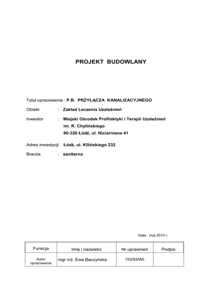PROJEKT BUDOWLANY Tytuł opracowania : P.B. PRZYŁĄCZA KANALIZACYJNEGO Obiekt : Zakład Leczenia UzaleŜnień Inwestor : Miejski Ośrodek Profilaktyki i Terapii UzaleŜnień im. R. Chylińskiego 90-320 Łódź, ul. Niciarniana 41 Adres inwestycji: Łódź, ul. Kilińskiego 232 BranŜa : sanitarna Data : maj 2010 r. Funkcja Autor opracowania Imię i nazwisko mgr inŜ. Ewa Baczyńska Nr uprawnień 153/93/WŁ Podpis 2 ZAWARTOŚĆ OPRACOWANIA I. Opis techniczny II. Część graficzna 1. Plan zagospodarowania 1:500 2. Profil podłuŜny 1:100/250 3. Studnia rewizyjna 1:25 4. Schemat zabudowy wodomierza schemat III. Załączniki 1. Wymagania techniczne ZWiK Sp. z o.o. 2. Uzgodnienie ZWiK Sp. z o.o. 3. Uzgodnienie ZUDP 3 OŚWIADCZENIE Wymagane zgodnie z art. 20, ust. 4 ustawy z dnia 7 lipca 1994 r. Prawo budowlane /tekst jednolity Dz. U. Nr 207/203, poz. 2016 z późniejszymi zmianami (Dz. U. Nr 93/2004, poz. 888) Oświadczam, Ŝe: „Projekt budowlany Przyłącza kanalizacyjnego dla Zakładu Leczenia UzaleŜnień Miejskiego Ośrodka Profilaktyki i Terapii UzaleŜnień przy ul. Kilińskiego 232 w Łodzi. ” został sporządzony zgodnie z obowiązującymi przepisami oraz zasadami wiedzy technicznej. Podpis projektanta: 4 OPIS TECHNICZNY I. Podstawa opracowania. Projekt opracowano na podstawie następujących materiałów: - mapy terenu do celów projektowych w skali 1:500, - Wymagań technicznych TT.W-412 - 42281/09 z dnia 25.11.2009 r. podłączenia do miejskiej sieci kanalizacyjnej wydanych przez ZWiK Sp. z o.o., - dokumentacji archiwalnej sieci kanalizacyjnej w ul. Kilińskiego w Łodzi Nr arch. ZWiK 203643, - obowiązujących norm i przepisów projektowania. II. Inwestor i adres inwestycji. Inwestorem jest Miejski Ośrodek Profilaktyki i Terapii UzaleŜnień w Łodzi ul. Niciarniana 41. Adres inwestycji: Łódź, ul. Kilińskiego 232 III. Przedmiot opracowania. Niniejsze opracowanie obejmuje projekt jednostadiowy przyłącza kanalizacyjnego z posesji przy ul. Kilińskiego 232 do miejskiej sieci kanalizacji ogólnospławnej. IV. Stan istniejący. W chwili obecnej ścieki z budynków i terenu Ośrodka przy ul. Kilińskiego 232 są odprowadzane do kanału ogólnospławnego w ul. Kilińskiego poprzez przyłącze kanalizacyjne posesji sąsiedniej Kilińskiego 230. Inwestor postanowił rozdzielić swoją instalację kanalizacyjną od instalacji działki sąsiedniej budując własne przyłącze kanalizacyjne. W ulicy Kilińskiego, przy której połoŜona jest w/w posesja, istnieje kanał ogólnospławny z rur kamionkowych o średnicy 350 mm, do którego włączone zostanie projektowane przyłącze kanalizacyjne. Posesja przy ul. Kilińskiego 232 zaopatrywana jest w wodę z wodociągu w ul. Kilińskiego poprzez istniejące przyłącze wodociągowe ø50. Wodomierz umieszczony jest w studni wodomierzowej. Przyłącze nie jest wyposaŜone w zawór antyskaŜeniowy. W dokumentacji przewidziano montaŜ zaworu antyskaŜeniowego EA 251 za zaworem za zestawem wodomierzowym. 4.1. Charakter prowadzonej działalności Na terenie posesji przy ul. Kilińskiego 232 znajduje się Zakład Leczenia UzaleŜnień będący częścią Miejskiego Ośrodka Profilaktyki i Terapii UzaleŜnień. W Zakładzie znajdują się pomieszczenia przeznaczone na oddział odtruwania z zapleczem ambulatoryjnym, jadalnię, zaplecze kuchenne, świetlicę, klub integracyjny, na cele socjalno biurowe, szatnie i umywalnie dla personelu, magazyn bielizny brudnej i czystej oraz pomieszczenia higieniczno sanitarne. Maksymalna liczba pensjonariuszy Zakładu wynosi 50 osób, łączna liczba personelu – 58, w tym na najliczniejszej zmianie – 17 pracowników. V. Obliczenie ilości ścieków. 5.1. Bilans ilości odprowadzanych ścieków. Z posesji odprowadzane będą ścieki bytowo-gospodarcze oraz wody deszczowe. Ilość ścieków bytowo-gospodarczych: Ilość odprowadzanych ścieków przyjęto równą ilości zuŜytej wody, zgodnie z Rozporządzeniem Ministra Infrastruktury z dnia 14 stycznia 2002 r. w sprawie określania przeciętnych norm zuŜycia wody (Dz.U. z 2002 r. Nr 8, poz. 70, Załącznik do Rozporządzenia j.w. - Przeciętne normy zuŜycia wody dla poszczególnych grup odbiorców, Tabela nr 3 – Usługi. 3 3 Przyjęto średnie zuŜycie wody na 1 łóŜko w ilości: qj = 175 dm /d = 0,175 m /d. Współczynniki nierównomierności przyjęto zgodnie z normatywami w wielkości: - wsp. nierównomierności dobowej - Nd = 1,5 - wsp. nierównomierności godzinowej - Nh = 3,0 Przewidywana ilość łóŜek L -50. a/ średnia dobowa ilość ścieków: 3 Qśrd = qj x L = 0,175 x 50 = 8,75 m /d b/ maksymalna dobowa ilość ścieków: 3 Qmaxd = Qśrd x Nd = 8,75 x 1,5 = 13,12 m /d 5 c/ maksymalna godzinowa ilość ścieków: Qmaxd x Nh 13,12 x 3,0 3 3 Qmaxh = ------------------- = -------------------- = 1,64 m /h = 1640 dm /h 24 24 d/ maksymalna sekundowa ilość ścieków: Qmaxh 1640 3 qmaxs = ------------- = ------------- = 0,46 dm /s 3 600 3 600 Ilość ścieków bytowo-gospodarczych odprowadzanych do kanalizacji miejskiej wynosi: 3 Qśrd = 8,75 m /d. 5.2. Obliczenia hydrauliczne przyłącza kanalizacyjnego. Sprawdzenie przepustowości przyłącza kanalizacyjnego dokonano zgodnie z PN-92/B-01707. - wyznaczenie przepływu obliczeniowego: _______ 3 qs = K x \/ Σ AW s [dm /s], gdzie: 3 K = 0,5 [dm /s] - budynki mieszkalne AW s - równowaŜnik odpływu wg tabeli: Ilość przyborów Σ równowazników Lp. Przybór sanitarny RównowaŜnik [szt.] AW s Σ AW s 1. Umywalka 0,5 21 10,50 2. Zlewozmywak 1,0 2 2,0 5. Natrysk 1,0 8 8,0 7. Miska ustępowa 2,5 40 100,0 RAZEM: 120,5 ______ qs = 0,5 x \/ 120,5 = 5,48 dm3/s Wody deszczowe z połaci dachowych i terenu odprowadzane będą do kanalizacji ogólnospławnej na terenie działki. Bilans ilości odprowadzanych ścieków deszczowych 2 Powierzchnia dachu F = 800 m 2 Powierzchnia terenów utwardzonych: Ft = 400 m 3 3 2 miarodajne natęŜenie deszczu – qi = 130 dm /s x ha = 0,013 dm /s x m współczynnik 