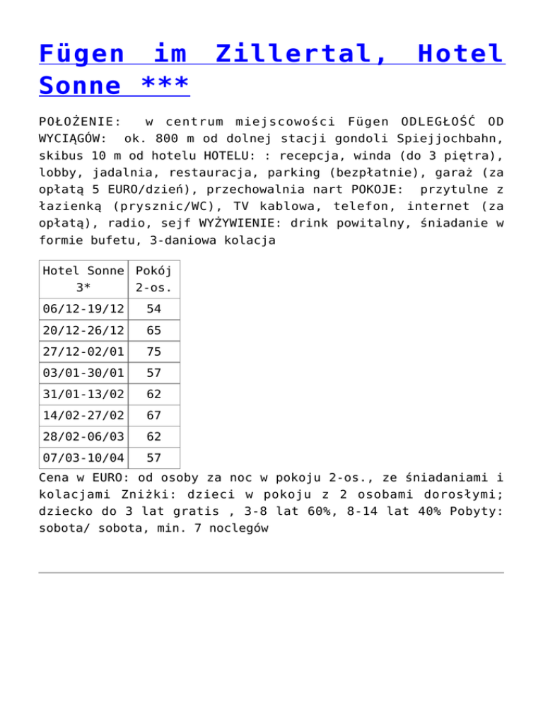 Fügen im Zillertal, Sonne *** Hotel POŁOŻENIE: w centrum miejscowości Fügen ODLEGŁOŚĆ OD WYCIĄGÓW: ok. 800 m od dolnej stacji gondoli Spiejjochbahn, skibus 10 m od hotelu HOTELU: : recepcja, winda (do 3 piętra), lobby, jadalnia, restauracja, parking (bezpłatnie), garaż (za opłatą 5 EURO/dzień), przechowalnia nart POKOJE: przytulne z łazienką (prysznic/WC), TV kablowa, telefon, internet (za opłatą), radio, sejf WYŻYWIENIE: drink powitalny, śniadanie w formie bufetu, 3-daniowa kolacja Hotel Sonne Pokój 3* 2-os. 06/12-19/12 54 20/12-26/12 65 27/12-02/01 75 03/01-30/01 57 31/01-13/02 62 14/02-27/02 67 28/02-06/03 62 07/03-10/04 57 Cena w EURO: od osoby za noc w pokoju 2-os., ze śniadaniami i kolacjami Zniżki: dzieci w pokoju z 2 osobami dorosłymi; dziecko do 3 lat gratis , 3-8 lat 60%, 8-14 lat 40% Pobyty: sobota/ sobota, min. 7 noclegów Schladming, Hotel Mitterhofer **** Rodzinny hotel urządzony w stylu styryjskim. POŁOŻENIE: oddalony 1 km od centrum Schladming ODLEGŁOŚĆ OD WYCIĄGÓW: 300 m od terenu narciarskiego Planai Hochwurzen W HOTELU: recepcja, lobby, winda, pokój śniadaniowy, jadalnia, restauracja, bar, kawiarnia, pokój wypoczynkowy, czytelnia, pokój z TV, pokój gier, Wi-Fi i kącik internetowy (w cenie), przechowalnia butów, ogród zimowy, taras i bezpłatny parking POKOJE: przytulne pokoje z łazienką (prysznic/WC), TV kablowa, telefon, radio z budzikiem, suszarka do włosów, sejf (w cenie), balkon lub taras REKREACJA: przestronna strefa wellness (ok. 300 m²) z podgrzewanym odkrytym basenem, łaźnią parową, sauną fińską, biosauną, 2 pokojami relaksacyjnymi i barem herbacianym (16:00 – 21:00); solarium i masaże dostępne za opłatą WYŻYWIENIE: bufet śniadaniowy i 4-daniową kolację z menu do wyboru Hotel Mitterhofer 4* Pokój 2-os. 30/11 -20/12 88 21/12-02/01 124 03/01-30/01 106 31/01-20/02 118 21/02-13/03 106 14/03-05/04 90 Cena w EURO: od osoby za 1 noc w pokoju 2-os., ze śniadaniami i kolacjami Zniżki: dzieci z 2 osobami dorosłymi w pokoju 2-os.: dziecko do 5 lat gratis, 5-11 lat 50%, 11-15 lat 30% Pobyty: sobota/ sobota Inne: taksa turystyczna płatna na miejscu 1,50 Euro/os/noc powyżej 15 lat Oferta: 7=6 nocy w terminach: 30/11-20/12, 10/01-23/01oraz 14/03-05/04 Kitzbühel, Kolpinghaus Apartament POŁOŻENIE: komfortowy apartamentowiec położony w samym centrum Kitzbühel ODLEGŁOŚĆ OD WYCIĄGÓW: 400 m od Hornbahn, bezpłatny ski bus w odległości 100 m W OBIEKCIE: winda, parking płatny znajduje się w odległości ok. 500 m a bezpłatny ok. 1 km od apartamentowca APARTAMENTY: przestronne, z łazienkami, TV kablową i aneksem kuchennym M2 (ok. 23 m2) – studio dla 2 osób, pokój dzienny z aneksem kuchennym i 2 oddzielne łóżka B4 (ok. 45 m2) – 2 –pokojowy dla 4 osób; pokój dzienny z aneksem kuchennym i kanapą 2-osobową, sypialnia z łóżkiem piętrowym, 2 pojedynczymi lub małżeńskim B6 (ok. 45 m2) – 2-pokojowy dla 6 osób; pokój dzienny z aneksem kuchenny i 2 łóżkami lub kanapą 2-osobową, sypialnia dla 4 osób z 2 łóżkami piętrowymi. T6 (ok. 55 m2) – apartament 3-pokojowy dla 6 osób, pokój dzienny z aneksem kuchennym i kanapą dla 1 osoby, sypialnia 3osobowa, sypialnia dla 2 osób WYŻYWIENIE: we własnym zakresie Apartamenty Kolpinghaus M2 B4 B6 T6 06/12-12/12 36 54 75 85 13/12-19/12 48 72 90 102 20/12-26/12 102 132 150 162 27/12-02/01 180 222 240 252 03/01-30/01 108 126 138 31/01-06/02 102 132 150 162 07/02-27/02 144 186 204 216 28/02-06/03 102 132 150 162 72 90 102 07/03-04/04 78 60 Cena w EURO: za apartament za 1 noc, obejmuje zużycie prądu, wody, pościel, Opłaty obowiązkowe na miejscu: sprzątanie końcowe 50 €/M2, 55 €/B4, 60 €/B6/T6, EURO; opłata klimatyczna € 1,80 /os/dzień/powyżej 15 lat Kaucja: € 100/apartament Oferta: 7=5 nocy w terminach: 21/03-27/03 06/12-19/12, 20/12-26/12 oraz 7=6 nocy w terminach: 03/0107/03-20/03oraz 28/03-04/04 30/01, 07/02-13/02, Mayrhofen, St. Georg **** Rodzinnie prowadzony hotel położony jest w cichej okolicy. POŁOŻENIE: 500 m od centrum Mayrhofen ODLEGŁOŚĆ OD WYCIĄGÓW: 500 m od dolnej stacji kolejki Penken, skibus 50 m od hotelu HOTELU: : recepcja, winda (do 3 piętra), lobby z kominkiem i barem, WIFI (za opłatą), ogrzewana narciarnia, parking (bezpłatnie), garaż (za opłatą 5 EURO/dzień) POKOJE: Obszerne pokoje z łazienką, prysznic/WC, TV kablowa, telefon, łącze internetowe (za opłatą), suszarka do włosów, sejf (za opłatą 5 EURO/dzień), balkon lub taras. REKREACJA: : strefa wellness 190 m2: basen kryty, sauna fińska, łaźnia parowa, bio sauna, prysznice relaksacyjne, kabina na podczerwień WYŻYWIENIE: śniadanie w formie bufetu, 4-daniowa kolacja menu do wyboru (2 dania główne do wyboru) z bufetem sałatkowym. Raz w tygodniu oferowany jest bufet deserowy oraz wieczór tematyczny Hotel St. George 4* Pokój 2-os. 14/12-19/12 94 20/12-23/12 140 24/12-10/01 170 11/01-30/01 94 31/01-05/04 121 06/04-10/04 94 Cena w EURO: od osoby za noc w pokoju 2-os., ze śniadaniami i kolacjami Zniżki: dzieci w pokoju z 2 osobami dorosłymi; dziecko do 2 lat gratis , 2-6 lat 50%, 6-12 lat 30% Pobyty: sobota/ sobota, min. 7 noclegów Finkenberg, *** Hotel Panorama POŁOŻENIE: w centrum miejscowości. ODLEGŁOŚĆ OD WYCIĄGÓW: 100 m od dolnej stacji wyciągu W HOTELU: recepcja, restauracja a la carte, bar, na parterze supermarket, narciarnia, parking, bezpłatne WIFI w lobby oraz w reastauracji POKOJE: z łazienkami, radiem, telefonem, TV SAT, sejfem, niektóre z balkonem REKREACJA: sauna, łaźnia turecka, siłownia (16.00-19.00); za opłatą solarium i Jacuzzi WYŻYWIENIE: śniadanie w formie bufetu, 3-daniowa kolacja (możliwość wyboru zestawu) z bufetem sałatkowym i 2 małymi napojami (piwo, wino stołowe lub napój bezalkoholowy) Hotel Pokój 2Panorama 3* os. 20/12-26/12 70 27/12-02/01 72 03/01-09/01 70 10/01-30/01 68 31/01-27/02 70 28/02-10/04 68 Cena w Euro: od osoby za 1 noc w pokoju 2-os., ze śnia