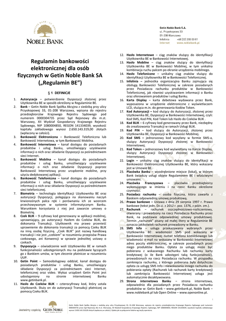 Regulamin bankowości elektronicznej dla osób fizycznych w Getin Noble Bank SA („Regulamin BE”) § 1 DEFINICJE 1. Autoryzacja – potwierdzenie Dyspozycji złożonej przez Użytkownika BE w sposób określony w Regulaminie BE. 2. Bank – Getin Noble Bank Spółka Akcyjna z siedzibą przy ulicy Przyokopowej 33, 01-208 Warszawa, wpisana do rejestru przedsiębiorców Krajowego Rejestru Sądowego pod numerem 0000304735 przez Sąd Rejonowy dla m.st. Warszawy, XII Wydział Gospodarczy Krajowego Rejestru Sądowego, NIP 1080004850, REGON 141334039, wysokość kapitału zakładowego wynosi 2.650.143.319,00 złotych (wpłacony w całości). 3. Bankowość Elektroniczna – Bankowość Telefoniczna lub Bankowość Internetowa, w tym Bankowość Mobilna. 4. Bankowość Internetowa – kanał dostępu do posiadanych produktów i usług Banku, umożliwiający uzyskiwanie informacji o nich oraz składanie Dyspozycji za pośrednictwem sieci Internet. 5. Bankowość Mobilna – kanał dostępu do posiadanych produktów i usług Banku, umożliwiający uzyskiwanie informacji o nich oraz składanie Dyspozycji poprzez Bankowość Internetową przez urządzenie mobilne, przy użyciu dedykowanej aplikacji. 6. Bankowość Telefoniczna – kanał dostępu do posiadanych produktów i usług Banku, umożliwiający uzyskiwanie informacji o nich oraz składanie Dyspozycji za pośrednictwem sieci telefonicznej. 7. Biometria – technologia identyfikacji Użytkownika BE oraz autoryzacji Dyspozycji, polegająca na skanowaniu naczyń krwionośnych palca ręki i porównaniu ich ze wzorcem przechowywanym w systemie informatycznym Banku. Warunkiem korzystania z niej jest zawarcie umowy o Biometrię. 8. Czek BLIK – 9 cyfrowy kod generowany w aplikacji mobilnej, uprawniający, po autoryzacji Hasłem do Czeków BLIK, do dokonania Transakcji. Użytkownik ma prawo przenieść uprawnienie do dokonania transakcji za pomocą Czeku BLIK na inną osobę fizyczną. „Czek BLIK” jest nazwą handlową transakcji i nie jest „czekiem” w rozumieniu przepisów Prawa czekowego, ani Konwencji w sprawie jednolitej ustawy o czekach. 9. Dyspozycja – oświadczenie woli Użytkownika BE w ramach funkcjonalności udostępnionych mu na podstawie łączących go z Bankiem umów, w tym zlecenie płatnicze w rozumieniu UUP. 10. Getin Point – Samoobsługowy oddział, kanał dostępu do posiadanych produktów i usług Banku, umożliwiający składanie Dyspozycji za pośrednictwem sieci Internet, telefonicznej oraz video. Wykaz urządzeń Getin Point jest udostępniony na stronie internetowej Banku www.getinbank.pl. 11. Hasło do Czeków BLIK – czterocyfrowy kod, który ustala Użytkownik. Służy on do autoryzacji Transakcji płatniczej za pomocą Czeku BLIK. 12. Hasło Internetowe – ciąg znaków służący do identyfikacji Użytkownika BE w Bankowości Internetowej. 13. Hasło Mobilne – ciąg znaków służący do identyfikacji Użytkownika BE w Bankowości Mobilnej, w tym unikalna kombinacja ruchu palcem po ekranie urządzenia mobilnego. 14. Hasło Telefoniczne – unikalny ciąg znaków służący do identyfikacji Użytkownika BE w Bankowości Telefonicznej. 15. Infolinia – jednostka organizacyjna Banku zajmująca się obsługą Bankowości Telefonicznej w zakresie posiadanych przez Posiadacza rachunku produktów w Bankowości Telefonicznej, jak również uzyskiwaniem informacji o Banku oraz oferowaniem produktów i usług Banku. 16. Karta Display – karta debetowa wydawana przez Bank, wyposażona w urządzenie elektroniczne z wyświetlaczem LCD, służąca m.in. do generowania Kodów Token. 17. Kod Autoryzacji – kod służący do Autoryzacji, złożonej przez Użytkownika BE, Dyspozycji w Bankowości Internetowej, czyli: Kod SMS, Kod PIN, Kod Token lub Hasło do Czeków BLIK . 18. Kod BLIK – 6 cyfrowy kod generowany przez Bank, niezbędny do zrealizowania Transakcji w ramach Usługi BLIK. 19. Kod PIN – kod służący do Autoryzacji, złożonej przez Użytkownika BE, Dyspozycji w Bankowości Mobilnej. 20. Kod SMS – jednorazowy kod wysyłany w formie SMS-a, służący Autoryzacji Dyspozycji złożonej w Bankowości Internetowej. 21. Kod Token – jednorazowy kod wyświetlany na Karcie Display, służący Autoryzacji Dyspozycji złożonej w Bankowości Internetowej. 22. Login – unikalny ciąg znaków służący do identyfikacji w Bankowości Elektronicznej Użytkownika BE, który wskazany jest w Umowie BE. 23. Placówka Banku – wyodrębnione miejsce (lokal), w którym Bank świadczy usługi objęte Regulaminem BE i właściwymi umowami. 24. Placówka Franczyzowa ‒ placówka przedsiębiorcy wykonującego w imieniu i na rzecz Banku określone czynności. 25. Posiadacz rachunku – osoba fizyczna, która zawarła z Bankiem odpowiednią umowę produktową. 26. Prawo bankowe – Ustawa z dnia 29 sierpnia 1997 r. Prawo bankowe (tekst jedn. Dz.U. z 2012 r. poz. 1376, z późn. zm.). 27. Rachunek ‒ rachunek oszczędnościowo-rozliczeniowy, otwierany i prowadzony na rzecz Posiadacza Rachunku przez Bank, na podstawie odpowiedniej umowy produktowej. Termin „rachunek” pisany od małej litery w Regulaminie BE oznacza jakikolwiek rachunek prowadzony w Banku. 28. SMS Info – usługa przekazywania wybranych przez Użytkownika BE: wiadomości SMS pod wskazany w Bankowości Internetowej numer telefonu komórkowego lub wiadomości e-mail na wskazany w Bankowości Internetowej adres poczty elektronicznej, w zakresie posiadanych przez niego produktów Banku. Opłata za usługę może być pobierana z wskazanego Rachunku lub rachunku karty kredytowej (o ile Bank udostępni taką funkcjonalność), prowadzonych na rzecz Posiadacza rachunku. W przypadku zamknięcia rachunku, z którego pobierana była dotychczas opłata za usługę SMS Info i niewskazania innego rachunku do pobierania opłaty (Rachunek lub rachunek karty kredytowej) lub zamknięcia Bankowości Internetowej usługa jest automatycznie dezaktywowana. 29. Strona in
