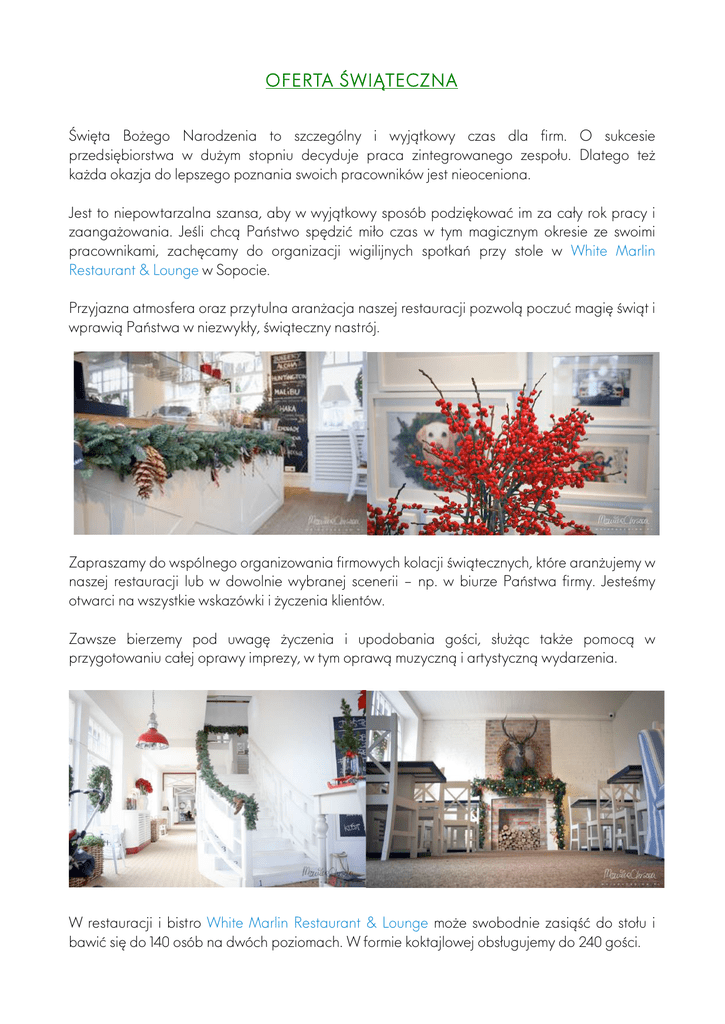 OFERTA ŚWIĄTECZNA Święta Bożego Narodzenia to szczególny i wyjątkowy czas dla firm. O sukcesie przedsiębiorstwa w dużym stopniu decyduje praca zintegrowanego zespołu. Dlatego też każda okazja do lepszego poznania swoich pracowników jest nieoceniona. Jest to niepowtarzalna szansa, aby w wyjątkowy sposób podziękować im za cały rok pracy i zaangażowania. Jeśli chcą Państwo spędzić miło czas w tym magicznym okresie ze swoimi pracownikami, zachęcamy do organizacji wigilijnych spotkań przy stole w White Marlin Restaurant & Lounge w Sopocie. Przyjazna atmosfera oraz przytulna aranżacja naszej restauracji pozwolą poczuć magię świąt i wprawią Państwa w niezwykły, świąteczny nastrój. Zapraszamy do wspólnego organizowania firmowych kolacji świątecznych, które aranżujemy w naszej restauracji lub w dowolnie wybranej scenerii – np. w biurze Państwa firmy. Jesteśmy otwarci na wszystkie wskazówki i życzenia klientów. Zawsze bierzemy pod uwagę życzenia i upodobania gości, służąc także pomocą w przygotowaniu całej oprawy imprezy, w tym oprawą muzyczną i artystyczną wydarzenia. W restauracji i bistro White Marlin Restaurant & Lounge może swobodnie zasiąść do stołu i bawić się do 140 osób na dwóch poziomach. W formie koktajlowej obsługujemy do 240 gości. Proponujemy Państwu menu do wyboru w t rze ch warianta ch cenow ych: O PCJA I Ko sz t menu w przeliczeniu na 1 o sobę doro słą w yno si 160,0 0 PRZYSTAWKI PODANE W STOLE: półmisek mięs pieczonych: pasztet z dziczyzny z żurawiną, pieczony boczek z chilli, schab pieczony ze śliwką, karkówka z pieca ze świeżym majerankiem tradycyjna sałatka jarzynowa śledź bałtycki z olejem lnianym sałatka z marynowanego łososia z burakiem i philadelphią pierogi z kapustą i grzybami dorsz z salsą z warzyw i pomidorami ZUPA DO WYBORU: żurek na razowym zakwasie lub barszcz czerwony z pielmieni DANIE GŁÓWNE DO WYBORU: pieczeń z indyka z puree z pomarańczy i coulis żurawinowym lub filet z sandacza z pieczonymi warzywami korzennymi i salsą vierge DESER DO WYBORU: duszona gruszka z szafranem i dyniowo waniliowym sosem lub bread butter puding O PCJA II Ko sz t menu w przeliczeniu na 1 o sobę doro słą w yno si 190,0 0 PRZYSTAWKI PODANE W STOLE: tatar ze śledzia z karmelizowanym jabłkiem tradycyjna sałatka jarzynowa torcik z wątróbki z aioli i salsą z jabłka i szalotki sałatka z marynowanego łososia z burakiem i philadelphią rillette z kaczki z chutneyem gruszkowym pieczony rostbeff z miodem i musztardą dijon pierogi z kapustą i grzybami ZUPA DO WYBORU: barszcz grzybowy lub consome z ravioli z bażantem i truflą DANIE GŁÓWNE DO WYBORU: duszona gicz cielęca z sosem z czerwonego wina i fondantem buraczanym lub filet z dorsza z ciecierzycą, chorizo i aioli DESER DO WYBORU: ciasto daktylowe z sosem sticky toffee i lodami waniliowymi lub czekoladowy fondant z wiśnią i karmelem O PCJA III Ko sz t menu w przeliczeniu na 1 o sobę doro słą w yno si 220,0 0 PRZYSTAWKI PODANE W STOLE: półmisek mięs pieczonych: pasztet z dziczyzny z żurawiną, schab pieczony ze śliwką, karkówka z pieca ze świeżym majerankiem, pieczony boczek z chilli tatar ze śledzia z karmelizowanym jabłkiem torcik z wątróbki z aioli i salsą z jabłka i szalotki gravlax z sosem miodowo koperkowym tatar wołowy z truflowym sosem holenderskim i borowikiem rillette z kaczki z chutneyem gruszkowym pierogi z kapustą i grzybami dorsz z salsą z warzyw ZUPA DO WYBORU: consome z ravioli z bażantem i truflą lub bisque z kraba DANIE GŁÓWNE DO WYBORU: polędwica wołowa z portobello i salsefią lub dorada z sosem szampańskim i tatarem z pomidora DESER DO WYBORU: czekoladowy fondant z wiśnią i karmelem white marlin cheesecake brownie z solonym karmelem - pozostałe napoje oraz alkohole zostaną skalkulowane według spożycia i doliczone do końcowego rachunku podane ceny to kwoty brutto do końcowego rachunku należy doliczyć 10% serwisu warunkiem przyjęcia rezerwacji jest wpłata zaliczki w wysokości 50% od wartości zamówienia. Sopot, Aleja Wojska Polskiego 1 tel. +48 58 5858686 mail: [email protected] www.whitemarlin.pl