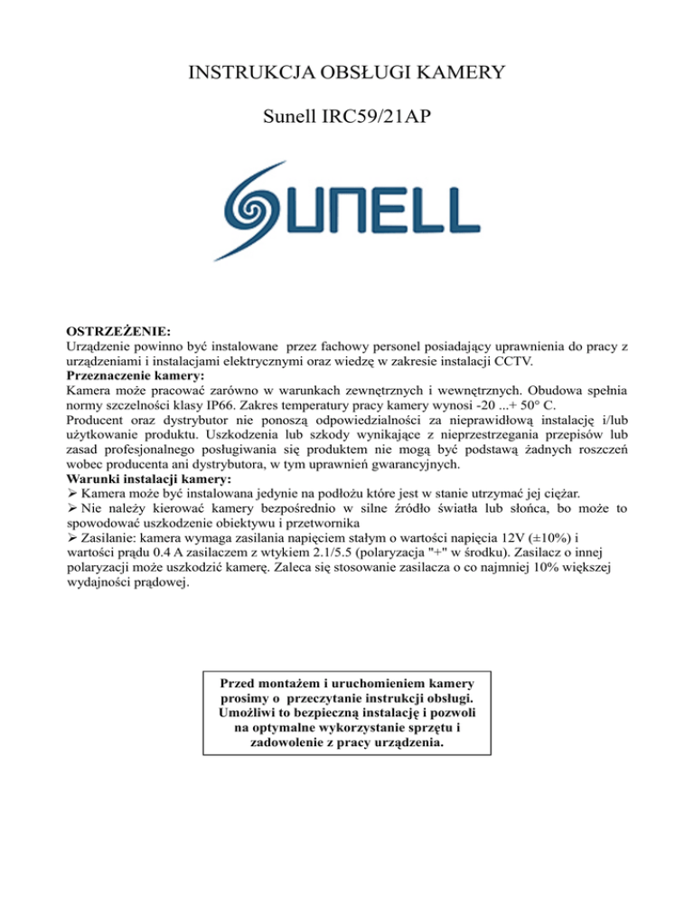 INSTRUKCJA OBSŁUGI KAMERY Sunell IRC59/21AP