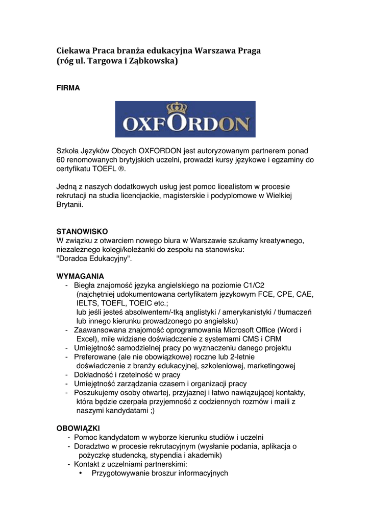 CiekawaPracabranżaedukacyjnaWarszawaPraga (rógul.TargowaiZąbkowska) FIRMA Szkoła Języków Obcych OXFORDON jest autoryzowanym partnerem ponad 60 renomowanych brytyjskich uczelni, prowadzi kursy językowe i egzaminy do certyfikatu TOEFL ®. Jedną z naszych dodatkowych usług jest pomoc licealistom w procesie rekrutacji na studia licencjackie, magisterskie i podyplomowe w Wielkiej Brytanii. STANOWISKO W związku z otwarciem nowego biura w Warszawie szukamy kreatywnego, niezależnego kolegi/koleżanki do zespołu na stanowisku: "Doradca Edukacyjny". WYMAGANIA - Biegła znajomość języka angielskiego na poziomie C1/C2 (najchętniej udokumentowana certyfikatem językowym FCE, CPE, CAE, IELTS, TOEFL, TOEIC etc.; lub jeśli jesteś absolwentem/-tką anglistyki / amerykanistyki / tłumaczeń lub innego kierunku prowadzonego po angielsku) - Zaawansowana znajomość oprogramowania Microsoft Office (Word i Excel), mile widziane doświadczenie z systemami CMS i CRM - Umiejętność samodzielnej pracy po wyznaczeniu danego projektu - Preferowane (ale nie obowiązkowe) roczne lub 2-letnie doświadczenie z branży edukacyjnej, szkoleniowej, marketingowej - Dokładność i rzetelność w pracy - Umiejętność zarządzania czasem i organizacji pracy - Poszukujemy osoby otwartej, przyjaznej i łatwo nawiązującej kontakty, która będzie czerpała przyjemność z codziennych rozmów i maili z naszymi kandydatami ;) OBOWIĄZKI - Pomoc kandydatom w wyborze kierunku studiów i uczelni - Doradztwo w procesie rekrutacyjnym (wysłanie podania, aplikacja o pożyczkę studencką, stypendia i akademik) - Kontakt z uczelniami partnerskimi: • Przygotowywanie broszur informacyjnych • Uczestnictwo w targach edukacyjnych Pomoc przy organizacji eventów i marketingu internetowym ZAROBKI Proporcjonalnie do Twoich umiejętności i doświadczenia (min. 2500zł netto). OFERUJEMY - Przyjemną atmosferę w młodym gronie - Kameralne biuro 5 osobowe z super lokalizacją na Pradze (przy metrze Dworzec Wileński, głównych liniach autobusowych i tramwajowych, obok ul. Ząbkowskiej) - Szkolenie z zakresu doradztwa edukacyjnego, marketingu, obsługi klienta i oprogramowania - Podróże służbowe do Anglii - Kreatywne wyzwania i niezależność w działaniu APLIKACJA Do piątku 19 lutego (godz. 17) zbieramy CV (max DWIE STRONY A4) oraz list motywacyjny (max. 500 słów) OBA TYLKO W J.ANGIELSKIM przez email: [email protected] Skontaktujemy się tylko z wybranymi kandydatami ustalić termin rozmowy kwalifikacyjnej w naszym biurze przy ul. Targowej. Część rozmowy kwalifikacyjnej odbędzie się po angielsku. Podczas rozmowy przeprowadzimy też krótki test umiejętności (symulowana rozmowa telefoniczna z kandydatem na studia). Do aplikacji prosimy załączyć klauzulę: „Wyrażam zgodę na przetwarzanie moich danych osobowych zawartych w moich dokumentach aplikacyjnych dla potrzeb niezbędnych do przeprowadzenia obecnego, jak i przyszłych procesów rekrutacyjnych prowadzonych przez OXFORDON Szkoła Języków Obcych zgodnie z postanowieniami ustawy z 29 sierpnia 1997 r. o ochronie danych osobowych (t.j. Dz. U. z 2002 r., nr. 101, poz. 926 ze zm.).”