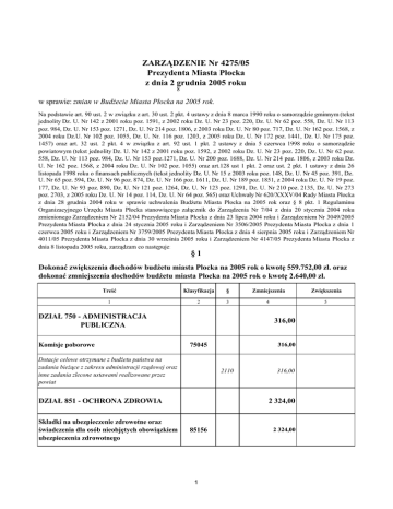 ZARZĄDZENIE Nr 4275/05 Prezydenta Miasta Płocka z dnia 2 grudnia 2005 roku 8 w sprawie: zmian w Budżecie Miasta Płocka na 2005 rok. Na podstawie art. 90 ust. 2 w związku z art. 30 ust. 2 pkt. 4 ustawy z dnia 8 marca 1990 roku o samorządzie gminnym (tekst jednolity Dz. U. Nr 142 z 2001 roku poz. 1591, z 2002 roku Dz. U. Nr 23 poz. 220, Dz. U. Nr 62 poz. 558, Dz. U. Nr 113 poz. 984, Dz. U. Nr 153 poz. 1271, Dz. U. Nr 214 poz. 1806, z 2003 roku Dz. U. Nr 80 poz. 717, Dz. U. Nr 162 poz. 1568, z 2004 roku Dz.U. Nr 102 poz. 1055, Dz. U. Nr. 116 poz. 1203, z 2005 roku Dz. U. Nr 172 poz. 1441, Dz. U. Nr 175 poz. 1457) oraz art. 32 ust. 2 pkt. 4 w związku z art. 92 ust. 1 pkt. 2 ustawy z dnia 5 czerwca 1998 roku o samorządzie powiatowym (tekst jednolity Dz. U. Nr 142 z 2001 roku poz. 1592, z 2002 roku Dz. U. Nr 23 poz. 220, Dz. U. Nr 62 poz. 558, Dz. U. Nr 113 poz. 984, Dz. U. Nr 153 poz.1271, Dz. U. Nr 200 poz. 1688, Dz. U. Nr 214 poz. 1806, z 2003 roku Dz. U. Nr 162 poz. 1568, z 2004 roku Dz. U. Nr 102 poz. 1055) oraz art.128 ust 1 pkt. 2 oraz ust. 2 pkt. 1 ustawy z dnia 26 listopada 1998 roku o finansach publicznych (tekst jednolity Dz. U. Nr 15 z 2003 roku poz. 148, Dz. U. Nr 45 poz. 391, Dz. U. Nr 65 poz. 594, Dz. U. Nr 96 poz. 874, Dz. U. Nr 166 poz. 1611, Dz. U. Nr 189 poz. 1851, z 2004 roku Dz. U. Nr 19 poz. 177, Dz. U. Nr 93 poz. 890, Dz. U. Nr 121 poz. 1264, Dz. U. Nr 123 poz. 1291, Dz. U. Nr 210 poz. 2135, Dz. U. Nr 273 poz. 2703, z 2005 roku Dz. U. Nr 14 poz. 114, Dz. U. Nr 64 poz. 565) oraz Uchwały Nr 620/XXXV/04 Rady Miasta Płocka z dnia 28 grudnia 2004 roku w sprawie uchwalenia Budżetu Miasta Płocka na 2005 rok oraz § 8 pkt. 1 Regulaminu Organizacyjnego Urzędu Miasta Płocka stanowiącego załącznik do Zarządzenia Nr 7/04 z dnia 20 stycznia 2004 roku zmienionego Zarządzeniem Nr 2152/04 Prezydenta Miasta Płocka z dnia 23 lipca 2004 roku i Zarządzeniem Nr 3049/2005 Prezydenta Miasta Płocka z dnia 24 stycznia 2005 roku i Zarządzeniem Nr 3506/2005 Prezydenta Miasta Płocka z dnia 1 czerwca 2005 roku i Zarządzeniem Nr 3759/2005 Prezydenta Miasta Płocka z dnia 4 sierpnia 2005 roku i Zarządzeniem Nr 4011/05 Prezydenta Miasta Płocka z dnia 30 września 2005 roku i Zarządzeniem Nr 4147/05 Prezydenta Miasta Płocka z dnia 8 listopada 2005 roku, zarządzam co następuje: §1 Dokonać zwiększenia dochodów budżetu miasta Płocka na 2005 rok o kwotę 559.752,00 zł. oraz dokonać zmniejszenia dochodów budżetu miasta Płocka na 2005 rok o kwotę 2.640,00 zł. Treść Klasyfikacja § Zmniejszenia Zwiększenia 1 2 3 4 5 DZIAŁ 750 - ADMINISTRACJA PUBLICZNA Komisje poborowe 316,00 75045 Dotacje celowe otrzymane z budżetu państwa na zadania bieżące z zakresu administracji rządowej oraz inne zadania zlecone ustawami realizowane przez powiat 2110 DZIAŁ 851 - OCHRONA ZDROWIA Składki na ubezpieczenie zdrowotne oraz świadczenia dla osób nieobjętych obowiązkiem ubezpieczenia zdrowotnego 316,00 316,00 2 324,00 85156 1 2 324,00 Dotacje celowe otrzymane z budżetu państwa na zadania bieżące z zakresu administracji rządowej oraz inne zadania zlecone ustawami realizowane przez powiat 2110 2 324,00 DZIAŁ 852 - POMOC SPOŁECZNA Świadczenia rodzinne oraz składki na ubezpieczenia emerytalne i rentowe z ubezpieczenia społecznego 559 752,00 85212 Dotacje celowe otrzymane z budżetu państwa na realizację zadań bieżących z zakresu administracji rządowej oraz innych zadań zleconych gminie (związkom gmin) ustawami Ośrodki pomocy społecznej 2010 530 252,00 85219 Dotacje celowe otrzymane z budżetu państwa na realizację własnych zadań bieżących gmin (związków gmin) Usługi opiekuńcze i specjalistyczne usługi opiekuńcze 530 252,00 25 000,00 2030 25 000,00 85228 Dotacje celowe otrzymane z budżetu państwa na realizację zadań bieżących z zakresu administracji rządowej oraz innych zadań zleconych gminie (związkom gmin) ustawami 4 500,00 2010 RAZEM 4 500,00 2 640,00 559 752,00 DOCHODY BUDŻETU MIASTA PŁOCKA NA 2005 ROK PO ZMIANACH WYNOSZĄ – 504.828.389,16 ZŁ. §2 Dokonać zwiększenia wydatków budżetu miasta Płocka na 2005 rok o kwotę 986.724,95 zł. oraz dokonać zmniejszenia wydatków budżetu miasta Płocka na 2005 rok o kwotę 429.612,95 zł. Treść Klasyfikacja § Zmniejszenia Zwiększenia 1 2 3 4 5 DZIAŁ 600 - TRANSPORT I ŁĄCZNOŚĆ Drogi publiczne gminne 60016 2 611,14 611,14 611,14 611,14 Zadanie Nr P02/MZD/G - Utrzymanie stanowisk pracy związanych z prowadzoną działalnością -wydatki pośrednie 611,14 611,14 Zakup usług pozostałych 4300 611,14 Odpisy na zakładowy fundusz świadczeń socjalnych 4440 490,00 Kary i odszkodowania wypłacane na rzecz osób fizycznych 4590 121,14 DZIAŁ 630 – TURYSTYKA Pozostała działalność 3 500,00 63095 3 500,00 Zadanie Nr 01/WOKII/P - Promowanie i poznawanie miasta poprzez imprezy turystyczne, krajowe i zagraniczne - wydatki bezpośrednie 3 500,00 Zakup usług pozostałych 4300 DZIAŁ 700 - GOSPODARKA MIESZKANIOWA Pozostała działalność 70095 Zadanie Nr 05/WGMII/G - Nadzór nad zarządzaniem i eksploatacją majątkiem Gminy w zakresie budynków i lokali - wydatki bezpośrednie 3 500,00 100 000,00 100 000,00 100 000,00 100 000,00 100 000,00 Zakup usług pozostałych 4300 100 000,00 Zadanie Nr 26/WGMII/I/G - Realizacja mieszkań komunalnych 100 000,00 Wydatki inwestycyjne jednostek budżetowych 6050 DZIAŁ 710 - DZIAŁALNOŚĆ USŁUGOWA Plany zagospodarowania przestrzennego 71004 Zadanie Nr 01/WUGIV/G - Sprawy organizacyjno finansowe - wydatki bezpośrednie 100 000,00 36 440,00 44 640,00 450,00 450,00 450,00 450,00 Składki na ubezpieczenia społeczne 4110 300,00 Składki na Fundusz Pracy 4120 150,00 Wynagrodzenia bezosobowe 4170 3 450,00 Nadzór budowlany 71015 8 200,00 Zadanie Nr P02/PINB/P - Utrzymanie stanowisk pracy związanych z prowadzoną działalnością -wydatki pośrednie 8 200,00 Składki na ubezpieczenia społeczne 4110 5 000,00 Składki na Fundusz Pracy 4120 200,00 Zakup