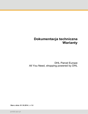 Dokumentacja techniczna Warianty DHL Parcel Europe All You Need, shopping powered by DHL Stan z dnia: 01.10.2014 ; v 1.0 portal.ayn.pl Spis treści 1 Co to są warianty produktu? .............................................................................................3 2 Warianty produktu .............................................................................................................4 3 4 5 2.1 Definiowanie grupy wariantów ..................................................................................5 2.2 Definiowanie konfiguracji wariantów........................................................................5 Przykłady konfiguracji wariantów różnych asortymentów .................................................8 3.1 Market budowlany ....................................................................................................8 3.2 Książki ......................................................................................................................8 3.3 Sprzęt elektroniczny powszechnego użytku .............................................................8 3.4 Filmy .........................................................................................................................9 3.5 Gry ............................................................................................................................9 3.6 Sprzęt AGD ............................................................................................................10 3.7 Artykuły spożywcze ................................................................................................10 3.8 Soczewki kontaktowe .............................................................................................11 Przegląd konfiguracji wariantów „internetowy Pasaż handlowy“.....................................12 4.1 Powszechnie stosowane konfiguracje wariantów...................................................12 4.2 Konfiguracje wariantów dla asortymentów Książka, Film i Gry ..............................13 4.3 Konfiguracje wariantów soczewek kontaktowych ...................................................13 4.4 Konfiguracje wariantów dla asortymentu Moda ......................................................14 Kontakt ............................................................................................................................15 portal.ayn.pl 1 Co to są warianty produktu? Od zaraz masz możliwość ustawiania na sklep internetowy wariantów produktu. Dzięki temu zapewniasz swoim Klientom jeszcze lepszy przegląd swoich produktów i umożliwiasz ukierunkowany zakup specyficznego wariantu. Ten dokument, jako uzupełnienie do dokumentacji API, wyjaśni Ci trzy proste kroki do wysłania na serwer wariantów produktu. Dodatkowo podajemy obrazowe przykłady stosowania udostępnionych konfiguracji wariantów dla Twoich różnych rodzajów asortymentu. W załączniku znajdziesz przejrzyste zestawienie wszystkich konfiguracji wariantów na sklep internetowy. Warianty produktu istnieją wtedy, gdy jeden i ten sam produkt istnieje w różnych odmianach. Na przykład T-Shirt, który jest dostępny w różnych rozmiarach (S, M, L, XL) i kolorach (biały, czarny, czerwony). Podczas zakupu Klient musi zdecydować się na konkretny wariant produktu. portal.ayn.pl 2 Warianty produktu Aby ustawić produkt w różnych wariantach na „internetowy Pasaż handlowy“, należy przeprowadzić następujące trzy etapy: 1. Identyfikacja konfiguracji wariantów Konfiguracja wariantów określa cechy, którymi różnią się warianty produktu. „internetowy Pasaż handlowy“ udostępnia dla różnych zakresów asortymentów wstępnie zdefiniowane konfiguracje wariantów, aby ujednolicić tworzenie wariantów w pasażu handlowym. „internetowy Pasaż handlowy“ definiuje z reguły wartości domyślne atrybutów. Jednakże w określonych przypadkach wartości wariantów nie są podane przez „internetowy Pasaż handlowy“ jako obligatoryjne. I tak, Sprzedający mogą przykładowo określić atrybut "Kolor" po prostu wprowadzeniem opcji bez tekstu. Inne wartości są, zależnie od naszej definicji, albo wartościami tekstowymi albo liczbowymi. Teraz proszę określić, jakie konfiguracje wariantów pasują do Twojego produktu. 2. Definiowanie grupy wariantów Grupa wariantów odzwierciedla wszystkie warianty produktu dostępne w pasażu handlowym. Po określeniu w etapie 1, jakie konfiguracje wariantów pasują do Twojego produktu, proszę teraz utworzyć grupę wariantów. Przykład: Chcesz oferować produkt "Koszula Boss z nadrukiem XY" w różnych rozmiarach. W etapie 1 określiłeś w tym celu konfigurację udostępnioną przez „internetowy Pasaż handlowy“ (w przykładzie "Ubranie z USA"). Teraz proszę utworzyć dla produktu odpowiednią grupę wariantów przydzielić jej unikalny kod do własnego użytku (np. "Koszula Boss 001") i nazwę jako opis grupy produktów (np. "Koszula Boss z nadrukiem XY"). Uwaga: Nazwa, którą nadajesz grupie produktów, pojawia się na liście wyników wyszukiwania – jako przedstawiciel konkretnych pojedynczych artykułów danej grupy produktów. 3. Wysyłanie wariantów Teraz możesz ustawiać i oferować w pasażu handlowym warianty produktu tak jak zwykłe produkty, przy czym tylko grupa wariantów utworzona przez Ciebie w etapie 2 musi mieć odniesienie i muszą zostać podane atrybuty wariantów. Poniższy diagram obrazuje wysyłanie danych wariantów produktu na „internetowy Pasaż handlowy“ jeszcze raz: portal.ayn.pl 2.1 Definiowanie grupy wariantów Poniższe dane są niezbędne do tworzenia grup wariantów produktu. Tabela zawiera atrybuty, które korespondują z opisem technicznym w następnym rozdziale i każdorazowo krótki opis zawartości. Grupa wariantów Długość Pole obowiązkowe string 100 tak Unikalna identyfikacja grupy wariantów, np. "Levis501" Kod konfiguracji configuration string 100 tak Unikaln