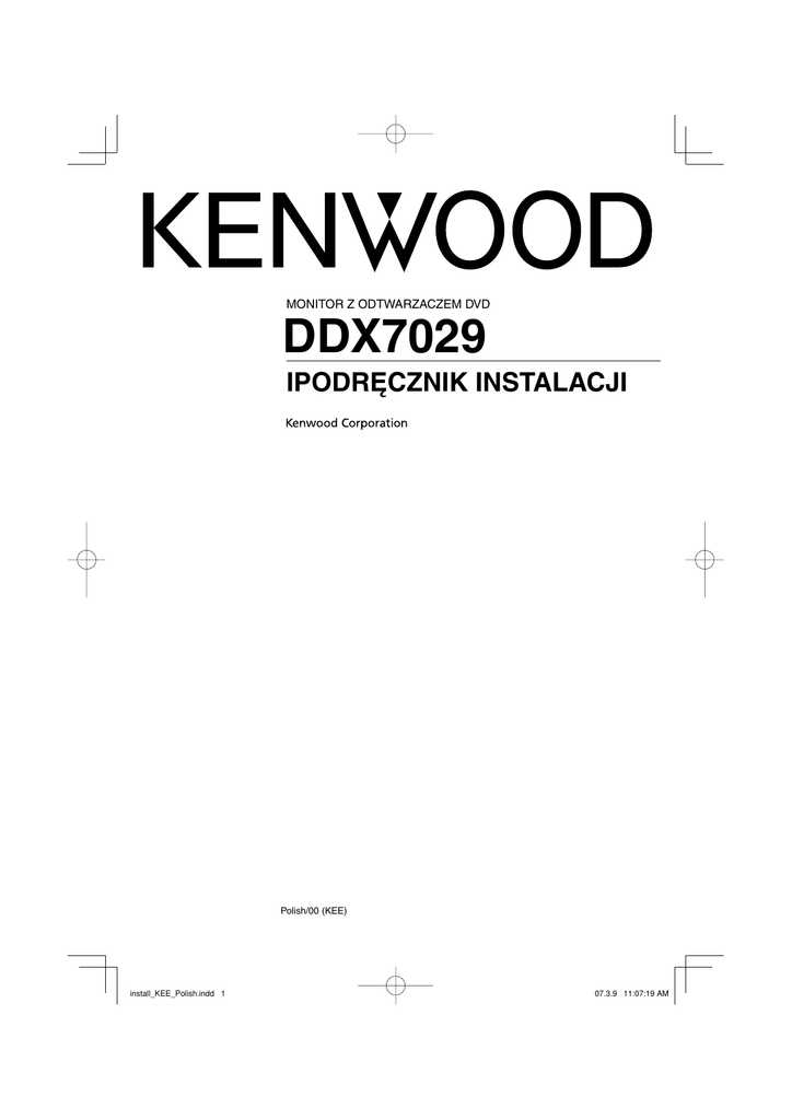 MONITOR Z ODTWARZACZEM DVD DDX7029 IPODRĘCZNIK INSTALACJI Polish/00 (KEE) install_KEE_Polish.indd 1 07.3.9 11:07:19 AM Akcesoria 1 ..........1 2 ..........1 3 ..........2 4 ..........1 5 ..........1 2 | DDX7029 install_KEE_Polish.indd 2 07.3.9 11:07:19 AM Procedura instalacji 1. Aby zapobiec zwarciom, wyjmij kluczyki samochodu ze stacyjki i odłącz końcówkę akumulatora. 2. Podłącz poprawny przewód wejścia i wyjścia do obu urządzeń. 3. Podłącz przewód z wiązki kabli. 4. Połącz złącze B wiązki kabli z wtyczką głośnika w twoim samochodzie. 5. Połącz złącze A wiązki kabli z zewnętrzną wtyczką zasilania w twoim samochodzie. 6. Połącz złącze wiązki kabli z urządzeniem. 7. Zainstaluj urządzenie w samochodzie. 8. Podłącz zacisk - akumulatora. 9. Naciśnij przycisk reset. 2OSTRZEŻENIE • Połączenie przewodu zapłonu (czerwony) i przewodu akumulatora (żółty) do podwozia samochodu (masy) może spowodować zwarcie i pożar. Zawsze należy łączyć te przewody ze źródłem zasilania poprzez skrzynkę bezpieczników. • Nie wycinaj bezpiecznika z przewodu zapłonu (czerwonego) i przewodu akumulatora (żółtego). Źródło zasilania musi być podłączone do tych przewodów poprzez bezpiecznik. ¤ • Jeśli nie można włączyć zasilania (lub zasilanie jest włączane tylko na chwilę), mogło dojść do zwarcia przewodu głośnika lub dotyka on podwozia pojazdu i włączona została funkcja zabezpieczenia. Sprawdź przewód głośnika. • Jeśli w stacyjce samochodu nie ma pozycji ACC, podłącz przewody zapłonu do źródła zasilania, które może być włączane i wyłączane kluczykiem. Jeśli przewód zapłonu zostanie podłączony do źródła zasilania, które bez przerwy dostarcza napięcie jak np. z przewodami akumulatora, może to spowodować wyładowanie akumulatora. • Jeśli konsola jest wyposażona w pokrywę, należy zainstalować urządzenie w taki sposób, aby panel czołowy nie uderzał w pokrywę podczas zamykania i otwierania. • Po spaleniu się bezpiecznika najpierw sprawdź, czy przewody nie powodują spięcia, a następnie włóż nowy bezpiecznik o takiej samej obciążalności. • Zaizoluj wolne przewody taśmą izolacyjną lub podobnym materiałem. Aby zapobiec zwarciom, nie zdejmuj nasadki z końców wolnych przewodów lub przyłączy. • Należy zawsze podłączać przewody głośników do przeznaczonych dla nich przyłączy. Urządzenie może zostać uszkodzone lub przestać działać, gdy przewody - będą łączone razem lub uziemiane używając metalowych części w samochodzie. • Gdy do urządzenia będą podłączane tylko dwa głośniki , należy je podłączyć albo do dwóch przednich przyłączy lub do dwóch tylnych przyłączy (nie należy mieszać przednich i tylnych przyłączy). Na przykład w przypadku podłączania wtyku + lewego głośnika do przedniego przyłącza nie należy podłączać wtyku - do tylnego przyłącza. • Po zainstalowaniu urządzenia sprawdź, czy prawidłowo działają światła stopu, kierunkowskazy, wycieraczki itp. • Zamocuj urządzenie tak, aby kąt montażu wynosił najwyżej 30°. • Urządzenie jest wyposażone w wentylator (strona 5), który służy do obniżania wewnętrznej temperatury. Wentylator nie powinien być niczym zasłonięty. Blokowanie otworów wentylatora przeszkadza w chłodzeniu i może spowodować usterkę. Polski | install_KEE_Polish.indd 3 3 07.3.9 11:07:20 AM Podłączenie Złącze A Przewód masy (czarny) 8 7 6 5 4 3 2 1 8 7 6 5 4 3 2 1 BEZPIECZNIK (5A) Przewód akumulatora (żółty) Przewód zapłonu (czerwony) Przejściówka anteny (ISO-JASO) (Wyposażenie 4) Złącze B Przewód antenowy (ISO) Podłącz wiązkę przełącznika wykrywania hamulca ręcznego korzystając ze złącza pośredniczącego będącego częścią zestawu. (pomarańczowy/biały) Przewód sterowania ściemniaczem (pomarańczowy/biały) ILLUMI Przewód czujnika parkowania (jasno-zielony) PRK SW Dla bezpieczeństwa sprawdź, czy został podłączony czujnik parkowania. Do wiązki światła biegu wstecznego Przewód czujnika wstecznego biegu (purpurowy/biały) Wejście pilota (jasno-niebieski/żółty) Do pilota Podłącz do uziemionego gniazda, gdy dzwoni telefon lub podczas rozmowy. Przewód ściszania (brązowy) Aby podłączyć system nawigacyjny firmy Kenwood, przeczytaj jego instrukcję obsługi. Podłącz do przyłącza sterowania anteną lub, w przypadku korzystania z opcjonalnego wzmacniacza, do przyłącza sterowania mocą. Do złącza "EXT.AMP.CONT." wzmacniacza wyposażonego w funkcję zewnętrznego sterowania. Przewód sterowania mocą/sterowania silnikiem anteny (niebieski/biały) Przewód sterowania zewnętrznym wzmacniaczem (różowy/czarny) Gdy nie wykonano połączeń, kable nie powinny wyjść z pętli. 4 | DDX7029 install_KEE_Polish.indd 4 07.3.9 11:07:20 AM Widok z tyłu Wentylator Wejście anteny FM/AM BEZPIECZNIK (10A) Wiązka przewodów (Wyposażenie 1) REVERSE REMO.CONT MUTE ANT. CONT P CONT EXT.CONT Polski | install_KEE_Polish.indd 5 5 07.3.9 11:07:20 AM Podłączanie przewodów do przyłączy Mapa funkcji kostki Numer szpilki dla Kolor przewodu kostek ISO Kostka zasilania zewnętrznego A-4 Żółty A-5 Niebiesko/biały A-6 A-7 A-8 Pomarańczowy/ biały Czerwony Czarny Kostka głośników B-1 B-2 B-3 B-4 B-5 B-6 B-7 B-8 Purpurowy Purpurowo/czarny Szary Szary/czarny Biały Biały/czarny Zielony Zielony/czarny Funkcje Akumulator Sterowanie zasilaniem Ściemniacz Zapłon (ACC) Połączenie Ziemia (masa) Tylny prawy (+) Tylny prawy (–) Przedni prawy (+) Przedni prawy(–) Przedni lewy (+) Przedni lewy (–) Tylny lewy (+) Tylny lewy (–) 2 OSTRZEŻENIE Podłączanie kostki połączeniowej ISO Układ kołków w kostce ISO zależy od typu twojego samochodu. Aby nie uszkodzić urządzenia, upewnij się czy połączenia są odpowiednie. Standardowe połączenia dla wiązki przewodów opisano poniżej w punkcie 1. Jeżeli układ kołków w kostce jest 
