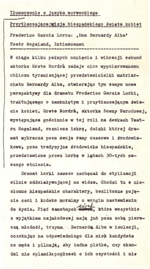 Frederico Garcia Loroa: ,Dom Bernardy Alba' Teatr Ro~aland, Intimacenen ---~--~----~~~-------~--~--~----~-------~--- W ciągu kilku pełnych napięcia i wibrac~i eekund aktorka Grete Nordra zadaje cios wypolerowanemu obliczu przedstawicielki matriar- tyrani~jąoej chatu Bernardy Alba, otwierając tym samym nowe perspektywy dla dramatu Frederico Garcia Lorki, traktującego o zamkniętJm 1 przytłaczającym ~wie cie kobiet . Grete 5ordra, aktorka SceDy Narodowej, występuj,oa godoinnie w tej roli na deskach Teat- ru Rogaland, roznieca iskrę, której dra- dzięki mat wykracza paza swoje ramy czasowe i drodowiakowe·, poza tradycyjne lirodowieko przedstawione przez Lorkę hiszpańskie, w 1ftach 30-tycb na- ezego stulecia. Dramat Lerki zawsze silnie do stylizacji na widza. Chodzi tu • nie- oddziaływającej złomne hiszpańskie zachęcał charaktery, bezlitosne pojt- cie czoi i kodeks mor&ln7 o wrogim nastawieniu ....ec' ,.}, łyoia. Pię6 samotnych • '-'; które ws z;ystkie . dG z wyjątkiem najmłodszej mają 3uż szą młodod<i, oczekując na męża dal nie trzyma, . poza sobą pierw- :Bernardfa, Alba w izolacji, na odpowiedniego dla nich kandydata i pilnuj-, aby żadna splamiłapogłosek plQtka, ozy skan- o ich czystodoi i nie - 2 wpł~~negatywnie na honor domu 1 rodziny. Jest tu odwieczna podwójna we moralnoś4, która wszystkich~ołecze,stwach ustaliła odrębne normy dla plci terlk!ej i męskiej. Podkreślają to wydarzenia Bernar~a mające dziki miejsce poza rtący pozbawiła życia izb7 ogier zostaje puszczony wolno, a klacz pozostaje w która ścianami zamknięciu• swoje Kobieta, pozamałże~skie dtiec- ko, zostaje ukamieniowana, nikt natomiast nie pyta o ojca. · Jeet to odwieczny temat, ale jego poruszanie zawsze działa bulwersująco~ nardy Alba' zaweze Dlatego tet ,Dom Ber- będzie wdzięcznym materiałem dla teatru. Sztuka jest prosta i przejrzysta, doskonale nadaje czarno~białej się do stworzenia dramatycznej scenografii. Wykarmystał to polski duet w Teatrze Rogaland - Krystyna Skuszanka, odpowiedzialna za Kępi~ska. •••Faeriłi i scenograt Katarzyna Dokonano stylizacji: chy postaci stają eię wyreżyserowane ru- rzeczywistymi kompozycjami scenie mymi. Bardzo skromne umeblowanie wydaje się ciężkie . i czarne na tle białych dcian. Ubrane na czarno córki szyją 'nieżnobiałą wyprawę po,lubną. Zenala się na odległą noc na kilka tylko bardziej - 3- kolorowych elementów: na szaro, słutąoe córka Adela szyje sobie suk- najmłodsza nię w kolorze ostrej zieleni, jej ohę6 ra w domu ubrane a, mającą symbolizować buntu, Rajstarsza córka AU&Ustias ubie- w czerwone jak krew koronki, gdy w wieku się prawie czterdziestu lat ma poznać m11t7k' mał żeJS.skiegG łoża. Nieobeoncdd jeszcze mężozyza i stwarza notami. A zamkniętego świata kobiet dla nastroju przesyconego niezdro- tło w,mi fantazjami rą tego tragedię i brak erotyki podkredla więc strażDiczką erotyc~ymi, rosmydlaniami i t,ek- motywacja Bernardy Alba bycia dobonoty nie jest tylko z związana jej zainteresowaniami czci,, szacunkiem i nieskazitelnym obliczem. Jej dwa porodów i kację sprawiły, małżedstwa że przeżyła już straciła złudzenia i pięd ona demistyfi- w dziedzinie erotyki. W przedstawieni~kuezanki uderza nas brak napięcia erotycznego, z wyjątkiem scen, w których !Uoda Adela jest zakochana po uszy i tarliwie pożąda młodego ża narzeczonego, przeznaczonego na mę dla jej starszej siostry, której równiei przy- padnie największa ozędć sza powinna ~.)~ wyj-'ć za spadku i która jako pierw- ~ż. Taldt a1,~~'iai.a areś,.,., t:K jest zupełnie naturalnĄ_ Po_dk:re•la się, że kobiety p~zbawione są dokonywad wyboru, jego pełni,, wolno,ci, nie kształtowa6 czy to u boku ewojego mężczyzn, mogą życia, same łyd czy bez nich. - 4 - Nie same wybierad mogą też mężczyzn, których da- rzą miło•oią. . Jest to nie tylko tragedia córek, ale i matki, a swłaszcza . matki. Grete Nordra otwiera w udręczonej duszy i pozwala nam nę tyraniczna tę szczeli- wierzyć, że woli Bernardy Alba jest tylko jej siła powierzchownym obliczem. W pewnym momencie skorupka pęka 1 wypływa z niej czułodó dla córek, zrozumienie dla ich i współczucie pragnień i troski o ich los. Grete Nordra pokasuje nam to w nielicznych momentach szozero~oi najstarszą $órką, w inn~ swoją oechłośd przecież najmłodszą i w scenach, w których Bernarda interpretacji roli zachowaó To matki z 1 mogłaby z powodzeniem nieugięto•ć. jej zadaniem jest wprawienie w ruch z góry ustalonej machiny losów córek, pozbawienie córek złudzeń będziesz szczęśliwa/ eię bą /nie czył, te zabrał posiadaczką władzy, proś mtża, aby cit z so- Bernarda nie jest jest ona tylko narz,dziem systemu. W ten swoje córki że - niady nie pozwól, aby zoba- płaczesz/. narda ukazana oczekiwa6, i nauczenie ich pogodzenia z losem /nigdy nie gdzie4 możesz cał~ też właściwie uciemiężonym sposób zostaje Ber- pokoleniom matek, które uległości. Łatwiej uczą jest znosi6 nie- - 5 - uniJcniony los, je,li nauczymy Łatwiej jest fimy przystoaowad da w by4 również większodci się się go akceptowad. gdy potra- narzędziem, do systemu, co czyni. I to też jest władnie Bernarczędó jej tragedii. Stylizowana Krystyny Skuezanki nie reżyseria daje specjalnej swobody indywidualno,ci w interpretacji ról. W roli La Ponoii Kirsten Hofseth stwarza kreację gospodyni zadowolonej, a jedno- cze,nie rozgoryczonej wobec siło Z radodci, opowiada wszystkie plotki Bernar- dzie, przytakuje jej, jej plecami 1 pełnej obmawiając podjudzając Tina Hartvig daje dej, istniejących układów jej córki. przekonywającą słabej, wyst~puje niepełnosprawnej ciwieństwie łagodno~ó do córki różne ją naszą uwagę atłumiony. ~ysłowo W babei złodliwodó 1 marzenia, w prze- Bern~dy. Pozostałe córki wersje tej samej postaci, zwracacechy charakteru samodzielnej córki /Marit wana mło Astrid Schwab, kt