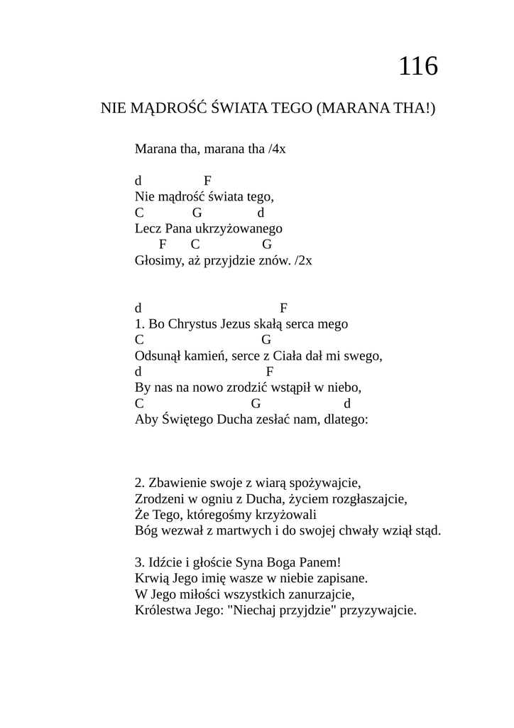 116 NIE MĄDROŚĆ ŚWIATA TEGO (MARANA THA!) Marana tha, marana tha /4x d F Nie mądrość świata tego, C G d Lecz Pana ukrzyżowanego F C G Głosimy, aż przyjdzie znów. /2x d F 1. Bo Chrystus Jezus skałą serca mego C G Odsunął kamień, serce z Ciała dał mi swego, d F By nas na nowo zrodzić wstąpił w niebo, C G d Aby Świętego Ducha zesłać nam, dlatego: 2. Zbawienie swoje z wiarą spożywajcie, Zrodzeni w ogniu z Ducha, życiem rozgłaszajcie, Że Tego, któregośmy krzyżowali Bóg wezwał z martwych i do swojej chwały wziął stąd. 3. Idźcie i głoście Syna Boga Panem! Krwią Jego imię wasze w niebie zapisane. W Jego miłości wszystkich zanurzajcie, Królestwa Jego: "Niechaj przyjdzie" przyzywajcie.