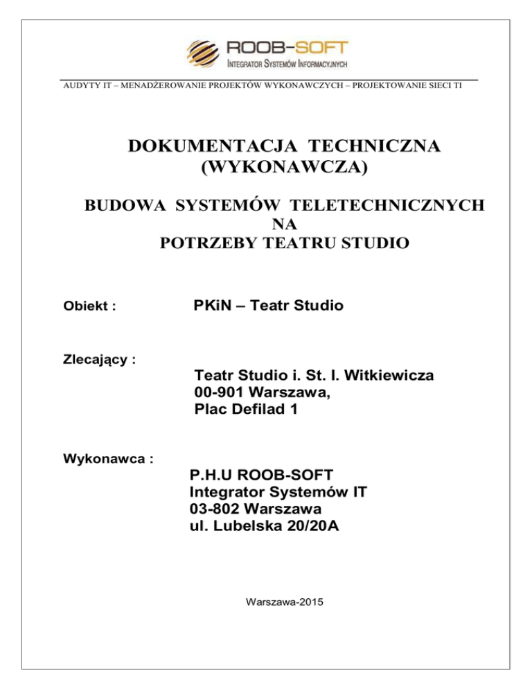 AUDYTY IT – MENADŻEROWANIE PROJEKTÓW WYKONAWCZYCH – PROJEKTOWANIE SIECI TI DOKUMENTACJA TECHNICZNA (WYKONAWCZA) BUDOWA SYSTEMÓW TELETECHNICZNYCH NA POTRZEBY TEATRU STUDIO Obiekt : PKiN – Teatr Studio Zlecający : Teatr Studio i. St. I. Witkiewicza 00-901 Warszawa, Plac Defilad 1 Wykonawca : P.H.U ROOB-SOFT Integrator Systemów IT 03-802 Warszawa ul. Lubelska 20/20A Warszawa-2015 OPERAT KOSZTOWY PROJEKTU PROJEKT SIECI TELETECHNICZNEJ – TEATR STUDIO - 2 - Spis zawartości str. 1. 2. 3. 4. 5. 6. 7. 8. 9. Przedmiot opracowania Podstawa opracowania Zakres opracowania Normy i przepisy Stan istniejącej struktury sieci teletechnicznej obiektu 5.1. instalacja teleinformatyczna 5.2. dane elektroenergetyczne obiektu 5.3. dane pomieszczenia dedykowanego na serwerownie sieci LAN 5.4. system dozoru wizyjnego 5.5. bilans mocy czynnej 5.6. dokumentacja obiektu i dokumentacja posiadanych zasobów IT 5.7. lokalizacja przestrzenna dla realizacji projektu Zalecenia wykonawcze budowy lokalnej sieci strukturalnej 6.1. Standard wykonania i prowadzenia tras kablowych 6.2. Drogi prowadzenia tras kablowych 6.3. Podejście tras kablowych do serwerowni 6.4. Wykonanie struktury sieci logicznej Zalecenia wykonawcze budowy sieci monitoringu CCTV IP 7.1. Trasy kablowe – miejsca podłączeń urządzeń systemu 7.2. Rodzaje urządzeń przewidzianych w projekcie Zalecenia wykonawcze budowy serwerowni 8.1. Trasy kablowe w serwerowni –standard wykonania Zalecenia wykonawcze budowy systemu KD na potrzeby serwerowni 9.1. System zabezpieczenia dostępu – standard wykonania 9.2. Zalecenia konfiguracji urządzeń 4 4 4 5 5 5 7 7 7 8 8 8 9 9 11 11 12 15 15 15 20 21 26 26 26 10. Uwagi końcowe 27 11. Schematy i Diagramy 11.1. Diagram Blokowy Infrastruktury Teleinformatycznej 11.2. Legenda użytych symboli na schematach i diagramach projektu 11.3. Schemat segmentu sieci teleinformatycznej - poziom 0 11.4. Schemat segmentu sieci teleinformatycznej - poziom 1 11.5. Schemat segmentu sieci teleinformatycznej - poziom 2 11.6. Schemat segmentu sieci teleinformatycznej - poziom 3 11.7. Schemat segmentu sieci teleinformatycznej - poziom 4 11.8. Schemat segmentu sieci teleinformatycznej - poziom 5 28 29 31 32 34 36 38 40 PROJEKT SIECI TELETECHNICZNEJ – TEATR STUDIO - 3 - 1. PRZEDMIOT OPRACOWANIA Przedmiotem opracowania jest dokumentacja techniczna na poziomie projektu wykonawczego realizacji prac związanych z budową wewnętrznej sieci teletechnicznej w pomieszczeniach eksploatowanych przez Teatr Studio im. St. I. Witkiewicza - będąca wytycznymi do realizacji prac na obiekcie dla wykonawcy usługi. 2. PODSTAWA OPRACOWANIA Podstawę opracowania stanowią : • Umowa z Inwestorem na zakres usługi opracowania dokumentacji technicznej • Uzgodniony z Inwestorem zakres celów i potrzeb do ujęcia w projekcie technicznym ( załącznik integralny umowy ) • Dostarczone podkłady budowlane pięter obiektu posiadana przez Inwestora nie zawierające aktualizacji stanu faktycznego – zastanego. • Warunki i wymagania dotyczące ochrony przeciwpożarowej • Warunki i wymagania dotyczące ochrony BHP • Uzgodnienia międzybranżowe • Obowiązujące normy i przepisy w zakresie poszczególnych instalacji teletechnicznych 3. ZAKRES OPRACOWANIA Zakres opracowania obejmuje: • Opis stanu zastanego w zakresie sieci teletechnicznych poprzedzony audytem technicznym na obiekcie w obszarze objętym projektem • Opracowanie zaleceń wykonawczych w zakresie przyjętych standardów realizacji torów kablowych i przyjętych przy ich wykonaniu poszczególnych elementów dla systemów objętych projektem tj. systemu przewodowej lokalnej sieci strukturalnej ( sieć LAN ) systemu bezprzewodowej sieci w technologii Wi-Fi systemu obiektowego dozoru wizyjnego CCTV 4. NORMY I PRZEPISY Wszelkie instalacje należy wykonać zgodnie z zasadami wiedzy technicznej oraz obowiązującymi normami i przepisami szczegółowymi WT Prawa Budowlanego. Użyte w wykonaniu projektu elementy i urządzenia powinny być zgodne z normami IEC określającymi ich działanie. Wszystkie urządzenia oraz elementy powinny spełniać normy europejskie dotyczące kompatybilności elektromagnetycznej oraz powinny posiadać stosowne certyfikaty CE. 5. STAN ISTNIEJĄCEJ STRUKTURY SIECI TELETECHNICZNEJ OBIEKTU 5.1 Instalacja teleinformatyczna Instalacja teletechniczna obiektu w obszarze objętym projektem jest siecią o przestarzałej organizacji logicznej. Wiele odcinków poprowadzonych jest z użyciem pośrednich węzłów komunikacji opartych o przełączniki niezarządzane o niskiej wydajności zapewniające obsługę lokalnych użytkowników w zakresie usług sieciowych. W pomieszczeniach wiele z gniazd logicznych sieci komputerowej jest zastawionych meblami, z racji priorytetu użytkowników pomieszczeń w zakresie przechowywanych dokumentów gromadzonych metodami tradycyjnymi. Taki stan faktycznie ogranicza możliwości wykorzystania, jak i wspierania technicznego potrzeb użytkowników przez personel IT. Brak optymalnej ilości gniazd logiczne sieci komputerowej w pomieszczeniach powoduje notoryczne jej rozwijanie przez wtórne dzielenie dostępu do usług sieciowych z wykorzystaniem małych przełączników lokalnych. Odbiorniki sieciowe zasilane są z różnych źródeł napięcia często z wykorzystaniem pokojowych przedłużaczy napięcia dedykowanych dla sprzętu RTV, a nie do zasilania urządzeń komputerowych. Występuje zjawisko zasilania urządzeń z różnych obwodów napięciowych na poziomie sąsiadujących ze sobą pomieszczeń – tym samym występuje PROJEKT SIECI TELETECHNICZNEJ – TEATR STUDIO - 5 - możliwość zaistnienia niebezpiecznego zjawiska znacznej różnicy potencjałów napięcia statycznego tak bardzo szkodliwego dla pracy urządzeń aktywnych w sieci IT. Biorąc pod uwagę stan administracyjny obiektu ( charakter zabytkowy oraz fakt najmu przestrzeni obiektu od właściciela obiektu ) nie istnieje możliwość wydzielenie dedykowanej f