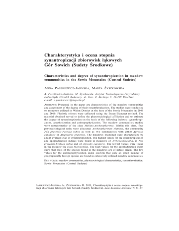 37 Charakterystyka-i-ocena-stopnia-synantropizacji-zbiorowisk-³¹kowych-Gór-Sowich 37 Charakterystyka i ocena stopnia synantropizacji zbiorowisk ³¹kowych Gór Sowich (Sudety rodkowe) Characteristics and degree of synanthropization in meadow communities in the Sowie Mountains (Central Sudetes) ANNA PASZKIEWICZ-JASIÑSKA, MARTA ¯YSZKOWSKA A. Paszkiewicz-Jasiñska, M. ¯yszkowska, Instytut Technologiczno-Przyrodniczy, Dolnol¹ski Orodek Badawczy, ul. Gen. Z. Berlinga 7, 51-209 Wroc³aw; e-mail: [email protected] ABSTRACT : Presented in the paper are characteristics of the meadow communities and assessment of the degree of their synanthropization. The studies were conducted on meadows utilized in Walim District at the base of the Sowie Mountains in 2009 and 2010. Floristic releves were collected using the Braun-Blanquet method. The material obtained served to define the phytosociological affiliation and to estimate the degree of synanthropization on the basis of the following indexes: synanthropization, apophytization and anthropophytization. The meadow communities studied were representative of the class Molinio-Arrhenatheretea. Within this class, four phytosociological units were allocated: Arrhenatheretum elatioris, the community Poa pratensis-Festuca rubra as well as two communities with either Agrostis capillaris or Alopecurus pratensis. The meadows examined were characterized by a high average level of synanthropization. The highest values for the synanthropization and apophytization indices were found in meadows of Arrhenatheretalia, in Poa pratensis-Festuca rubra and of Agrostis capillaris. The lowest values were found in the meadow the class Molinietalia. The high values for the apophytization index show that most of the species found in the meadows are of native origin. The low values for the anthropophytization index confirm that only an small number of geographically foreign species are found in extensively utilized meadow communities. KEY WORDS: meadow communities, phytosociological characteristics, synanthropisation, Sowie Mountains (Central Sudetes) PASZKIEWICZ-JASIÑSKA A., ¯YSZKOWSKA M. 2011. Charakterystyka i ocena stopnia synantropizacji zbiorowisk ³¹kowych Gór Sowich (Sudety rodkowe). Acta Botanica Silesiaca 7: 3747. 38 Anna-Paszkiewicz-Jasiñska,-Marta-¯yszkowska 38 Wstêp £¹ki i pastwiska w górskim regionie Sudetów s¹ istotnym elementem krajobrazu. Stanowi¹ ponad 50% u¿ytków rolnych (ok. 80 000 ha). Podobnie jak inne zbiorowiska rolinne podlegaj¹ one antropopresji. Na obecny stan ³¹k i pastwisk wp³ynê³y dwa bardzo wa¿ne okresy w najnowszej historii ich zagospodarowania. Po okresie intensywnego wykorzystywania do koñca lat 80., nast¹pi³a daleko posuniêta ekstensyfikacja lub zaniechanie u¿ytkowania obszarów ³¹kowo-pastwiskowych (30% pow.), w wyniku spadku op³acalnoci produkcji zwierzêcej. Konsekwencj¹ tego jest m.in. synantropizacja flory zbiorowisk tego rodzaju (Grynia 1988; Kryszak i in. 2003). Synantropizacja zbiorowisk rolinnych mo¿e odbywaæ siê poprzez masowe wkraczanie obcych gatunków, zmianê proporcji ilociowych miêdzy gatunkami rodzimymi, czy te¿ przez introgresjê, czyli upodabnianie siê jednego typu zbiorowiska do innego (Kostrowicki 1972). Zbadanie zbiorowisk ³¹kowopastwiskowych pod k¹tem stopnia synantropizacji, zw³aszcza na obszarach objêtych ochron¹, jest zatem bardzo istotne dla zachowania ich bioró¿norodnoci. Celem pracy jest charakterystyka oraz ocena stopnia synantropizacji zbiorowisk ³¹kowych w Górach Sowich. 1. Charakterystyka terenu badañ Badania przeprowadzono na ³¹kach u¿ytkowanych konie lub konopastwiskowo, po³o¿onych na wysokoci 500700 m n.p.m., na terenie gminy Walim, w okolicach miejscowoci: Glinno, Jugowice i Walim. Teren badañ znajduje siê na obszarze ochrony siedlisk Natura 2000 Ostoja Nietoperzy Gór Sowich PLH0200071 (www.natura 2000.mos.gov.pl) oraz Parku Krajobrazowego Gór Sowich. Wed³ug podzia³u fizyczno-geograficznego Kondrackiego (1994) teren ten nale¿y do Gór Sowich, jednego z mezoregionów Sudetów rodkowych, bêd¹cych najstarsz¹ czêci¹ Sudetów. Zbudowany jest g³ównie z prekambryjskich gnejsów. Pod wzglêdem wysokoci Góry Sowie s¹ bardzo zró¿nicowane. Najwy¿szym szczytem jest Wielka Sowa 1015 m n.p.m., pozosta³e maj¹ wysokoæ od 600 do 980 m n.p.m. Klimat badanego obszaru jest typowym klimatem górskim. Charakteryzuje siê wysokimi opadami atmosferycznymi na poziomie od 500600 mm (maksymalnie 900 mm na najwy¿szych szczytach) i d³ugo zalegaj¹c¹ pokryw¹ nie¿n¹, nawet do 90 dni. rednia roczna temperatura powietrza w piêtrze 400500 m n.p.m. wynosi oko³o 7°C, a w piêtrze górskim obni¿a siê o oko³o 0,51°C na ka¿de 100 m wzniesienia. W regionie tym dominuj¹ wiatry po³udniowo-zachodnie (Staffa 1995). 39 Charakterystyka-i-ocena-stopnia-synantropizacji-zbiorowisk-³¹kowych-Gór-Sowich 39 2. Materia³y i metody Podstawê do scharakteryzowania zbiorowisk ³¹kowych oraz oceny ich synantropizacji stanowi³y 144 zdjêcia fitosocjologiczne, wykonane w latach 2009 2010 metod¹ Brauna-Blanqueta (Paw³owski 1977). Powierzchnia ka¿dego zdjêcia wynosi³a 25 m2 (Faliñski 2001). Po³o¿enie zdjêæ okrelono przy pomocy odbiornika GPS. Przynale¿noæ zdjêæ do tabel fitosocjologicznych, opisuj¹cych poszczególne zbiorowiska, przyjêto na podstawie podobieñstwa sk³adu gatunkowego oraz ilociowego udzia³u w tych samych jednostkach syntaksonomicznych. Dodatkowo liczebnoæ gatunków w tabelach fitosocjologicznych wyra¿ono redni¹ wartoci¹ wspó³czynnika pokrycia, a czêstoæ wystêpowania w zdjêciach stopniem sta³oci (Paw³owski 1977). Odnotowano równie¿ obecnoæ gatunków znajduj¹cych siê pod ochron¹ czêciow¹ i cis³¹, na podstawie listy zamieszonej w Rozporz¹dzeniu Ministra rodowiska (2004). Do oceny stopnia synantropizacji zbiorowisk ³¹kowych na badanym terenie pos³u¿ono siê wskanikami zdefiniowanymi przez Jackowiaka (1990), stoso