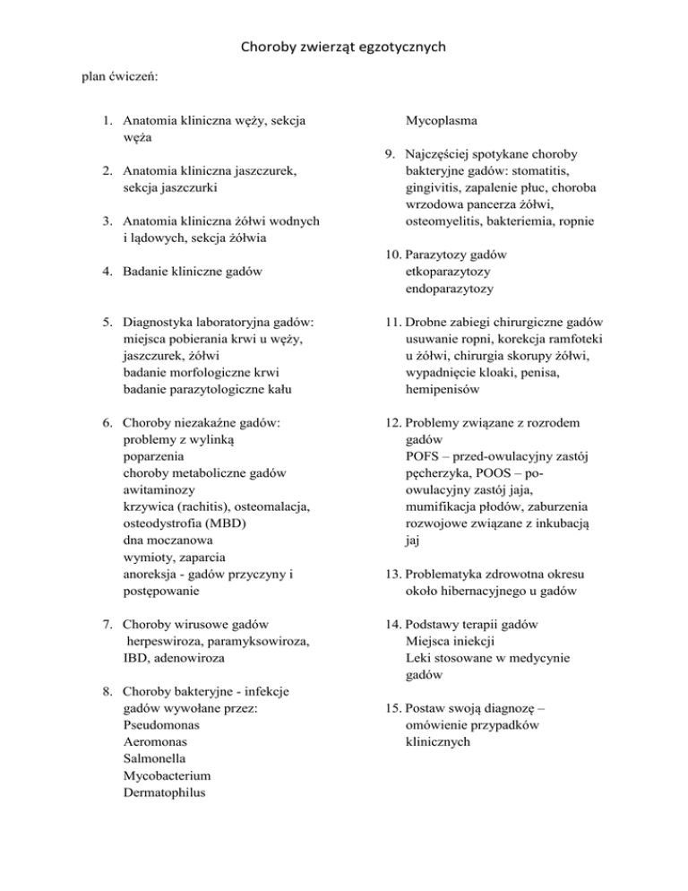 Choroby zwierząt egzotycznych plan ćwiczeń: 1. Anatomia kliniczna węży, sekcja węża 2. Anatomia kliniczna jaszczurek, sekcja jaszczurki 3. Anatomia kliniczna żółwi wodnych i lądowych, sekcja żółwia Mycoplasma 9. Najczęściej spotykane choroby bakteryjne gadów: stomatitis, gingivitis, zapalenie płuc, choroba wrzodowa pancerza żółwi, osteomyelitis, bakteriemia, ropnie 4. Badanie kliniczne gadów 10. Parazytozy gadów etkoparazytozy endoparazytozy 5. Diagnostyka laboratoryjna gadów: miejsca pobierania krwi u węży, jaszczurek, żółwi badanie morfologiczne krwi badanie parazytologiczne kału 11. Drobne zabiegi chirurgiczne gadów usuwanie ropni, korekcja ramfoteki u żółwi, chirurgia skorupy żółwi, wypadnięcie kloaki, penisa, hemipenisów 6. Choroby niezakaźne gadów: problemy z wylinką poparzenia choroby metaboliczne gadów awitaminozy krzywica (rachitis), osteomalacja, osteodystrofia (MBD) dna moczanowa wymioty, zaparcia anoreksja - gadów przyczyny i postępowanie 12. Problemy związane z rozrodem gadów POFS – przed-owulacyjny zastój pęcherzyka, POOS – poowulacyjny zastój jaja, mumifikacja płodów, zaburzenia rozwojowe związane z inkubacją jaj 7. Choroby wirusowe gadów herpeswiroza, paramyksowiroza, IBD, adenowiroza 14. Podstawy terapii gadów Miejsca iniekcji Leki stosowane w medycynie gadów 8. Choroby bakteryjne - infekcje gadów wywołane przez: Pseudomonas Aeromonas Salmonella Mycobacterium Dermatophilus 13. Problematyka zdrowotna okresu około hibernacyjnego u gadów 15. Postaw swoją diagnozę – omówienie przypadków klinicznych