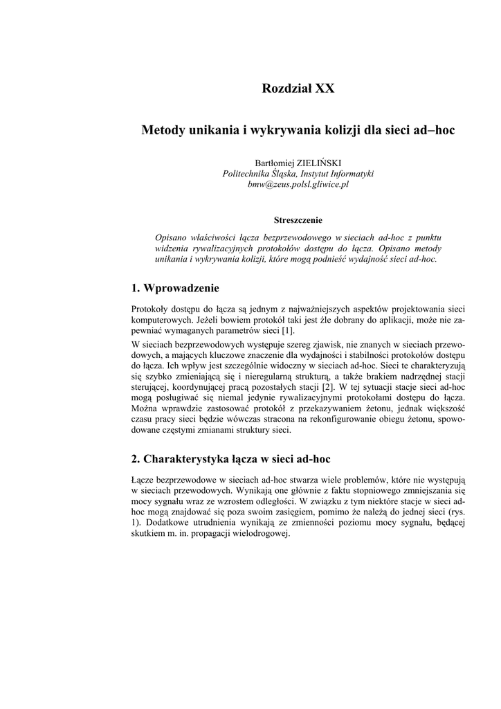 Rozdział XX Metody unikania i wykrywania kolizji dla sieci ad−hoc Bartłomiej ZIELIŃSKI Politechnika Śląska, Instytut Informatyki [email protected] Streszczenie Opisano właściwości łącza bezprzewodowego w sieciach ad-hoc z punktu widzenia rywalizacyjnych protokołów dostępu do łącza. Opisano metody unikania i wykrywania kolizji, które mogą podnieść wydajność sieci ad-hoc. 1. Wprowadzenie Protokoły dostępu do łącza są jednym z najważniejszych aspektów projektowania sieci komputerowych. Jeżeli bowiem protokół taki jest źle dobrany do aplikacji, może nie zapewniać wymaganych parametrów sieci [1]. W sieciach bezprzewodowych występuje szereg zjawisk, nie znanych w sieciach przewodowych, a mających kluczowe znaczenie dla wydajności i stabilności protokołów dostępu do łącza. Ich wpływ jest szczególnie widoczny w sieciach ad-hoc. Sieci te charakteryzują się szybko zmieniającą się i nieregularną strukturą, a także brakiem nadrzędnej stacji sterującej, koordynującej pracą pozostałych stacji [2]. W tej sytuacji stacje sieci ad-hoc mogą posługiwać się niemal jedynie rywalizacyjnymi protokołami dostępu do łącza. Można wprawdzie zastosować protokół z przekazywaniem żetonu, jednak większość czasu pracy sieci będzie wówczas stracona na rekonfigurowanie obiegu żetonu, spowodowane częstymi zmianami struktury sieci. 2. Charakterystyka łącza w sieci ad-hoc Łącze bezprzewodowe w sieciach ad-hoc stwarza wiele problemów, które nie występują w sieciach przewodowych. Wynikają one głównie z faktu stopniowego zmniejszania się mocy sygnału wraz ze wzrostem odległości. W związku z tym niektóre stacje w sieci adhoc mogą znajdować się poza swoim zasięgiem, pomimo że należą do jednej sieci (rys. 1). Dodatkowe utrudnienia wynikają ze zmienności poziomu mocy sygnału, będącej skutkiem m. in. propagacji wielodrogowej. 2 B. Zieliński Rys. 1. Przykładowa bezprzewodowa sieć ad-hoc Z punktu widzenia protokołów dostępu do łącza najistotniejsze są następujące zjawiska, charakterystyczne dla bezprzewodowych sieci ad-hoc: • zjawisko ukrytej stacji, • zjawisko odkrytej stacji, • efekt przechwytywania, • interferencje. 2.1. Zjawisko ukrytej stacji Zjawisko ukrytej stacji (ang. hidden terminal) występuje w sieciach, w których pewne stacje znajdują się poza swoim zasięgiem. Stacja jest ukryta, jeżeli znajduje się w zasięgu odbiornika informacji, ale poza zasięgiem nadajnika [3]. W związku z tym nie może ona prawidłowo określić stanu kanału przy użyciu wykrywania nośnej. Zjawisko ukrytej stacji pokazane jest na rys. 2. Stacja A nadaje do stacji B. Transmisja ta nie zostaje wykryta przez stację C, która zakłada wobec tego, że łącze jest wolne i rozpoczyna transmisję do stacji D. Oczywiście powoduje to w stacji B kolizję między ramkami, pochodzącymi ze stacji A i C. Tak więc zjawisko ukrytej stacji zmniejsza przepustowość łącza przez powodowanie kolizji i konieczność retransmisji. Rys. 2. Zjawisko ukrytej stacji W sieciach, w których stosuje się unikanie kolizji przez wymianę informacji sterującej, możliwe jest rozróżnienie ukrytego odbiornika i nadajnika. Ukryty nadajnik jest stacją ukrytą, która ma dane do wysłania (jak stacja C na rys. 2). Ukryty odbiornik jest natomiast adresatem informacji, jednak nie może odpowiedzieć na próbę nawiązania łączności (np. przez wymianę ramek sterujących RTS-CTS), gdyż spowodowałoby to kolizję. Brak odpowiedzi z tej stacji można interpretować na kilka sposobów, np.: • ramka RTS uległa kolizji lub przekłamaniu, • ramka CTS uległa kolizji lub przekłamaniu, • adresat wstrzymuje transmisję, • adresat jest wyłączony lub znajduje się poza zasięgiem sieci. W każdym z wymienionych przypadków reakcja stacji usiłującej nawiązać łączność powinna być inna, stąd też konieczność prawidłowego rozpoznania sytuacji, w jakiej znajduje się ukryty odbiornik. 2.2. Zjawisko odkrytej stacji Zjawisko odkrytej stacji także występuje w sieciach, w których pewne stacje znajdują się poza swoim zasięgiem. Stacja jest odkryta, jeżeli znajduje się w zasięgu nadajnika infor- Metody unikania i wykrywania kolizji dla sieci ad−hoc 3 macji, ale poza zasięgiem odbiornika [3]. W związku z tym nie może ona prawidłowo określić stanu kanału przy użyciu wykrywania nośnej. Zjawisko odkrytej stacji pokazane jest na rys. 3. Stacja B nadaje do stacji A. Transmisja ta zostaje wykryta przez stację C, która zakłada wobec tego, że łącze jest zajęte i nie rozpoczyna transmisji do stacji D. Transmisja ta nie zakłócałaby jednak przesyłu ze stacji B do A, ponieważ C i A są poza swoim zasięgiem. Tak więc zjawisko odkrytej stacji zmniejsza przepustowość łącza przez niepotrzebne wstrzymywanie transmisji możliwych do przeprowadzenia. Rys. 3. Zjawisko odkrytej stacji Również w ramach zjawiska odkrytej stacji można wyróżnić odkryte nadajniki i odbiorniki. 2.3. Efekt przechwytywania Efekt przechwytywania (ang. capture effect) występuje, gdy sygnały pochodzące z różnych nadajników docierają do odbiornika z różną mocą [4]. Może się tak zdarzyć w następujących przypadkach: • gdy nadajniki o równej mocy znajdują się w różnych odległościach od odbiornika, • gdy nadajniki o różnych mocach znajdują się w zbliżonej odległości od odbiornika. W rezultacie, gdy ramki pochodzące z różnych nadajników nałożą się na siebie (ulegną kolizji), jedna z nich – mianowicie ta o największej mocy sygnału – może zostać odebrana prawidłowo, podczas gdy wszystkie pozostałe zostają zagłuszone. Efekt ten prowadzi zatem do podwyższenia stopnia wykorzystania kanału transmisyjnego. Efekt przechwytywania został przedstawiony na rys. 4. Rys. 4. Efekt przechwytywania Skutkiem ubocznym efektu przechwytywania jest niemożność wykrywania kolizji metodą prowadzenia nasłuchu 
