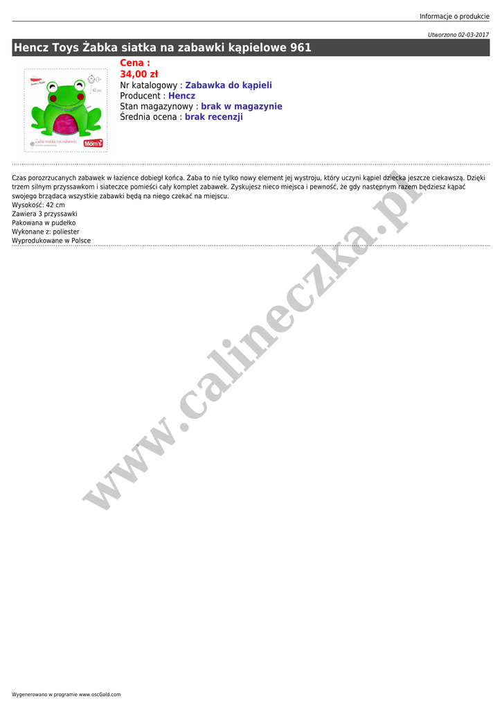 Informacje o produkcie Utworzono 02-03-2017 Hencz Toys Żabka siatka na zabawki kąpielowe 961 Cena : 34,00 zł Nr katalogowy : Zabawka do kąpieli Producent : Hencz Stan magazynowy : brak w magazynie Średnia ocena : brak recenzji w w w .c al in ec zk a. pl Czas porozrzucanych zabawek w łazience dobiegł końca. Żaba to nie tylko nowy element jej wystroju, który uczyni kąpiel dziecka jeszcze ciekawszą. Dzięki trzem silnym przyssawkom i siateczce pomieści cały komplet zabawek. Zyskujesz nieco miejsca i pewność, że gdy następnym razem będziesz kąpać swojego brządaca wszystkie zabawki będą na niego czekać na miejscu. Wysokość: 42 cm Zawiera 3 przyssawki Pakowana w pudełko Wykonane z: poliester Wyprodukowane w Polsce Wygenerowano w programie www.oscGold.com