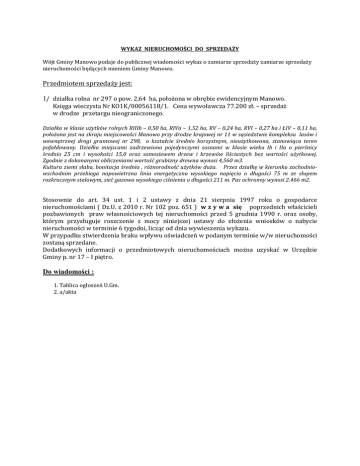 WYKAZ NIERUCHOMOŚCI DO SPRZEDAŻY Wójt Gminy Manowo podaje do publicznej wiadomości wykaz o zamiarze sprzedaży zamiarze sprzedaży nieruchomości będących mieniem Gminy Manowo. Przedmiotem sprzedaży jest: 1/ działka rolna nr 297 o pow. 2,64 ha, położona w obrębie ewidencyjnym Manowo. Księga wieczysta Nr KO1K/00056118/1. Cena wywoławcza 77.200 zł. – sprzedaż w drodze przetargu nieograniczonego. Działka w klasie użytków rolnych RIIIb – 0,50 ha, RIVa – 1,52 ha, RV – 0,24 ha, RVI – 0,27 ha i ŁIV – 0,11 ha, położona jest na skraju miejscowości Manowo przy drodze krajowej nr 11 w sąsiedztwie kompleksu lasów i wewnętrznej drogi gruntowej nr 298, o kształcie średnio korzystnym, nieużytkowana, stanowiąca teren pofałdowany. Działka miejscami zadrzewiona pojedynczymi sosnami w klasie wieku Ib i IIa o pierśnicy średnio 25 cm i wysokości 15,0 oraz samosiewem drzew i krzewów liściastych bez wartości użytkowej. Zgodnie z dokonanymi obliczeniami wartość grubizny drewna wynosi 4,560 m3. Kultura ziemi słaba, bonitacja średnia , różnorodność użytków duża. Przez działkę w kierunku zachodniowschodnim przebiega napowietrzna linia energetyczna wysokiego napięcia o długości 75 m ze słupem rozkracznym stalowym, sieć gazowa wysokiego ciśnienia o długości 211 m. Pas ochronny wynosi 2.466 m2. Stosownie do art. 34 ust. 1 i 2 ustawy z dnia 21 sierpnia 1997 roku o gospodarce nieruchomościami ( Dz.U. z 2010 r. Nr 102 poz. 651 ) w z y w a się poprzednich właścicieli pozbawionych praw własnościowych tej nieruchomości przed 5 grudnia 1990 r. oraz osoby, którym przysługuje roszczenie z mocy niniejszej ustawy do złożenia wniosków o nabycie nieruchomości w terminie 6 tygodni, licząc od dnia wywieszenia wykazu. W przypadku stwierdzenia braku wpływu oświadczeń w podanym terminie w/w nieruchomości zostaną sprzedane. Dodatkowych informacji o przedmiotowych nieruchomościach można uzyskać w Urzędzie Gminy p. nr 17 – I piętro. Do wiadomości : 1. Tablica ogłoszeń U.Gm. 2. a/akta