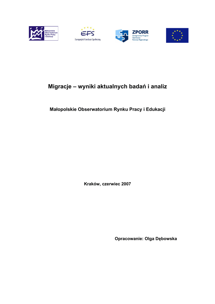 Migracje – wyniki aktualnych badań i analiz Małopolskie Obserwatorium Rynku Pracy i Edukacji Kraków, czerwiec 2007 Opracowanie: Olga Dębowska Publikacja powstała w Wojewódzkim Urzędzie Pracy w Krakowie w ramach projektu „Małopolskie Obserwatorium Rynku Pracy i Edukacji”. Projekt współfinansowany przez Unię Europejską z Europejskiego Funduszu Społecznego oraz budżet państwa w ramach Działania 2.1. Zintegrowanego Programu Operacyjnego Rozwoju Regionalnego Copyright © Wojewódzki Urząd Pracy w Krakowie, Kraków 2007 Wszelkie prawa zastrzeżone. 2 Spis treści Wstęp.......................................................................................................................................... 4 Charakterystyka wybranych badań na temat migracji ............................................................... 5 Problemy metodologiczne.......................................................................................................... 6 Motywy migracji ........................................................................................................................ 7 Szacunki dotyczące skali migracji ............................................................................................. 8 Kierunki emigracji...................................................................................................................... 9 Dane dotyczące województw w tym Małopolski..................................................................... 12 Portret polskiego emigranta ..................................................................................................... 12 Oczekiwania płacowe Polaków zainteresowanych podjęciem pracy za granicą ..................... 14 Imigracja................................................................................................................................... 15 Wnioski .................................................................................................................................... 16 Rekomendacje .......................................................................................................................... 18 Prognozy na przyszłość............................................................................................................ 20 Bibliografia............................................................................................................................... 22 3 Wstęp Poniższe opracowanie na temat migracji prezentuje w sposób syntetyczny wyniki najbardziej aktualnych badań, analiz i ekspertyz – polskich i zagranicznych – dotyczących wybranych aspektów migracji. Zagadnienia przedstawione w poniższym opracowaniu dotyczą zarówno emigracji jak i imigracji, koncentruje się ono jednak na analizie emigracji Polaków, której konsekwencje mają ogromne znaczenie dla polskiego rynku pracy. Opracowanie powstało na podstawie raportów z badań i analiz, do których dotarcie było możliwe dzięki przeglądowi artykułów prasowych na temat migracji publikowanych od momentu przystąpienia Polski do Unii Europejskiej. Analizowane były głównie źródła, na jakie powoływali się autorzy artykułów. Dzięki temu udało się wyselekcjonować najbardziej wartościowe opracowania, które potencjalnie mogą zainteresować szerokie grono odbiorców. Artykuły prasowe nie były jednak jedynym źródłem poszukiwania informacji o badaniach na temat migracji. Podczas poszukiwania informacji korzystano także z portali internetowych związanych z tematyką rynku pracy, polskich i zagranicznych instytucji i ośrodków badawczych zajmujących się migracjami oraz projektów, w ramach których prowadzone są badania migracji. Opracowanie jest zatem syntezą dostępnych informacji na temat migracji i odnosi się do kilku wybranych jej aspektów. Opracowanie łączy informacje na temat skali i kierunków zjawiska, z informacjami na temat metodologii badań migracji i problemów z tym związanych. W materiale zaprezentowano między innymi główne motywy migracji, szacunki dotyczące skali emigracji i jej kierunków. Przedstawiono również portret polskich emigrantów oraz motywy i oczekiwania płacowe osób chcących pracować za granicą. W podsumowaniu zaprezentowano wnioski, rekomendacje oraz prognozy na przyszłość płynące z badań emigracji zarobkowych Polaków. 4 Charakterystyka wybranych badań na temat migracji Poniżej zaprezentowano krótkie charakterystyki zrealizowanych w ostatnim czasie badań, które zostały wykorzystane na potrzeby tego opracowania. Jednymi z przedstawiających najbardziej aktualne dane na temat migracji są badania przeprowadzone przez Centrum Badania Opinii Społecznej (CBOS)1. W niniejszym opracowaniu odwołano się do dwóch badań, z których raporty opublikowano w listopadzie 2006 r. oraz marcu 2007 r. Dotyczyły one różnych aspektów migracji zarobkowych i są kontynuacją prac badawczych prowadzonych przez CBOS w poprzednich latach. Oba badania przeprowadzono wśród osób wylosowanych imiennie z operatu PESEL. Badanie „Praca Polaków w krajach UE” zrealizowano w dniach 6–9 października 2006 roku na liczącej 999 osób reprezentatywnej próbie losowej dorosłych mieszkańców Polski. Badanie dotyczyło przede wszystkim skali migracji oraz głównych jej kierunków. Badanie „Praca Polaków za granicą” przeprowadzono dwukrotnie na reprezentatywnej próbie losowej dorosłych mieszkańców Polski. W styczniu 2007 r. wzięły w nim udział 922 osoby, a w lutym 931 osób. Wśród wylosowanych respondentów znalazły się osoby, które nie mogły wziąć w nim udziału właśnie z powodu wyjazdu do pracy za granicę. Ich odsetek oszacowano na podstawie informacji od członków gospodarstw domowych, którzy byli obecni w miejscu zameldowania wylosowanej osoby. Szacunki te są jednak zaniżone, ponieważ nie o wszystkich nieobecnych wylosowanych do badania uzyskano informacje na temat miejsca ich po