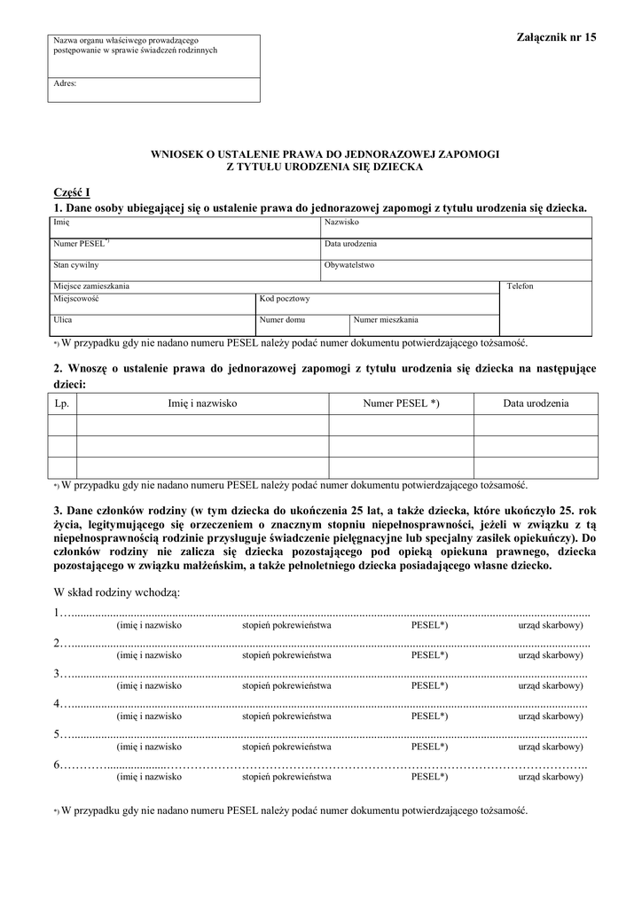 Załącznik nr 15 Nazwa organu właściwego prowadzącego postępowanie w sprawie świadczeń rodzinnych Adres: WNIOSEK O USTALENIE PRAWA DO JEDNORAZOWEJ ZAPOMOGI Z TYTUŁU URODZENIA SIĘ DZIECKA Część I 1. Dane osoby ubiegającej się o ustalenie prawa do jednorazowej zapomogi z tytułu urodzenia się dziecka. Imię Nazwisko Numer PESEL*) Data urodzenia Stan cywilny Obywatelstwo Miejsce zamieszkania Miejscowość Kod pocztowy Ulica Numer domu *) W Telefon Numer mieszkania przypadku gdy nie nadano numeru PESEL należy podać numer dokumentu potwierdzającego tożsamość. 2. Wnoszę o ustalenie prawa do jednorazowej zapomogi z tytułu urodzenia się dziecka na następujące dzieci: Lp. *) W Imię i nazwisko Numer PESEL *) Data urodzenia przypadku gdy nie nadano numeru PESEL należy podać numer dokumentu potwierdzającego tożsamość. 3. Dane członków rodziny (w tym dziecka do ukończenia 25 lat, a także dziecka, które ukończyło 25. rok życia, legitymującego się orzeczeniem o znacznym stopniu niepełnosprawności, jeżeli w związku z tą niepełnosprawnością rodzinie przysługuje świadczenie pielęgnacyjne lub specjalny zasiłek opiekuńczy). Do członków rodziny nie zalicza się dziecka pozostającego pod opieką opiekuna prawnego, dziecka pozostającego w związku małżeńskim, a także pełnoletniego dziecka posiadającego własne dziecko. W skład rodziny wchodzą: 1…............................................................................................................................................................................... (imię i nazwisko stopień pokrewieństwa PESEL*) urząd skarbowy) 2…............................................................................................................................................................................... (imię i nazwisko stopień pokrewieństwa PESEL*) urząd skarbowy) 3….............................................................................................................................................................................. (imię i nazwisko stopień pokrewieństwa PESEL*) urząd skarbowy) 4….............................................................................................................................................................................. (imię i nazwisko stopień pokrewieństwa PESEL*) urząd skarbowy) 5….............................................................................................................................................................................. (imię i nazwisko stopień pokrewieństwa PESEL*) urząd skarbowy) 6…………....................…………………………………………………………………………………………….. (imię i nazwisko *) W stopień pokrewieństwa PESEL*) urząd skarbowy) przypadku gdy nie nadano numeru PESEL należy podać numer dokumentu potwierdzającego tożsamość. 4. Inne dane 4.1. Łączna kwota alimentów świadczonych na rzecz innych osób wyniosła w roku ...........*) ............ zł..... gr. 4.2. W roku kalendarzowym poprzedzającym okres zasiłkowy lub po tym roku nastąpiła/nie nastąpiła**) utrata dochodu***). 4.3. W roku kalendarzowym poprzedzającym okres zasiłkowy lub po tym roku nastąpiło/nie nastąpiło**) uzyskanie dochodu****). *) Wpisać rok, z którego dochód stanowi podstawę ustalenia dochodu rodziny. **) Niepotrzebne skreślić. ***) Utrata dochodu, zgodnie z art. 3 pkt 23 ustawy z dnia 28 listopada 2003 r. o świadczeniach rodzinnych (Dz. U. z 2006 r. Nr 139, poz. 992, z późn. zm.), zwanej dalej „ustawą”, oznacza utratę dochodu spowodowaną: - uzyskaniem prawa do urlopu wychowawczego, - utratą prawa do zasiłku lub stypendium dla bezrobotnych, - utratą zatrudnienia lub innej pracy zarobkowej, z wyłączeniem pracy wykonywanej na podstawie umowy o dzieło, - utratą zasiłku przedemerytalnego lub świadczenia przedemerytalnego, nauczycielskiego świadczenia kompensacyjnego, a także emerytury lub renty, renty rodzinnej lub renty socjalnej, z wyjątkiem rent przyznanych rolnikom w związku z przekazaniem lub dzierżawą gospodarstwa rolnego, - wyrejestrowaniem pozarolniczej działalności gospodarczej, - utratą zasiłku chorobowego, świadczenia rehabilitacyjnego lub zasiłku macierzyńskiego, przysługujących po utracie zatrudnienia lub innej pracy zarobkowej, - utratą zasądzonych świadczeń alimentacyjnych w związku ze śmiercią osoby zobowiązanej do tych świadczeń. ****) Uzyskanie dochodu, zgodnie z art. 3 pkt 24 ustawy oznacza uzyskanie dochodu spowodowane: - zakończeniem urlopu wychowawczego, - uzyskaniem prawa do zasiłku lub stypendium dla bezrobotnych, - uzyskaniem zatrudnienia lub innej pracy zarobkowej, z wyłączeniem pracy wykonywanej na podstawie umowy o dzieło, - uzyskaniem zasiłku przedemerytalnego lub świadczenia przedemerytalnego, nauczycielskiego świadczenia kompensacyjnego, a także emerytury lub renty, renty rodzinnej lub renty socjalnej, z wyjątkiem rent przyznanych rolnikom w związku z przekazaniem lub dzierżawą gospodarstwa rolnego, - rozpoczęciem pozarolniczej działalności gospodarczej, - uzyskaniem zasiłku chorobowego, świadczenia rehabilitacyjnego lub zasiłku macierzyńskiego, przysługujących po utracie zatrudnienia lub innej pracy zarobkowej. .......................................................................................... (data, podpis osoby ubiegającej się) Część II 1) Oświadczenie dotyczące ustalenia prawa do jednorazowej zapomogi z tytułu urodzenia się dziecka Oświadczam, że: - powyższe dane są prawdziwe, - zapoznałam/zapoznałem się z warunkami uprawniającymi do jednorazowej zapomogi z tytułu urodzenia się dziecka, - członkowi rodziny nie przysługuje na dziecko świadczenie z tytułu urodzenia dziecka za granicą. W przypadku zmian mających wpływ na prawo do jednorazowej zapomogi z tytułu urodzenia się dziecka, w szczegó