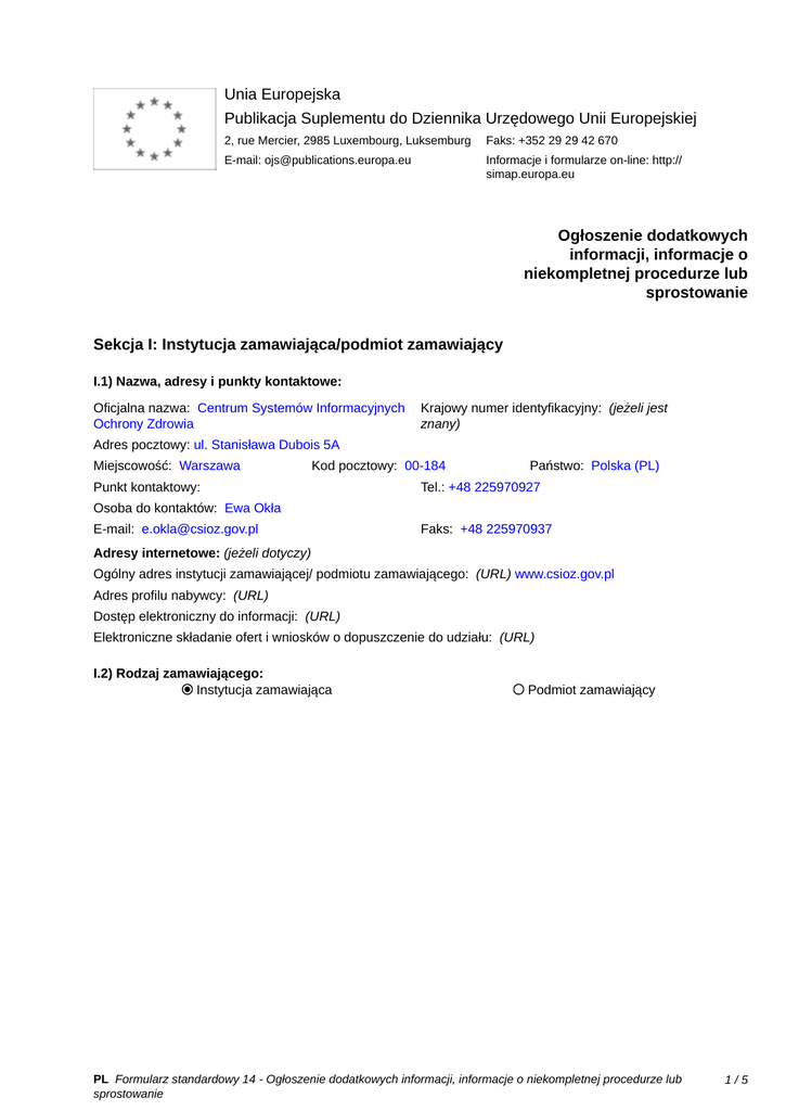 Unia Europejska Publikacja Suplementu do Dziennika Urzędowego Unii Europejskiej 2, rue Mercier, 2985 Luxembourg, Luksemburg Faks: +352 29 29 42 670 E-mail: [email protected] Informacje i formularze on-line: http:// simap.europa.eu Ogłoszenie dodatkowych informacji, informacje o niekompletnej procedurze lub sprostowanie Sekcja I: Instytucja zamawiająca/podmiot zamawiający I.1) Nazwa, adresy i punkty kontaktowe: Oficjalna nazwa: Centrum Systemów Informacyjnych Ochrony Zdrowia Krajowy numer identyfikacyjny: (jeżeli jest znany) _____ Adres pocztowy: ul. Stanisława Dubois 5A Miejscowość: Warszawa Kod pocztowy: 00-184 Punkt kontaktowy: _____ Państwo: Polska (PL) Tel.: +48 225970927 Osoba do kontaktów: Ewa Okła E-mail: [email protected] Faks: +48 225970937 Adresy internetowe: (jeżeli dotyczy) Ogólny adres instytucji zamawiającej/ podmiotu zamawiającego: (URL) www.csioz.gov.pl Adres profilu nabywcy: (URL) _____ Dostęp elektroniczny do informacji: (URL) _____ Elektroniczne składanie ofert i wniosków o dopuszczenie do udziału: (URL) _____ I.2) Rodzaj zamawiającego: Instytucja zamawiająca Podmiot zamawiający PL Formularz standardowy 14 - Ogłoszenie dodatkowych informacji, informacje o niekompletnej procedurze lub sprostowanie 1/5 Sekcja II: Przedmiot zamówienia II.1.1) Nazwa nadana zamówieniu: Przetłumaczenie na język polski, dokonanie weryfikacji tłumaczenia oraz korekty językowo - redakcyjnej Terminologii klinicznej SNOMED Clinical Terms® II.1.2) Krótki opis zamówienia lub zakupu: (podano w pierwotnym ogłoszeniu) Przedmiotem zamówienia jest: „Przetłumaczenie na język polski, dokonanie weryfikacji tłumaczenia oraz korekty językowo - redakcyjnej Terminologii klinicznej SNOMED Clinical Terms®”. Zamówienie jest podzielone na dwie części: Część I zamówienia: „Tłumaczenie na język polski Terminologii klinicznej SNOMED Clinical Terms® oraz przeprowadzenie pierwszej weryfikacji poprawności tłumaczenia.” Część II zamówienia: „Przeprowadzenie finalnej weryfikacji oraz korekty językowo-redakcyjnej polskiej wersji językowej Terminologii klinicznej SNOMED Clinical Terms® będącej przedmiotem zamówienia części I”. Szczegółowy opis przedmiotu zamówienia dla Części I i Części II znajduje się w Załączniku nr 1 do SIWZ. II.1.3) Wspólny Słownik Zamówień (CPV) Główny przedmiot Słownik główny 79530000 Słownik uzupełniający (jeżeli dotyczy) PL Formularz standardowy 14 - Ogłoszenie dodatkowych informacji, informacje o niekompletnej procedurze lub sprostowanie 2/5 Sekcja IV: Procedura IV.1)Rodzaj procedury (podano w pierwotnym ogłoszeniu) Otwarta Ograniczona Ograniczona przyspieszona Negocjacyjna Negocjacyjna przyspieszona Dialog konkurencyjny Negocjacyjna z uprzednim ogłoszeniem Negocjacyjna bez uprzedniego ogłoszenia Negocjacyjna z publikacją ogłoszenia o zamówieniu Negocjacyjna bez publikacji ogłoszenia o zamówieniu Udzielenie zamówienia bez uprzedniej publikacji ogłoszenia o zamówieniu w Dzienniku Urzędowym Unii Europejskiej IV.2)Informacje administracyjne IV.2.1)Numer referencyjny: (podano w pierwotnym ogłoszeniu) WZP.6151.42.2014 IV.2.2)Dane referencyjne ogłoszenia w przypadku ogłoszeń przesłanych drogą elektroniczną: Pierwotne ogłoszenie przesłane przez eNotices TED eSender Login: ENOTICES_tbanas Dane referencyjne ogłoszenia: 2014-098610 rok i numer dokumentu IV.2.3)Ogłoszenie, którego dotyczy niniejsza publikacja: Numer ogłoszenia w Dz.U.: 2014/S 143-257304 z dnia: 29/07/2014 (dd/mm/rrrr) IV.2.4)Data wysłania pierwotnego ogłoszenia: 25/07/2014 (dd/mm/rrrr) PL Formularz standardowy 14 - Ogłoszenie dodatkowych informacji, informacje o niekompletnej procedurze lub sprostowanie 3/5 Sekcja VI: Informacje uzupełniające VI.1) Ogłoszenie dotyczy: Procedury niepełnej Sprostowania Informacji dodatkowych VI.2) Informacje na temat niepełnej procedury udzielenia zamówienia: Postępowanie o udzielenie zamówienia zostało przerwane Postępowanie o udzielenie zamówienia uznano za nieskuteczne Zamówienia nie udzielono Zamówienie może być przedmiotem ponownej publikacji VI.3) Informacje do poprawienia lub dodania : VI.3.1) Zmiana oryginalnej informacji podanej przez instytucję zamawiającą Publikacja w witrynie TED niezgodna z oryginalną informacją, przekazaną przez instytucję zamawiającą Oba przypadki VI.3.2) W ogłoszeniu pierwotnym W odpowiedniej dokumentacji przetargowej (więcej informacji w odpowiedniej dokumentacji przetargowej) W obu przypadkach (więcej informacji w odpowiedniej dokumentacji przetargowej) VI.3.3) Tekst, który należy poprawić w pierwotnym ogłoszeniu Miejsce, w którym znajduje się Zamiast: Powinno być: zmieniany tekst: Część I zamówienia: Część I zamówienia: III.2.3) Kwalifikacje techniczne 2. Wykwalifikowany tłumacz 2. Wykwalifikowany tłumacz specjalizujący się w terminologii specjalizujący się w terminologii medycznej – 8 osób medycznej – 8 osób - posiada znajomość języka - posiada znajomość języka angielskiego potwierdzoną angielskiego na poziomie C2 certyfikatem C2 (poziom biegły) zgodnie z wytycznymi Europejskiego znajomość tłumaczonego języka Systemu Opisu Kształcenia zgodnie z założeniami Europejskiego Językowego (Common European Systemu Opisu Kształcenia Framework of Reference for Językowego (Common European Languages) potwierdzoną Framework of Reference for certyfikatem lub dyplomem Languages); ukończenia studiów wyższych o - posiada co najmniej pięcioletnie profilu tłumaczeniowym (filologia doświadczenie w tłumaczeniu angielska, lingwistyka stosowana, pisemnym z języka angielskiego na studia podyplomowe dotyczące język polski; tłumaczeń); - posiada co najmniej dwuletnie - posiada co najmniej pięcioletnie doświadczenie w tłumaczeniu z doświadczenie w tłumaczeniu zakresu terminologii medycznej; pisemnym z języka angielskiego na - dokonał tłumaczenia minimum język polski; 500 stron z zakre
