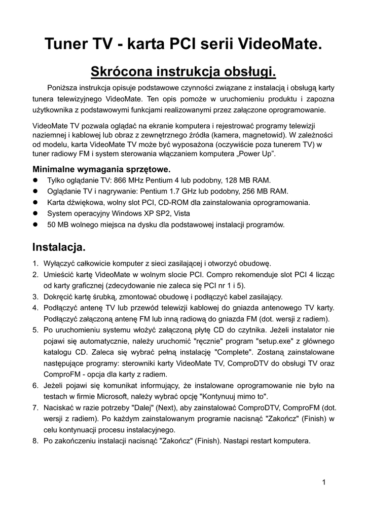 Tuner TV - karta PCI serii VideoMate. Skrócona instrukcja obsługi. Poniższa instrukcja opisuje podstawowe czynności związane z instalacją i obsługą karty tunera telewizyjnego VideoMate. Ten opis pomoże w uruchomieniu produktu i zapozna użytkownika z podstawowymi funkcjami realizowanymi przez załączone oprogramowanie. VideoMate TV pozwala oglądać na ekranie komputera i rejestrować programy telewizji naziemnej i kablowej lub obraz z zewnętrznego źródła (kamera, magnetowid). W zależności od modelu, karta VideoMate TV może być wyposażona (oczywiście poza tunerem TV) w tuner radiowy FM i system sterowania włączaniem komputera „Power Up”. Minimalne wymagania sprzętowe. z z z z z Tylko oglądanie TV: 866 MHz Pentium 4 lub podobny, 128 MB RAM. Oglądanie TV i nagrywanie: Pentium 1.7 GHz lub podobny, 256 MB RAM. Karta dźwiękowa, wolny slot PCI, CD-ROM dla zainstalowania oprogramowania. System operacyjny Windows XP SP2, Vista 50 MB wolnego miejsca na dysku dla podstawowej instalacji programów. Instalacja. 1. Wyłączyć całkowicie komputer z sieci zasilającej i otworzyć obudowę. 2. Umieścić kartę VideoMate w wolnym slocie PCI. Compro rekomenduje slot PCI 4 licząc od karty graficznej (zdecydowanie nie zaleca się PCI nr 1 i 5). 3. Dokręcić kartę śrubką, zmontować obudowę i podłączyć kabel zasilający. 4. Podłączyć antenę TV lub przewód telewizji kablowej do gniazda antenowego TV karty. Podłączyć załączoną antenę FM lub inną radiową do gniazda FM (dot. wersji z radiem). 5. Po uruchomieniu systemu włożyć załączoną płytę CD do czytnika. Jeżeli instalator nie pojawi się automatycznie, należy uruchomić "ręcznie" program "setup.exe" z głównego katalogu CD. Zaleca się wybrać pełną instalację "Complete". Zostaną zainstalowane następujące programy: sterowniki karty VideoMate TV, ComproDTV do obsługi TV oraz ComproFM - opcja dla karty z radiem. 6. Jeżeli pojawi się komunikat informujący, że instalowane oprogramowanie nie było na testach w firmie Microsoft, należy wybrać opcję "Kontynuuj mimo to". 7. Naciskać w razie potrzeby "Dalej" (Next), aby zainstalować ComproDTV, ComproFM (dot. wersji z radiem). Po każdym zainstalowanym programie nacisnąć "Zakończ" (Finish) w celu kontynuacji procesu instalacyjnego. 8. Po zakończeniu instalacji nacisnąć "Zakończ" (Finish). Nastąpi restart komputera. 1 Połączenia dodatkowe dla kart z funkcją “Power Up”. Funkcja “Power Up” umożliwia włączanie komputera pilotem lub automatyczne przez programator nagrań. System zostanie uruchomiony 5 minut przed zaplanowanym nagrywaniem (5 minut pozwoli na pewne i pełne załadowanie systemu Windows z wszystkimi aplikacjami samoczynnie uruchamiającymi się przy starcie). Zlokalizować konektor „Power SW” na płycie głównej. → 2. Odłączyć znajdującą się tam parę przewodów (od przycisku POWER na obudowie) i podłączyć ją do wejścia „Power SW” tunera TV. ← 3. Wolne obecnie złącze „Power SW” płyty głównej połączyć odpowiednim kablem (wyposażenie) z wyjściem „Mainboard” tunera TV. ↔ Sprawdź dokładnie wykonane połączenia. W razie pomyłki komputer może nie uruchamiać się lub funkcjonować nieprawidłowo. Jeżeli nie planujesz korzystać z funkcji „Power UP”, nie musisz wykonywać powyższych połączeń. 2 ComproDTV 3 Panel kontrolny programu ComproDTV 3 przypomina sterowanie magnetowidu. Należy zwrócić uwagę, że niektóre funkcje są dostępne tylko w określonych sytuacjach zależnych od odbieranego programu TV, czy posiadanego sprzętu. Poniższe rysunki prezentują funkcje przycisków i odpowiadające im skróty klawiaturowe (Hot Key). Kanał w górę (Page Up) Stop Siła głosu z listą (I) (S) (- , +) Klawiatura Nagrywanie (R) Numeryczna Opcje nagrywania (W) Play (P) Kanał w dół Mute – Wyciszenie Pauza (U) (Page down) (M) Blokada Pomoc Dokowanie Minimalizacja Pełny ekran Zamknięcie panela (H) (D) (G) (Z) (CTRL+X) Przesuwanie do tyłu Wskaźnik funkcji Przesuwanie do przodu (Strzałka w lewo) “Timeshift” (Strzałka w prawo) Poziom dźwięku Klawiatura numeryczna Brak funkcji Przegląd wielu kanałów (F) Opcje (O) Zdjęcie z ekranu Programator (B) Odtwarzanie z Powrót do poprzedniego powtórzeniem kanału (N) Timeshift (Spacja) (T) Napisy (NTSC) Teletext (X) Informacje na wyświetlaczu: Aktywne źródło Źródło (V) Dodaj okno Usuń okno Zamiana Zamknięcie okien podglądu (F3) podglądu (F2) okien (F5) podglądu (F6) EPG (E) Brak funkcji HotKey Opis A Włącza / wyłącza tryb “zawsze na wierzchu”. (Pomarańczowy znak w prawym górnym rogu ekranu TV) L Aktywacja i ustawianie timera. Typ fonii Typ ekranu 3 Rozwiązywanie problemów. Sterowniki. Większość problemów w użytkowaniu kart telewizyjnych wynika z nieprawidłowej instalacji sterowników (sterowniki WDM – Windows Device Model). Jeżeli masz problemy podczas oglądania TV, nagrywania lub korzystania z funkcji timeshifting live TV, proszę sprawdzić stan sterowników WDM w Menadżerze urządzeń systemu Windows. Jeżeli sterowników tam nie ma lub coś jest z nimi nie w porządku, proszę odinstalować VideoMate TV i zainstalować ponownie. Należy korzystać z systemowej funkcji Dodaj/Usuń programy. Reinstalacja sterowników powinna rozwiązać problem. Jeżeli problem nadal występuje, może to oznaczać konflikt przerwań IRQ. Na przykład karta sieciowa lub dźwiękowa w komputerze korzysta z tego samego przerwania IRQ co tuner TV VideoMate. Użyj Menadżera Urządzeń do zdiagnozowania problemu: wybierz opcje „Widok - > Zasoby według typu" i kliknij na znaczek "+" obok „Żądanie przerwania (IRQ)”. Jeżeli jakieś inne urządzenie współdzieli przerwanie z tunerem TV, wyjmij kartę TV i umieść ją w innym slocie PCI. Następnie odinstaluj i zainstaluj ponownie sterownik do karty. Takie działanie powinno w końcu przynieść oczekiwany rezultat w postaci samodz