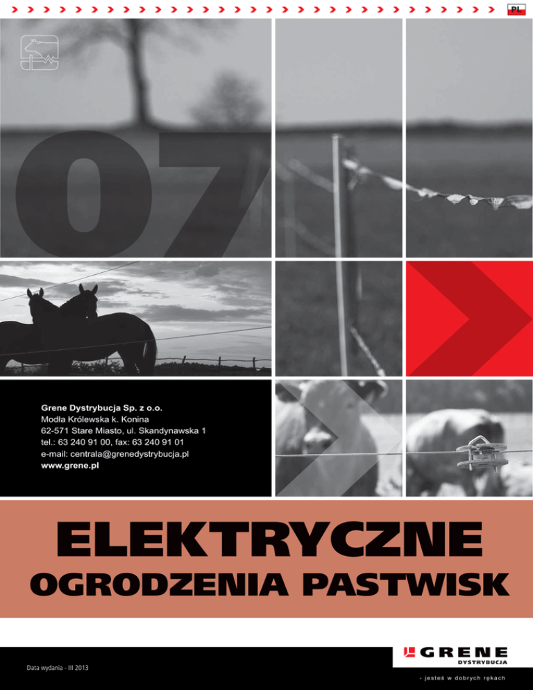 PL 07 Grene Dystrybucja Sp. z o.o. Modła Królewska k. Konina 62-571 Stare Miasto, ul. Skandynawska 1 tel.: 63 240 91 00, fax: 63 240 91 01 e-mail: [email protected] www.grene.pl Elektryczne ogrodzenia pastwisk Data wydania - III 2013 - jesteś w dobrych rękach SPIS TREŚCI Niezbędne elementy dobrego ogrodzenia........................................................................................ 4 Optymalne wysokości ogrodzeń elektrycznych............................................................................. 5 jak działają ogrodzenia elektryczne................................................................................................ 6 Opis używanych symboli....................................................................................................................... 7 Elektryzatory i zasilacze...................................................................................................................... 8 Baterie..................................................................................................................................................... 15 Plecionki, linki, taśmy, drut, siatki i złączki.................................................................................... 17 Paliki........................................................................................................................................................ 23 Izolatory................................................................................................................................................. 25 Zestawy bramowe................................................................................................................................. 31 Akcesoria................................................................................................................................................ 34 Spis produktów...................................................................................................................................... 37 Spis indeksów......................................................................................................................................... 38 Jeśli nie znalazłeś tego czego szukasz w tym katalogu - zadzwoń do nas. Postaramy się pomóc. Oferta handlowa firmy GRENE DYSTRYBUCJA obejmuje również produkty z następujących kategorii: Części do maszyn rolniczych Hydraulika siłowa Artykuły gospodarcze Części do ciągników rolniczych Artykuły do hodowli zwierząt Narzędzia warsztatowe Artykuły znormalizowane Artykuły Jeździeckie Odzież robocza i artykuły BHP Ogrodzenia elektryczne Wyposażenie pojazdów Transmisja i przeniesienie napędu Artykuły ogrodnicze Zabawki Str. 3 - jesteś w dobrych rękach Elektryczne ogrodzenia pastwisk niezbędne elementy dobrego ogrodzenia + 180 cm + 165 cm + 150 cm + 135 cm + 120 cm + 105 cm + 90 cm + 75 cm + 60 cm + 45 cm + 30 cm + 15 cm +/- 0 cm - 15 cm - 30 cm 1 2 Elektryzatory i zasilacze Str. 8 6 11 Tabliczka ostrzegawcza do ogrodzeń. Str. 34 Odgromnik do ogrodzeń elektrycznych Str. 34 Przewód łączący taśmę z taśmą. Str. 21 Plecionki, linki, taśmy, drut, siatki i złączki. Str. 17 8 Przewód łączący elektryzator z taśmą Str. 21 12 9 13 IIzolatory Str. 25 Str. 4 - 60 cm Palik drewniany „Octo Wood” Str. 24 10 14 Palik z polipropylenu Str. 23 - 45 cm 5 Bagnet uziemiający Str. 35 Kabel podziemny wysokiego napięcia Str. 34 7 IIzolatory Str. 25 4 3 Zestawy bramowe Str. 32 15 Złączka do taśmy Str. 21 Naciąg do drutu Str. 35 Elektryczne ogrodzenia pastwisk optymalne wysokości ogrodzeń elektrycznych Str. 5 - jesteś w dobrych rękach Elektryczne ogrodzenia pastwisk jak działają ogrodzenia elektryczne Elektryzator Przewodniki Izolatory Paliki Bagnet uziemiający Ogrodzenie elektryczne składa się z : 1. Elektryzatora wytwarzającego regularne impulsy energii 2. Jednego lub więcej przewodów linii (drut, taśma, plecionka, linka) przewodzą prąd na całej długości ogrodzenia elektrycznego 3. Izolatorów zapobiegających skierowaniu prądu do ziemi 4. Uziemienia ogrodzenia elektrycznego, które powinno być wprowadzone możliwie jak najgłębiej w wilgotną glebę (1m) Gdy zwierzę dotknie lini ogrodzenia obwód elektryczny zostaje zamknięty, czyli prąd przepływa przez ciało zwierzęcia i wraca glebą do elektryzatora. Zwierzę zostaje porażone prądem w sposób nieprzyjemny, ale nieszkodliwy dla niego i wycofuje się. Uziemienie Stanowi ważną część obwodu elektrycznego. Aby zagwarantować nieutrudniony przepływ zwrotny prądu przez glebę do elektryzatora, styczność pomiędzy prętem uziemiającym a glebą powinna być jak najlepsza (gleba, która jest słabo wilgotna nie zapewnia odpowiedniego przewodnictwa). Podczas umieszczania prętów w glebie należy wybierać miejsca wilgotne, przy czym pręt musi posiadać odpowiednią długość, aby dosięgnąć do głębszych partii wilgotnej gleby. Napięcie ogrodzenia i energia impulsu MAX MAX OUT Szczyt impulsu elektrycznego wytwarzanego przez elektryzator to napięcie ogrodzenia linii. Wysokie napięcie jest konieczne do wytworzenia odpowiedniego kanału przepływu pomiędzy linią ogrodzenia a ciałem zwierzęcia. Minimalne napięcie musi wynosić 2500V dla zwierząt gospodarskich, ale dla zwierząt z długą i grubą sierścią oraz leśnych minimalne napięcie to 4000V. Samo napięcie elektryczne nie jest bolesne. Oznacza to że wydajność wstrząsu zależna jest od ilości impulsów energi mierzonych w J „dżulach” i to decyduje o sile uderzenia, które zwierzę odczuwa w momencie kontaktu z linią ogrodzenia. Im trudniej zwierzę ustepuje, tym większa moc jest potrzebna, aby utrzymać je wewnątrz ogrodzonego terenu lub odpędzić. Ponadto potrzeba zwiększenia impulsów energi zwiększa się wraz z długością lini ogrodzenia i ewentualnymi stratami (np. związanymi z wegetacją roślin). Im więcej mocy dostarcza elektryzator, tym wi