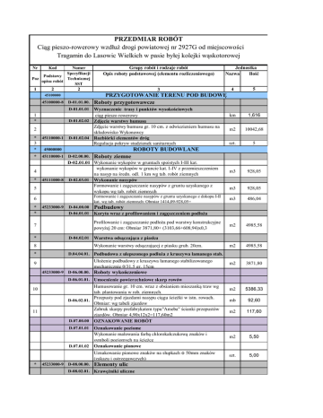PRZEDMIAR ROBÓT Ciąg pieszo-rowerowy wzdłuż drogi powiatowej nr 2927G od miejscowości Tragamin do Lasowic Wielkich w pasie byłej kolejki wąskotorowej Nr Numer Specyfikacji Podstawy Poz Technicznej opisu robót SST 1 Kod 2 2 45100000 45100000-8 Grupy robót i rodzaje robót Opis roboty podstawowej (elementu rozliczeniowego) D-01.01.00. Jednostka Nazwa Ilość 3 4 5 km 1,616 m2 10042,68 szt. 5 m3 928,05 m3 928,05 m3 486,04 m2 4985,58 m2 4985,58 m2 3871,80 m2 5386,33 mb 92,60 m2 117,60 m2 5,50 szt. 5,00 PRZYGOTOWANIE TERENU POD BUDOWĘ Roboty przygotowawcze Wyznaczenie trasy i punktów wysokościowych ciąg pieszo rowerowy D-01.02.02 Zdjęcie warstwy humusu Zdjęcie warstwy humusu gr. 10 cm. z odwiezieniem humusu na składowisko Wykonawcy D-01.02.04 Rozbiórki elementów dróg Regulacja pokryw studzienek sanitarnych D-01.01.01 1 * 2 * 3 * 45110000-1 * 45110000-1 4 * 5 ROBOTY BUDOWLANE 45000000 D-02.00.00. D-02.01.01 Wykonanie wykopów w gruntach spoistych I-III kat. wykonanie wykopów w gruncie kat. I-IV z przemieszczeniem na nasyp na średn. odl. 1 km wg tab. robót ziemnych 45111000-8 D-02.03.01 Wykonanie nasypów Formowanie i zagęszczanie nasypów z gruntu uzyskanego z wykopu wg tab. robót ziemnych Formowanie i zagęszczanie nasypów z gruntu uzyskanego z dokopu I-II kat. wg tab. robót ziemnych: Obmiar 1414,09-928,05= 6 * * Roboty ziemne 45233000-9 D-04.00.00 Podbudowy D-04.01.01 Koryto wraz z profilowaniem i zagęszczeniem podłoża Profilowanie i zagęszczanie podłoża pod warstwy konstrukcyjne powyżej 20 cm: Obmiar 3871,80+ (3103,66+608,94)x0,3 7 * D-04.02.01 Warstwa odsączająca z piasku Wykonanie warstwy odsączającej z piasku grub. 20cm. 8 * D.04.04.01. Podbudowa z ulepszonego podłoża z kruszywa łamanego stab. Ułożenie podbudowy z kruszywa łamanego stabilizowanego mechanicznie 0/31,5 gr. 15cm 9 45233000-9 D-06.00.00. Roboty wykończeniowe D-06.01.01. Umocnienie powierzchniowe skarp rowów Humusowanie gr. 10 cm. wraz z obsianiem mieszanką traw wg tab. plantowania w rob. ziemnych. Przepusty pod zjazdami nasypu ciągu ścieżki w istn. rowach. D-06.02.01. Obmiar: wg tabeli zjazdow Zabruk skarpy prefabrykatem typu"Ameba" ścianki przepustów zjazdów. Obmiar 4,90x12x2=117,60m2 D.07.00.00 OZNAKOWANIE ROBÓT 10 11 Oznakowanie poziome Wykonanie malowania farbą chlorokałczukową znaków i symboli poziomych na ścieżce D.07.01.02 Oznakowanie pionowe D.07.01.01 Uznakowanie pionowe znaków na słupkach o 50mm znaków (zakazu i ostrzegawczych) * 45233000-9 D-08.00.00. Elementy ulic D-08.02.01. Krawężniki uliczne 12 * 45233100 13 14 * * 45233000-9 Ustawienie krawężników jako oporniki z oporem betonowym przy zjazdach do km 0+000 do km 1+616 D-08.02.02. Chodniki z kostki brukowej betonowej Ciągi pieszo-rowerowe i z kostki brukowej betonowej chodnik szara, (bezfazowa kolor czerwony ścieżka rowerowa) gr. 6 cm. na podsypce cem-piask. gr. 3 cm. D-08.03.01. Obrzeża betonowe Obrzeża betonowe na ławie betonowej z oporem ciąg pieszo rowerowy. D-10.00.00. 608,94 m2 3871,80 m 3103,66 m2 784,55 km 1,616 Inne roboty D-10.07.01. Zjazdy do gospodarstw i na drogi boczne Nawierzchnia zjazdu o konstrukcji: - kostka betonowa gr. 8 cm. na podsypce cementowo-piaskowej gr. 3 cm - podbudowa z kruszywa lamanego stabilizowanego mechanicznie gr. 25cm. Obramowanie poz 12. z opornika bet. 12x25z oporem. - warstwa odcinająca z piasku grub. 20cm. 15 * 16 m GG.00.12.01. Geodezyjny pomiar powykonawczy Pomiar powykonawczy zrealizowanych obiektów drogowych