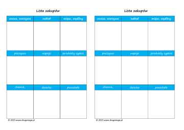 Lista zakupów Lista zakupów owoce, warzywa nabiał mięso, wędliny owoce, warzywa nabiał mięso, wędliny pieczywo napoje produkty sypkie pieczywo napoje produkty sypkie chemia, dziecko pozostałe chemia, dziecko pozostałe kosmetyki © 2015 www.druganoga.pl kosmetyki © 2015 www.druganoga.pl