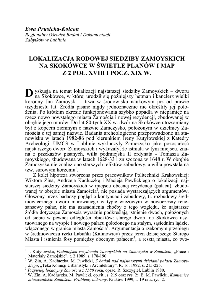 Ewa Prusicka-Kołcon Regionalny Ośrodek Badań i Dokumentacji Zabytków w Lublinie LOKALIZACJA RODOWEJ SIEDZIBY ZAMOYSKICH NA SKOKÓWCE W ŚWIETLE PLANÓW I MAP Z 2 POŁ. XVIII I POCZ. XIX W. na temat lokalizacji najstarszej siedziby Zamoyskich – dworu D nayskusja Skokówce, w której urodził się późniejszy hetman i kanclerz wielki koronny Jan Zamoyski – trwa w środowisku naukowym juŜ od prawie trzydziestu lat. Źródła pisane nigdy jednoznacznie nie określiły jej połoŜenia. Po krótkim okresie funkcjonowania szybko popadła w niepamięć na rzecz nowo powstałego miasta Zamościa i nowej rezydencji, zbudowanej w obrębie jego murów. Do lat 80-tych XX w. dwór na Skokówce utoŜsamiany był z kopcem ziemnym o nazwie Zamczysko, połoŜonym w dzielnicy Zamościa o tej samej nazwie. Badania archeologiczne przeprowadzone na stanowisku w latach 1982-86 pod kierunkiem Ireny Kutyłowskiej z Katedry Archeologii UMCS w Lublinie wykluczyły Zamczysko jako pozostałość najstarszego dworu Zamoyskich i wykazały, Ŝe istniała w tym miejscu, znana z przekazów pisanych, willa podmiejska II ordynata - Tomasza Zamoyskiego, zbudowana w latach 1628-33 i zniszczona w 1648 r. W obrębie Zamczyska nie znaleziono starszych reliktów zabudowy, a willa powstała na tzw. surowym korzeniu1. Z kolei hipoteza stworzona przez pracowników Politechniki Krakowskiej: Wiktora Zina, Andrzeja Kadłuczkę i Macieja Pawlickiego o lokalizacji najstarszej siedziby Zamoyskich w miejscu obecnej rezydencji (pałacu), zbudowanej w obrębie miasta Zamościa2, nie posiada wystarczających argumentów. Głoszony przez badaczy pogląd o kontynuacji zabudowy, tj. rozbudowy średniowiecznego dworu murowanego w typie wieŜowym w nowoczesny renesansowy pałac, nie ma uzasadnienia choćby z tego względu, Ŝe najstarsze źródła dotyczące Zamościa wyraźnie podkreślają istnienie dwóch, połoŜonych od siebie w pewnej odległości obiektów: starego dworu na Skokówce usytuowanego na wyspie i nowego pałacu połoŜonego na stałym, sąsiednim lądzie, włączonego w granice miasta Zamościa3. Argumentacja o rzekomym przebiegu w średniowieczu rzeki Łabuńki (Kalinowicy) przez teren dzisiejszego Starego Miasta i istnienia fosy pomiędzy obecnym pałacem4, a resztą miasta, co two1 I. Kutyłowska, Podmiejska rezydencja Zamoyskich na Zamczysku w Zamościu, „Prace i Materiały Zamojskie”, t. 2:1989, s. 178-190. 2 W. Zin, A. Kadłuczka, M. Pawlicki, Z badań nad najstarszymi dziejami pałacu Zamoyskiego, „Teka Komisji Urbanistyki i Architektury”, R. 16: 1982, s. 215-225. 3 Przywilej lokacyjny Zamościa z 1580 roku, oprac. R. Szczygieł, Lublin 1980. 4 W. Zin, A. Kadłuczka, M. Pawlicki, op.cit., s. 219 oraz rys. 2; B. M. Pawlicki, Kamienice mieszczańskie Zamościa. Problemy ochrony. Kraków 1999, s. 19 oraz ryc. 2. Ewa Prusicka-Kołcon rzyłoby w ten sposób wyspę, nie ma z kolei uzasadnienia w wynikach badań archeologicznych. Wykazują one bowiem wysoki poziom lessowego calca na terenie Starego Miasta oraz brak warstwy zasypiskowej o stosunkowo duŜej miąŜszości, która musiałaby powstać w czasie wyrównywania starego koryta rzeki lub fosy pod budowę miasta5. W koncepcji M. Pawlickiego, W. Zina i A. Kadłuczki fundatorami murowanej wieŜy byli Ostrowscy – właściciele Skokówki do 1517 r. Tymczasem wiemy, Ŝe zarówno Ostrowscy jak i Feliks Zamoyski – dziad hetmana (akcentowany przez Jana Zamoyskiego w dokumentach jako faktyczny fundator dworu na Skokówce), nie byli wystarczająco bogaci, aby wystawić okazałą, murowaną siedzibę. Murowane wieŜowe siedziby, były w średniowieczu kosztownymi inwestycjami o duŜej wymowie prestiŜowej. Takie obiekty wznosili władcy oraz najbogatsi dostojnicy świeccy i kościelni. Tymczasem oba rody: Ostrorogowie i Zamoyscy byli w tym czasie drobną, kilkuwioskową szlachtą, przybyłą z ubogiego Mazowsza. RównieŜ bardzo waŜnym argumentem przemawiającym na niekorzyść hipotezy jest brak wzmianki na temat dworu na Skokówce w lustracji ziemi chełmskiej województwa ruskiego z 1564-1565 r6. Gdyby na Skokówce stała wówczas okazała siedziba lub przynajmniej zrujnowany, murowany obiekt, wspomniano by o tym niewątpliwie, bowiem w dokumencie tym wymienione zostały wszystkie waŜniejsze obiekty obronne, a przede wszystkim wszystkie tego typu dwory murowane. Jeszcze jedna hipoteza, mówiąca o lokalizacji dworu Zamoyskich w pobliskiej wsi śdanów, która od 1517 r. naleŜała do Zamoyskich, została negatywnie zweryfikowana badaniami archeologicznymi. Hipoteza powstała w związku z zapisem źródłowym mówiącym o tym, Ŝe przed 1458 r. od swojego brata Jakuba ze śdanowa ówczesny właściciel Skokówki – Niemierza ze Skokowic7 wziął w zastaw tzw. Ostrowie (wyspę?), a wiadomo, Ŝe dwór na Skokówce nie leŜał na stałym lądzie. Trudno wskazać z braku źródeł, czy zastaw ten został zwrócony, czy teŜ pozostał w rękach Niemierzy i czy przejęli go Mikołaj i Feliks Zamoyscy obejmując w 1517 r. śdanów i Skokówkę na stałe. Nie jest równieŜ znana dokładna lokalizacja Ostrowia. W czasie badań archeologicznych przeprowadzonych w latach 1992-94 przez autorkę niniejszego artykułu w śdanowie na terenie browaru Ordynacji Zamoyskiej, zbudowanego w latach 1775-1791, poszukiwano starszej zabudowy. Browar bowiem został wystawiony na lekkim wyniesieniu terenowym wśród podmokłych łąk, niegdyś oblanym wodą rzeki Topornicy, które stworzyły w ten sposób małą wysepkę. Ba5 M.in. T. Nawrolski, Zamość – Stare Miasto. Nadzory archeologiczne, t. I – II. Zamość 1980, dokumentacja w archiwum Regionalnego Ośrodka Badań i Dokumentacji Zabytków w Lublinie; TenŜe, Zamość – Rynek Wielki. Dokumentacja z badań archeologicznych, Zamość 1979, dokumentacja w archiwum Regionalnego Ośrodka Badań i Dokumentacji Zabytków w Lublinie; A. Witkowski, Stare Miasto. Blok IX. Zamość 1987, dokumentacja w archiwum Regionalnego Ośrodk