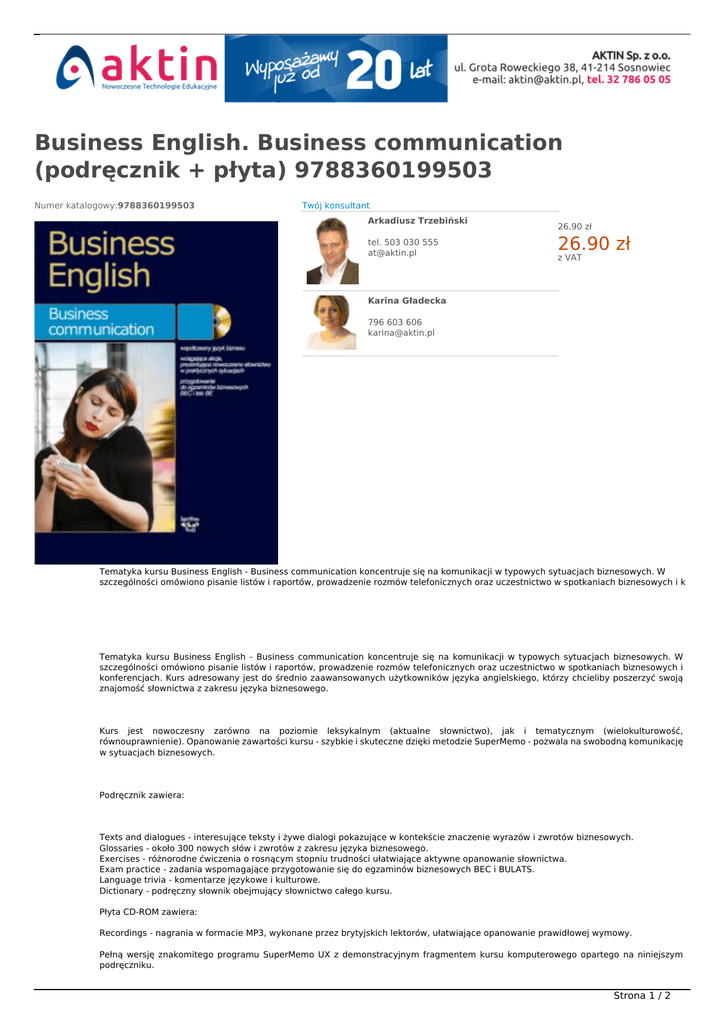 Business English. Business communication (podręcznik + płyta) 9788360199503 Numer katalogowy:9788360199503 Twój konsultant Arkadiusz Trzebiński tel. 503 030 555 [email protected] NOWOŚĆ W OFERCIE 26.90 zł 26.90 zł z VAT Karina Gładecka 796 603 606 [email protected] Tematyka kursu Business English - Business communication koncentruje się na komunikacji w typowych sytuacjach biznesowych. W szczególności omówiono pisanie listów i raportów, prowadzenie rozmów telefonicznych oraz uczestnictwo w spotkaniach biznesowych i k Tematyka kursu Business English - Business communication koncentruje się na komunikacji w typowych sytuacjach biznesowych. W szczególności omówiono pisanie listów i raportów, prowadzenie rozmów telefonicznych oraz uczestnictwo w spotkaniach biznesowych i konferencjach. Kurs adresowany jest do średnio zaawansowanych użytkowników języka angielskiego, którzy chcieliby poszerzyć swoją znajomość słownictwa z zakresu języka biznesowego. Kurs jest nowoczesny zarówno na poziomie leksykalnym (aktualne słownictwo), jak i tematycznym (wielokulturowość, równouprawnienie). Opanowanie zawartości kursu - szybkie i skuteczne dzięki metodzie SuperMemo - pozwala na swobodną komunikację w sytuacjach biznesowych. Podręcznik zawiera: Texts and dialogues - interesujące teksty i żywe dialogi pokazujące w kontekście znaczenie wyrazów i zwrotów biznesowych. Glossaries - około 300 nowych słów i zwrotów z zakresu języka biznesowego. Exercises - różnorodne ćwiczenia o rosnącym stopniu trudności ułatwiające aktywne opanowanie słownictwa. Exam practice - zadania wspomagające przygotowanie się do egzaminów biznesowych BEC i BULATS. Language trivia - komentarze językowe i kulturowe. Dictionary - podręczny słownik obejmujący słownictwo całego kursu. Płyta CD-ROM zawiera: Recordings - nagrania w formacie MP3, wykonane przez brytyjskich lektorów, ułatwiające opanowanie prawidłowej wymowy. Pełną wersję znakomitego programu SuperMemo UX z demonstracyjnym fragmentem kursu komputerowego opartego na niniejszym podręczniku. Strona 1 / 2 Przykładowe słownictwo zawarte w tym podręczniku: Overdue - unpaid after the agreed date of payment exercise a right - use one's legal privileges in compliance with - in accordance with, following (laws, regulations, etc.) comprehensive - complete, full tied up - (for a person) unable to speak, busy (e.g. in a meeting) time-sensitive - requiring punctuality and timeliness Kurs jest dostępny również w wersji multimedialnej na płycie DVD-ROM. Obejmuje wszystkie 5 części kursu i zawiera cały materiał serii. Nagrania MP3 Oprócz samego kursu na płycie z programem zamieszczone są również dodatkowe nagrania w formacie MP3 dające możliwość słuchania tekstów i powtarzania słownictwa z dowolnego odtwarzacza MP3, na przykład w czasie spaceru lub jazdy samochodem. Wymagania sprzętowe dla nagrań MP3 dowolny odtwarzacz mp3 (w tym CD/mp3 i DVD/mp3), niektóre modele telefonów komórkowych. Strona 2 / 2 Powered by TCPDF (www.tcpdf.org)
