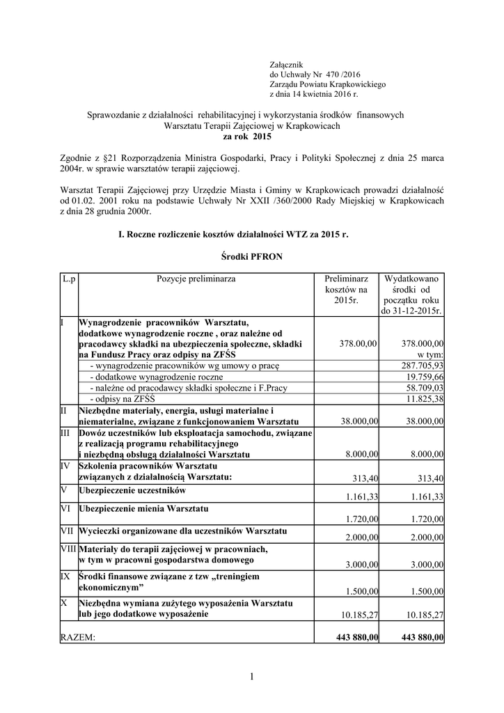 Załącznik do Uchwały Nr 470 /2016 Zarządu Powiatu Krapkowickiego z dnia 14 kwietnia 2016 r. Sprawozdanie z działalności rehabilitacyjnej i wykorzystania środków finansowych Warsztatu Terapii Zajęciowej w Krapkowicach za rok 2015 Zgodnie z §21 Rozporządzenia Ministra Gospodarki, Pracy i Polityki Społecznej z dnia 25 marca 2004r. w sprawie warsztatów terapii zajęciowej. Warsztat Terapii Zajęciowej przy Urzędzie Miasta i Gminy w Krapkowicach prowadzi działalność od 01.02. 2001 roku na podstawie Uchwały Nr XXII /360/2000 Rady Miejskiej w Krapkowicach z dnia 28 grudnia 2000r. I. Roczne rozliczenie kosztów działalności WTZ za 2015 r. Środki PFRON Pozycje preliminarza L.p Preliminarz kosztów na 2015r. Wydatkowano środki od początku roku do 31-12-2015r. I Wynagrodzenie pracowników Warsztatu, dodatkowe wynagrodzenie roczne , oraz należne od pracodawcy składki na ubezpieczenia społeczne, składki na Fundusz Pracy oraz odpisy na ZFŚS - wynagrodzenie pracowników wg umowy o pracę - dodatkowe wynagrodzenie roczne - należne od pracodawcy składki społeczne i F.Pracy - odpisy na ZFŚŚ II Niezbędne materiały, energia, usługi materialne i niematerialne, związane z funkcjonowaniem Warsztatu III Dowóz uczestników lub eksploatacja samochodu, związane z realizacją programu rehabilitacyjnego i niezbędną obsługą działalności Warsztatu IV Szkolenia pracowników Warsztatu związanych z działalnością Warsztatu: V Ubezpieczenie uczestników 378.00,00 378.000,00 w tym: 287.705,93 19.759,66 58.709,03 11.825,38 38.000,00 38.000,00 8.000,00 8.000,00 313,40 313,40 1.161,33 1.161,33 1.720,00 1.720,00 2.000,00 2.000,00 3.000,00 3.000,00 1.500,00 1.500,00 10.185,27 10.185,27 443 880,00 443 880,00 VI Ubezpieczenie mienia Warsztatu VII Wycieczki organizowane dla uczestników Warsztatu VIII Materiały do terapii zajęciowej w pracowniach, w tym w pracowni gospodarstwa domowego IX Środki finansowe związane z tzw „treningiem ekonomicznym” X Niezbędna wymiana zużytego wyposażenia Warsztatu lub jego dodatkowe wyposażenie RAZEM: 1 Informacja o wykorzystaniu przez Warsztat środków finansowych wg poszczególnych pozycji preliminarza: I. Wynagrodzenie pracowników Warsztatu, dodatkowe wynagrodzenie roczne, oraz należne od pracodawcy składki na ubezpieczenia społeczne, składki na Fundusz Pracy oraz odpisy na ZFŚS 378.000,00 Wynagrodzenia pracowników na podstawie umów o pracę Pochodne od wynagrodzeń Dodatkowe wynagrodzenie roczne Pochodne od dodatkowego wynagrodzenia rocznego Odpisy na ZFŚS 287.705,93 54.866,67 19.759,66 3.842,36 11.825,38 II. Niezbędne materiały, energia, usługi materialne i niematerialne, związane z Funkcjonowaniem Warsztatu - 38.000,00 1) telefon, Internet · 2) energia elektryczna 3) zużycie wody i ścieki 4) wywóz nieczystości 5) ogrzewanie 6) usługi konserwacyjne, przeglądy, aktualizacja oprogram., usł.pocztowe, badania profilaktyczne, umowy zlecenia, dorabianie kluczy, usł. transport. mat.do ter. 7) ekwiwalent za odzież 8) prenumerata, zakup znaczków i mat. biurowych,tusz,druki,myszka do komputera 9) gładź gipsowa, śruby,śr. czystości, zamki do drzwi toalet, kronika, art.I pomocy, 10) wieszaki dla uczestników WTZ 3.114,38 4.594,27 1.727,53 810,00 9.820,97 8.663,27 1.220,52 4.111,08 3.920,00 17,98 III. Dowóz uczestników lub eksploatacja samochodu, związane z realizacją programu rehabilitacyjnego i niezbędną obsługą działalności Warsztatu - 8.000,00 1) zakup paliwa 2) obowiązkowe ubezpieczenie OC oraz AC,NNW,HCK.KR 3) klocki hamulcowe,środki pielęgnacyjne, płyn do spryskiw. 4) przeglądy, wymiana opon,filtrów i klocków ham. 1.966,31 1.193,00 927,64 3.913,05 IV. Szkolenia pracowników Warsztatu związanych z działalnością Warsztatu : Pracownicy WTZ w 2015 r. brali udział w szkoleniach : - „Wydatki Strukturalne” Koszty delegacji służbowych związanych ze szkoleniami i wyjazdami V. Ubezpieczenie uczestników 313,40 250,00 63,40 1.161,33 Ubezpieczenie następstw nieszczęśliwych wypadków (NNW) dla 30 uczestników WTZ zostało zawarte z Powszechnym Zakładem Ubezpieczeń S. A. na podstawie Polisy Seria TPP Nr 1006715551 VI. Ubezpieczenie mienia Warsztatu 1.720,00 Kompleksowe ubezpieczenie PZU DORADCA zawierające ubezpieczenie mienia od ognia i innych żywiołów, od kradzieży z włamaniem i rabunku ,ubezpieczenie szyb i innych przedmiotów 2 szklanych od stłuczenia oraz ubezpieczenie sprzętu elektronicznego Polisa Nr 1006497562 Ubezpieczenie zostało zawarte z Powszechnym Zakładem Ubezpieczeń S.A. VII. Wycieczki organizowane dla uczestników Warsztatu 2.000,00 5-6 maja 2015 r. – wycieczka na Morawy do Czech, zorganizowana przez biuro podróży „SKAUT” z Ozimka -częściowa opłata ze śr. PFRON 1.540,00 W miesiącu grudniu opłacone zostały bilety wstępu do kina dla uczestników WTZ 460,00 VIII. Materiały do terapii zajęciowej w pracowniach, w tym w pracowni gospodarstwa domowego 3.000,00 1) pracownia plastyczna (serwetki,długopisy,papier wizyt.,wstążki,klej,kredki,bibuła) 300,00 2) pracownia techniczna (wiertła,plótno ścierne,gąbki,kołki) 3) pracownia krawiecka (czasopisma do nauki zdejmowania wzorów,filc,perełki, pędzelki,cekiny ) 4) pracownia ceramiczna (ozdobne guziki,perełki,wstążki,gips modelowy,taśmy filcowe, taśmy kokardowe,bombki,celofan,klej,modelina,markery) 5) pracownia haftu i tkactwa (klej,spinacze,sznurek,papier,dziurkacze,naklejki,kordonek igły) 6) pracownia gospodarstwa domowego 300,00 1.500,00 IX. Środki finansowe związane z tzw. „treningiem ekonomicznym” 1.500,00 300,00 300,00 300,00 Trening ekonomiczny jest jedną z form terapii tzn nauki zaradności osobistej uczestników WTZ polegającej na planowaniu i wydatkowaniu otrzymanych środków finansowych poprzez dokonywanie zakupów np. środków higienicznych, artykułów spożywczych, drobnej odzieży itp. pod nadzorem terapeuty ,który prowadzi zeszyt w którym są odnotowywane wydatki. Kw