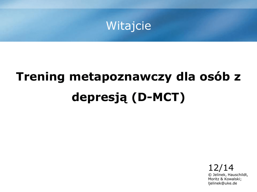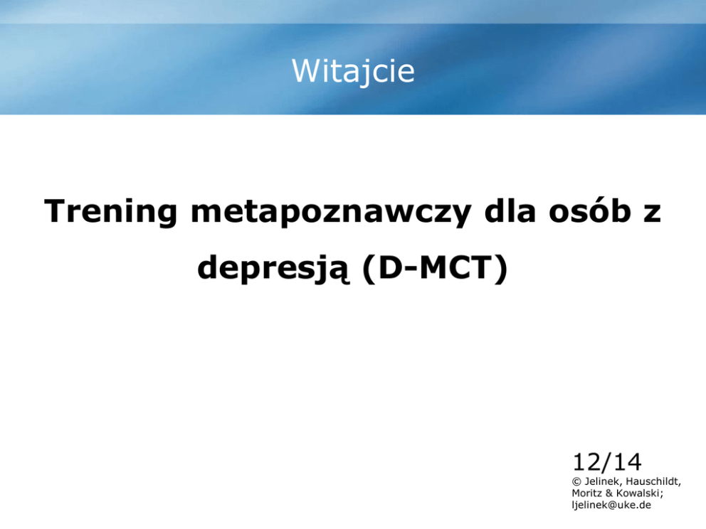 Witajcie Trening metapoznawczy dla osób z depresją (D-MCT) 12/14 © Jelinek, Hauschildt, Moritz & Kowalski; [email protected] D-MCT: Pozycja satelity Dzisiejszy temat Pamięć Zachowanie Depresja Denken und Myślenie i Schlussfolgern wnioskowanie Postrzeganie emocji Poczucie własnej wartości D-MCT temat: Myślenie i wnioskowanie 3 Jak „myślenie i wnioskowanie“ jest powiązane z depresją? Wiele osób z depresją przetwarza informacje w inny sposób niż reszta ludzi. Jak „myślenie i wnioskowanie“ jest powiązane z depresją? Wiele osób z depresją przetwarza informacje w inny sposób niż reszta ludzi. Te depresyjne schematy myślenia często nie mają oparcia w rzeczywistości albo bywają bardzo jednostronne (np. zawsze obwinianie się za porażki). Jak „myślenie i wnioskowanie“ jest powiązane z depresją? Wiele osób z depresją przetwarza informacje w inny sposób niż reszta ludzi. Te depresyjne schematy myślenia często nie mają oparcia w rzeczywistości albo bywają bardzo jednostronne (np. zawsze obwinianie się za porażki). Określamy to mianem „zniekształconego myślenia“, które może powodować powstawanie i utrzymywanie się depresji. Zniekształcenia myślenia w depresji zaadoptowane z Beck et al., 1979; Burns, 1989 1. Wyolbrzymienie lub Deprecjacja 1. Styl atrybucji Wymień spontanicznie … 2 rzeczy … … które się dzisiaj nie udały … które się dzisiaj udały Wymień spontanicznie … 2 rzeczy … … które się dzisiaj nie udały … które się dzisiaj udały Które łatwiej wymienić? Wymień spontanicznie … 2 rzeczy … … które się dzisiaj nie udały … które się dzisiaj udały Które łatwiej wymienić? Które bardziej zajmują twoje myśli? Wyolbrzymianie albo deprecjacja zaadoptowane z Beck et al., 1979; Burns, 1989 Wyolbrzymianie albo deprecjacja zaadoptowane z Beck et al., 1979; Burns, 1989 Wyolbrzymianie wielkości i powagi swoich błędów i problemów Wyolbrzymianie albo deprecjacja zaadoptowane z Beck et al., 1979; Burns, 1989 Wyolbrzymianie wielkości i powagi swoich błędów i problemów Deprecjacja swoich własnych umiejętności albo postrzeganie ich jako mało ważne Wyolbrzymianie albo deprecjacja zaadoptowane z Beck et al., 1979; Burns, 1989 Wyolbrzymianie wielkości i powagi swoich błędów i problemów Deprecjacja swoich własnych umiejętności albo postrzeganie ich jako mało ważne Zdarzyło ci się przeżywać coś takiego? Wyolbrzymianie lub deprecjacja Przykłady Zdarzenie Wyolbrzymienie lub deprecjacja Bardziej pomocna myśl Naprawiłeś sflaczałą oponę w swoim rowerze. ???Każdy może to zrobić. To nic specjalnego." "Jestem dobry w naprawianiu kół r ???koro nie potrzebuję w tym pomocy, to mogę też proponować pomoc innym. Tylna opona jest często trudna do naprawienia". Gubisz się podczas wyjazdu na wakacje. Musisz się zatrzymać i zapytać o drogę. ???Nie potrafię czytać map i mam słabe wyczucie kierunku. Bez pomocy kompletnie bym się zgubił. Pewnie mam alzheimera". ???Zajęło to więcej czasu, bo miałem problemy z odczytaniem mapy. To dobrze, że zapytałem o drogę kogoś, kto wiedział jak jechać. Pewnie dlatego dużo osób używa GPSów". Wyolbrzymianie lub deprecjacja Przykłady Zdarzenie Wyolbrzymienie lub deprecjacja Bardziej pomocna myśl Naprawiłeś sflaczałą oponę w swoim rowerze. „Każdy może to zrobić. To nic specjalnego”. "Jestem dobry w naprawianiu kół ???koro nie potrzebuję w tym pomocy, to mogę też proponować pomoc innym. Tylna opona jest często trudna do naprawienia". Gubisz się podczas wyjazdu na wakacje. Musisz się zatrzymać i zapytać o drogę. ???Nie potrafię czytać map i mam słabe wyczucie kierunku. Bez pomocy kompletnie bym się zgubił. Pewnie mam alzheimera". ???Zajęło to więcej czasu, bo miałem problemy z odczytaniem mapy. To dobrze, że zapytałem o drogę kogoś, kto wiedział jak jechać. Pewnie dlatego dużo osób używa GPSów". Wyolbrzymianie lub deprecjacja Przykłady Zdarzenie Wyolbrzymienie lub deprecjacja Bardziej pomocna myśl Naprawiłeś sflaczałą oponę w swoim rowerze. „Każdy może to zrobić. To nic specjalnego”. „Jestem dobry w naprawianiu kół rowerowych. Skoro nie potrzebuję w tym pomocy, to mogę też proponować pomoc innym. Tylna opona jest często trudna do naprawienia”. Gubisz się podczas wyjazdu na wakacje. Musisz się zatrzymać i zapytać o drogę. ???Nie potrafię czytać map i mam słabe wyczucie kierunku. Bez pomocy kompletnie bym się zgubił. Pewnie mam alzheimera". ???Zajęło to więcej czasu, bo miałem problemy z odczytaniem mapy. To dobrze, że zapytałem o drogę kogoś, kto wiedział jak jechać. Pewnie dlatego dużo osób używa GPSów". Wyolbrzymianie lub deprecjacja Przykłady Zdarzenie Wyolbrzymienie lub deprecjacja Bardziej pomocna myśl Naprawiłeś sflaczałą oponę w swoim rowerze. „Każdy może to zrobić. To nic specjalnego”. „Jestem dobry w naprawianiu kół rowerowych. Skoro nie potrzebuję w tym pomocy, to mogę też proponować pomoc innym. Tylna opona jest często trudna do naprawienia”. Gubisz się podczas wyjazdu na wakacje. Musisz się zatrzymać i zapytać o drogę. „Nie potrafię czytać map i mam słabe wyczucie kierunku. Bez pomocy kompletnie bym się zgubił. Pewnie mam alzheimera”. ???Zajęło to więcej czasu, bo miałem problemy z odczytaniem mapy. To dobrze, że zapytałem o drogę kogoś, kto wiedział jak jechać. Pewnie dlatego dużo osób używa GPSów". Wyolbrzymianie lub deprecjacja Przykłady Zdarzenie Wyolbrzymienie lub deprecjacja Bardziej pomocna myśl Naprawiłeś sflaczałą oponę w swoim rowerze. „Każdy może to zrobić. To nic specjalnego”. „Jestem dobry w naprawianiu kół rowerowych. Skoro nie potrzebuję w tym pomocy, to mogę też proponować pomoc innym. Tylna opona jest często trudna do naprawienia”. Gubisz się podczas wyjazdu na wakacje. Musisz się zatrzymać i zapytać o drogę. „Nie potrafię